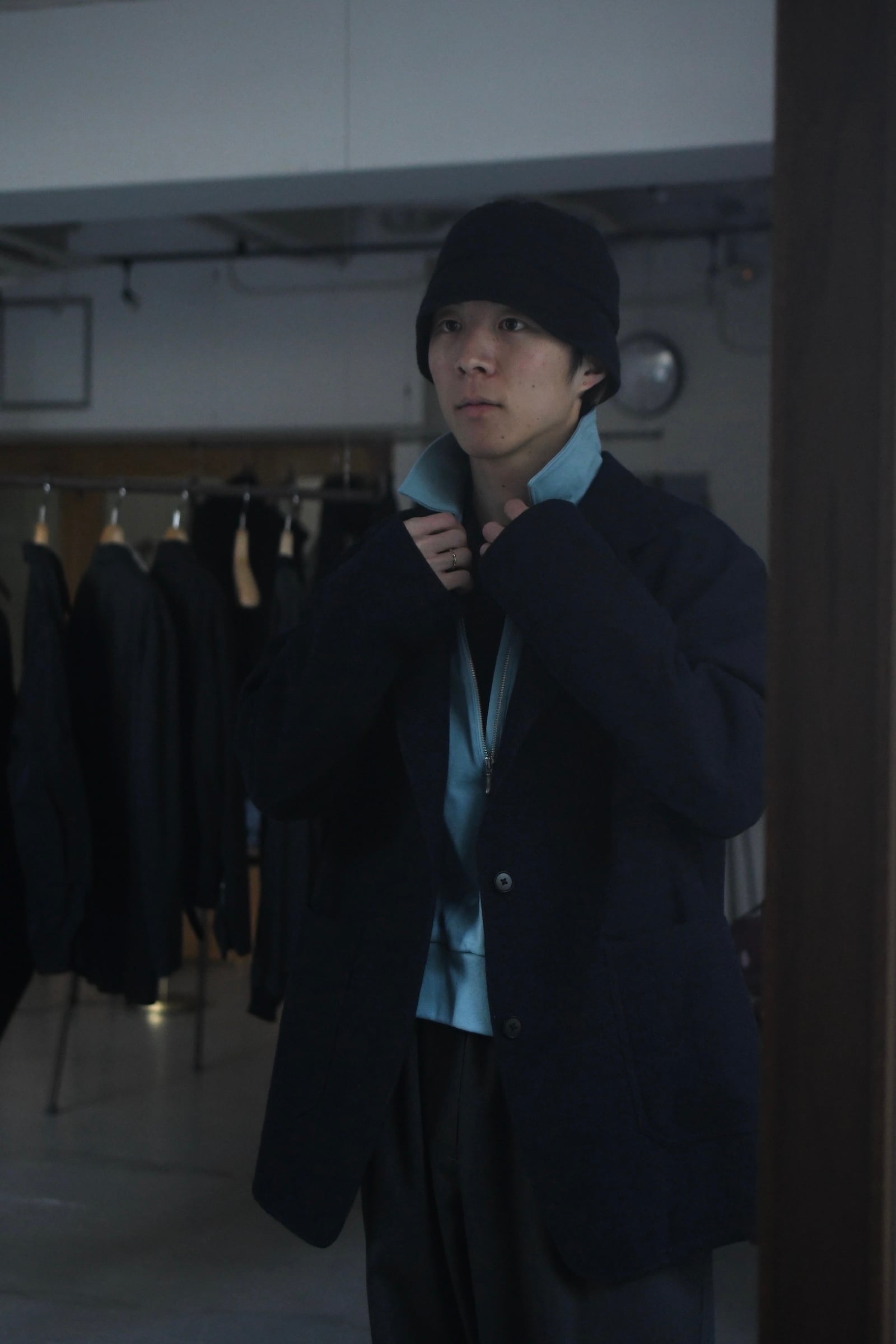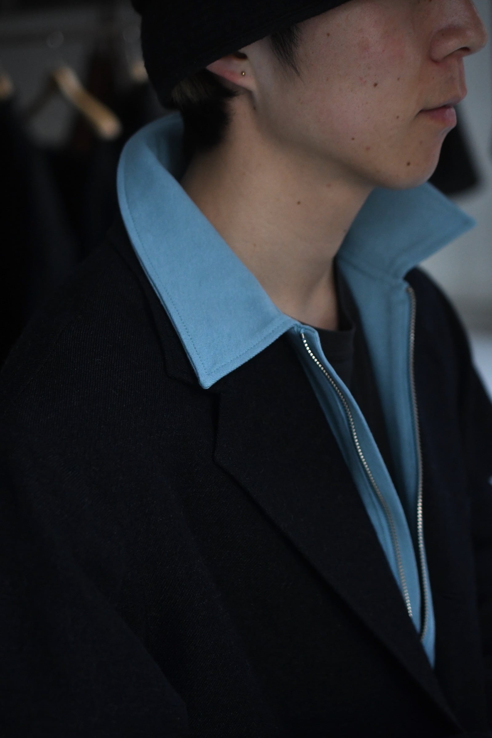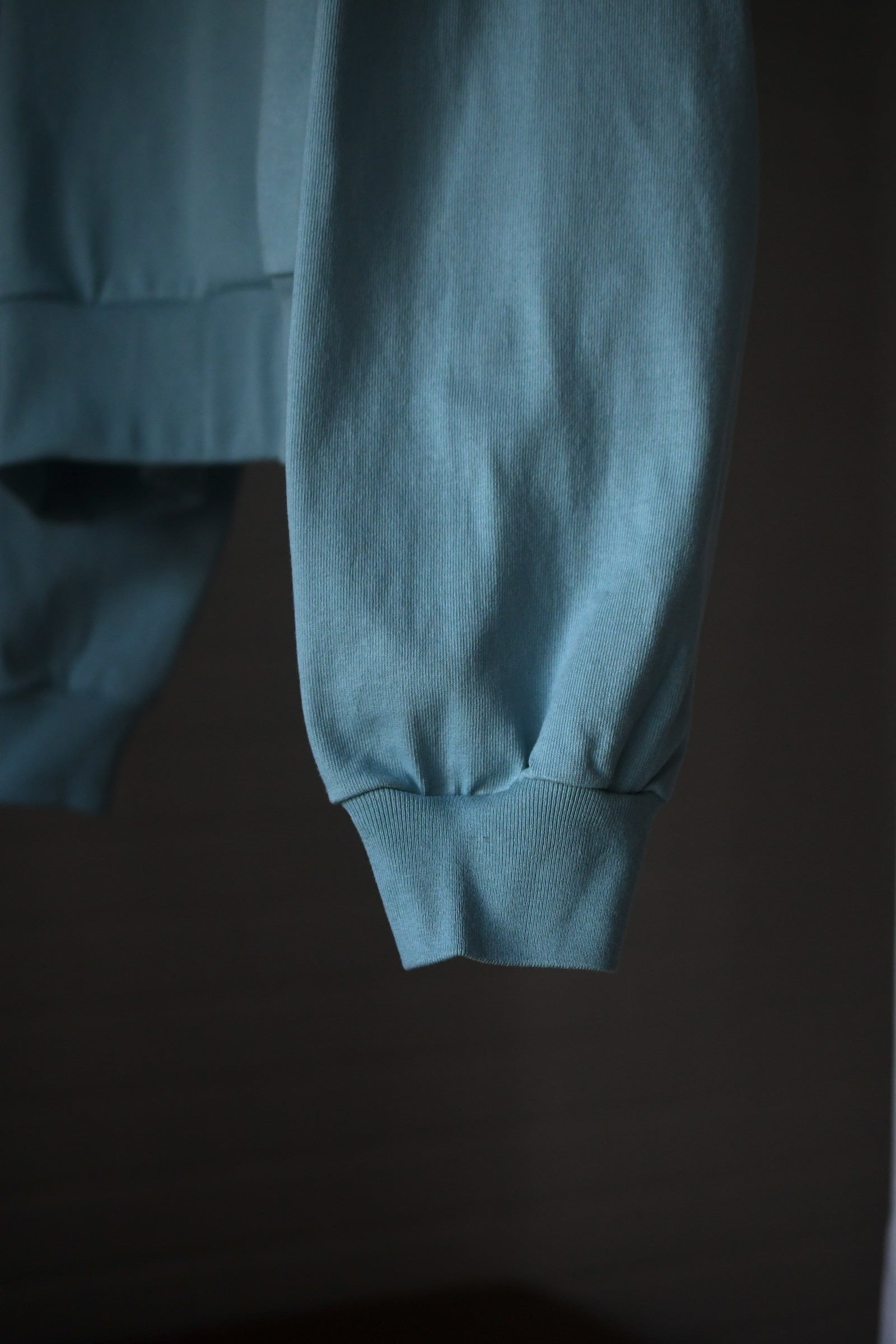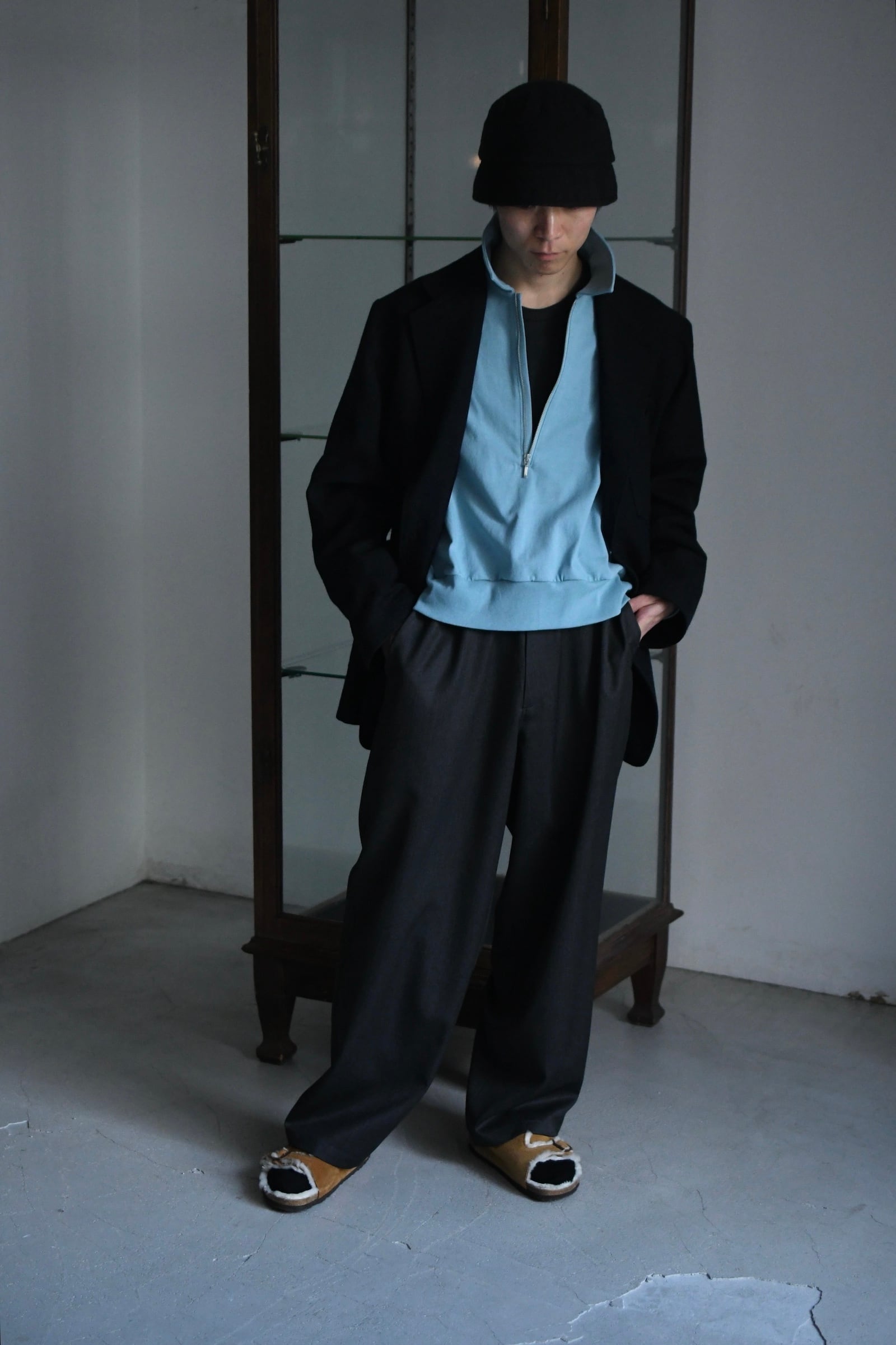 身頃の半分まで深く設けられたZIP。綺麗な襟付け。収まりの良いリラックスフィット。そして新鮮さがありながらも全く嫌味には感じない絶妙な丈感。ブランドのシグネチャーモデルであるZIP LONG SLEEVEPOLOが、カットソー以上スウェット未満のちょうど良い肉感の鹿子素材を纏いながら新たなシルエットで誕生した。D.GRAYは少し褪せたような風合いを持たせ、青と黄色は前衛過ぎない柔らかい印象感を伴わせている為に、単体で着る楽しさとインナーで映える外しの面白さを上手く両立させている。そして襟は接ぎの無い美しい仕上がりで、深いZIPを留めているステッチ位置は縫製可能な限界ギリギリのラインをかなり細い運針で走らせており、フロントの開閉に左右されず常に綺麗な存在感を放つ。是非ともこの1着だからこそ活きるスタイリングを、自分なりの世界観で楽しんで頂きたい。