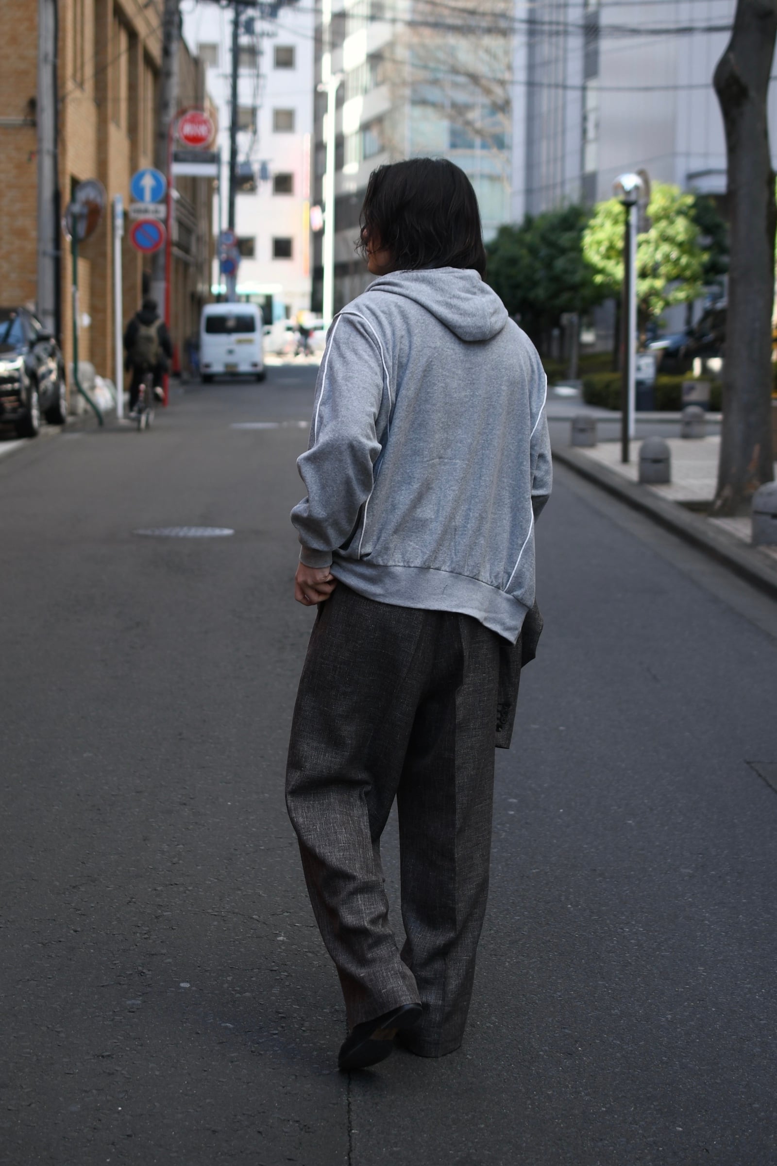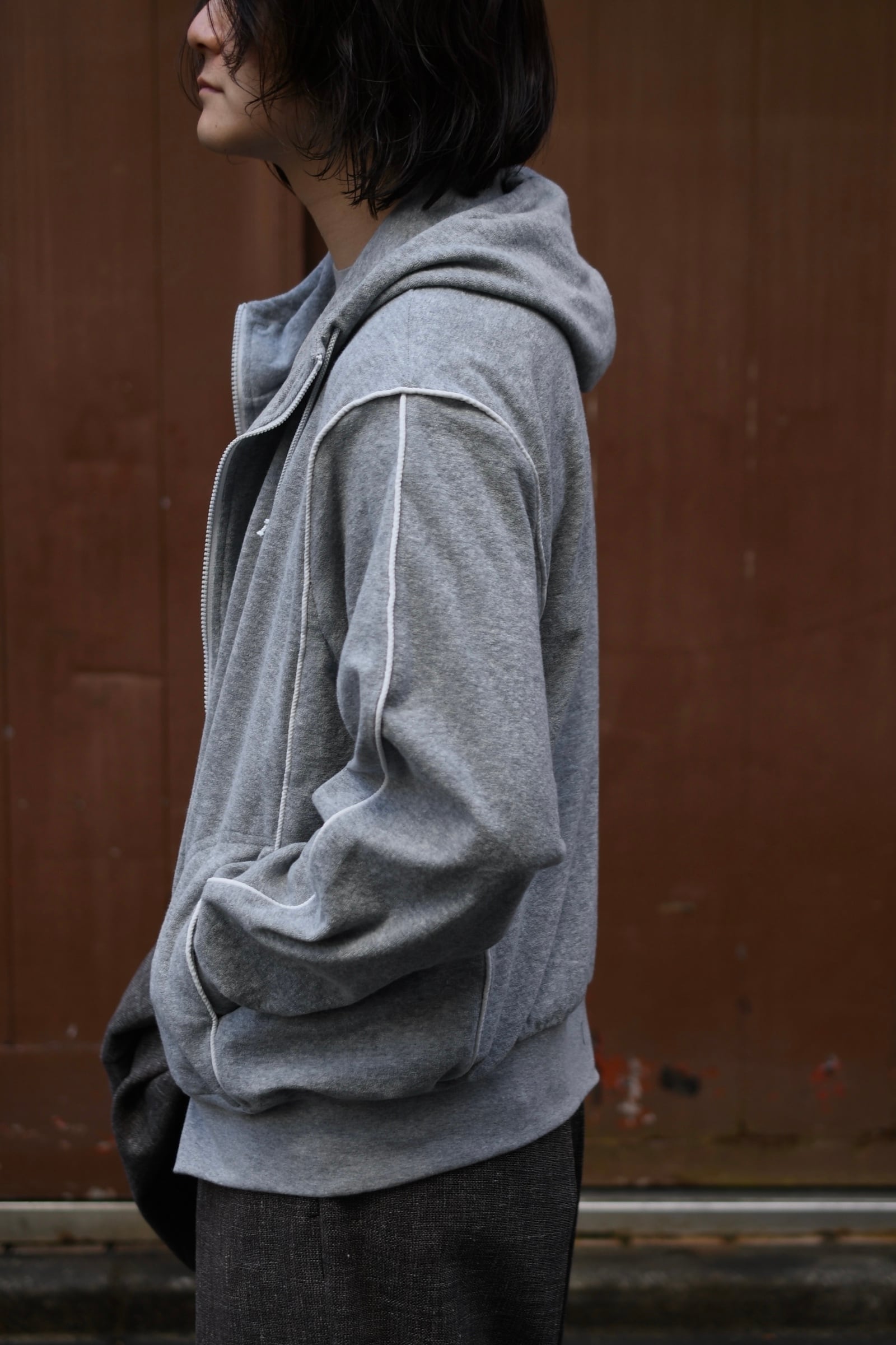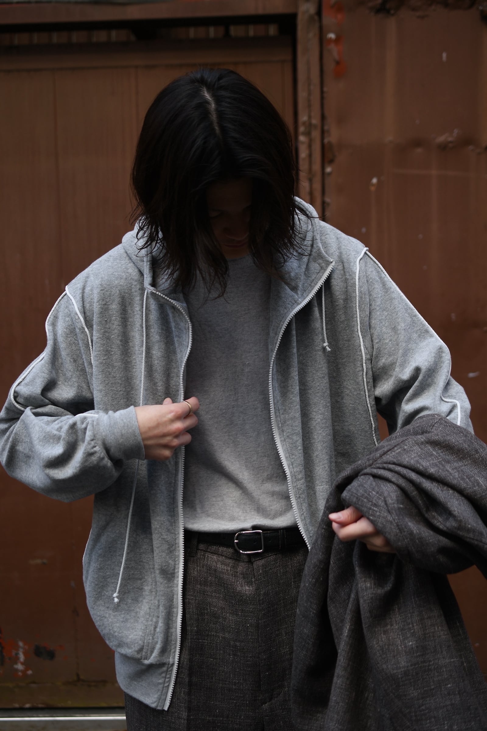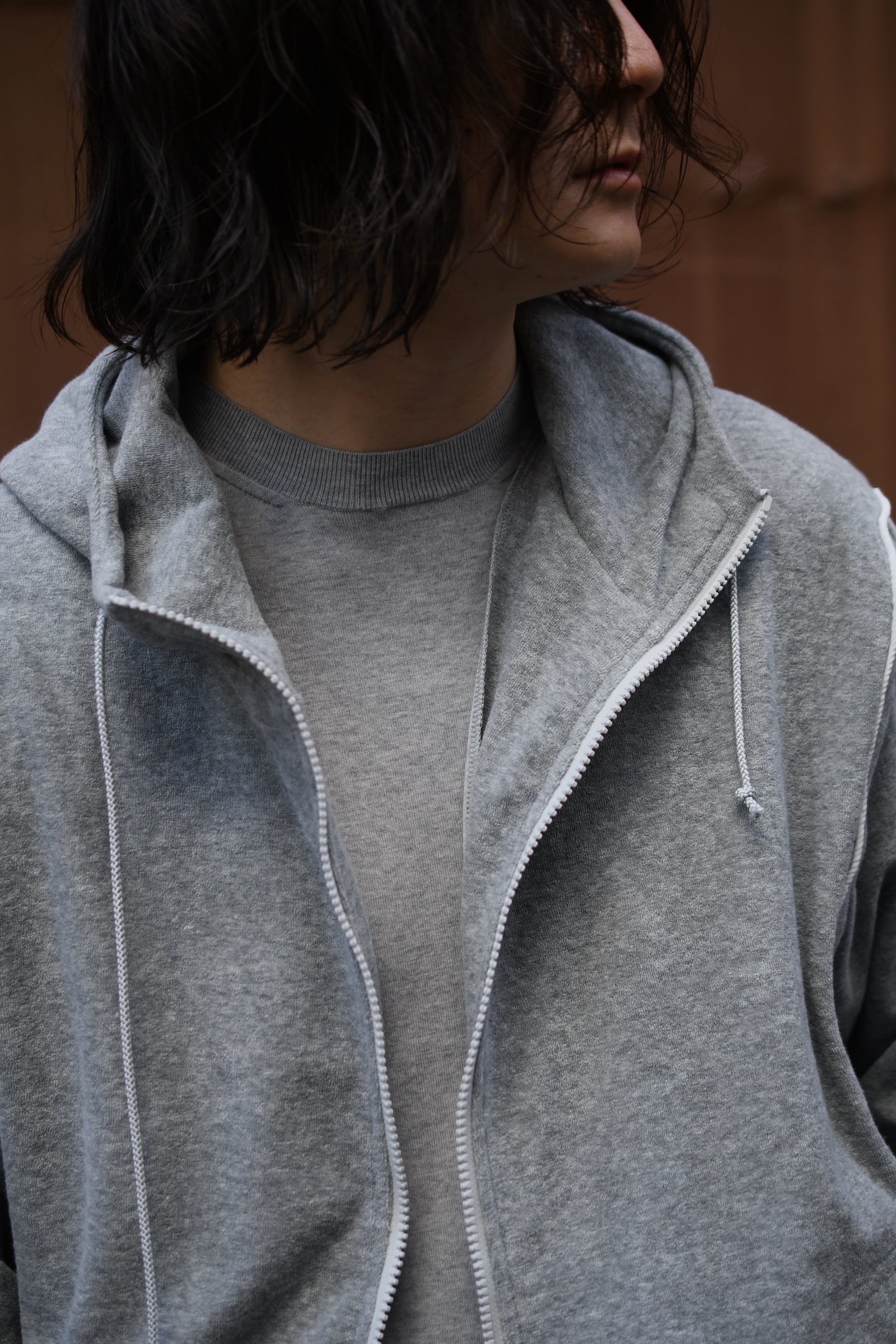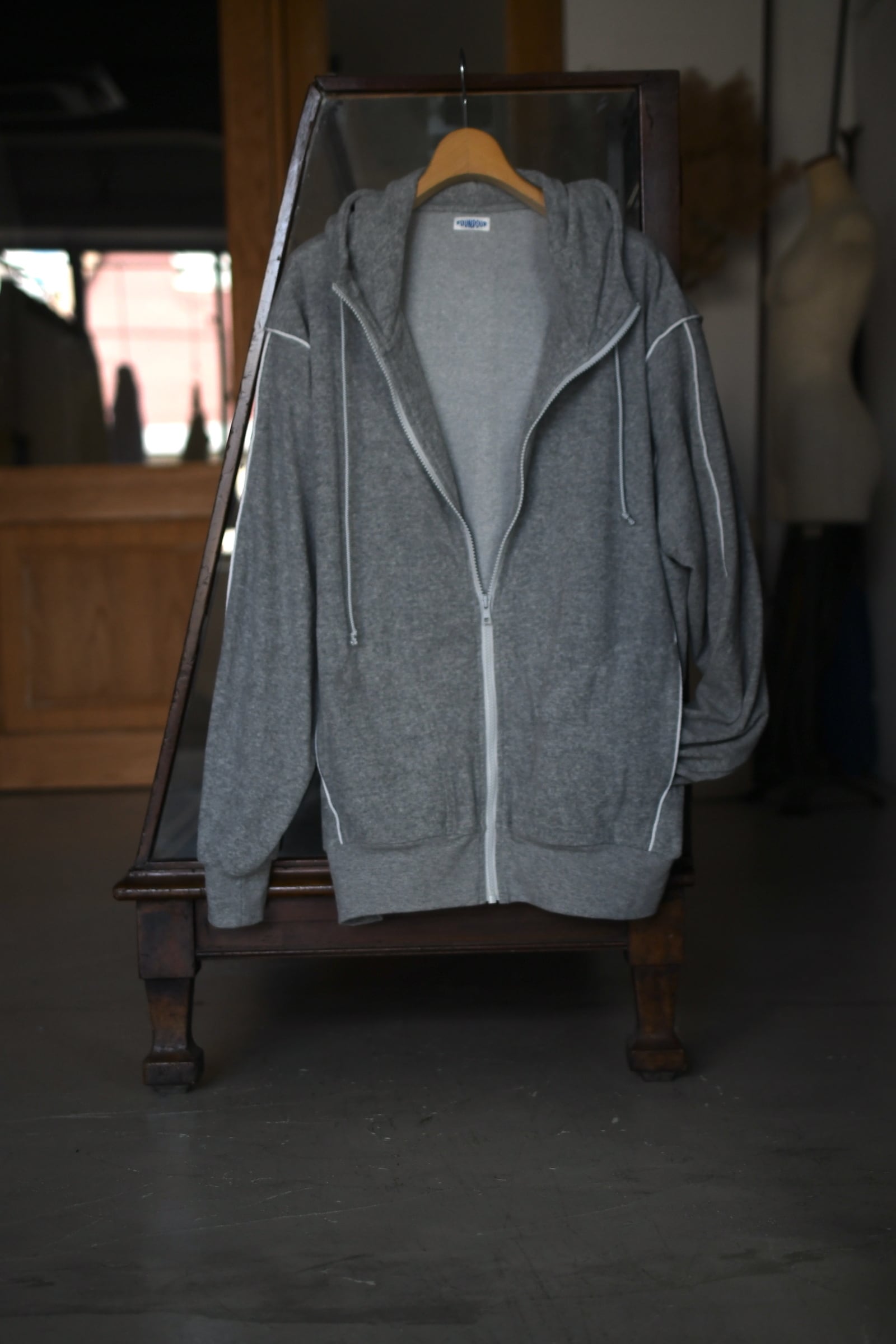 1970年代のスポーツブランド”N”が生産していたアレをリファレンスし、丁度いい距離感で気負わずに羽織れるフルジップのフーディを制作。表情のあるパイル素材は素肌の上でも心地良く、そして綿主体である為に軽く蒸れづらい魅力を持つ。また上品な光沢感があり、ラフになり過ぎずデニムやスラックスとも抜群の相性を魅せる。シルエットは程よくゆとりを持たせた設計で、身体のラインを拾わず、それでいてだらしなく見えないバランスに整えられている。インナーにシャツやカットソーを重ねても収まりは良く、素材感やカラーリングを含めて総合的に見てもスタイリングの汎用性は申し分無いだろう。デザイナー金子氏が『日常の延長線にちょうどいい、大人のトラックブルゾン』と語るように、様々な洋服と掛け合わせて起こる化学反応を是非堪能して貰えたら。