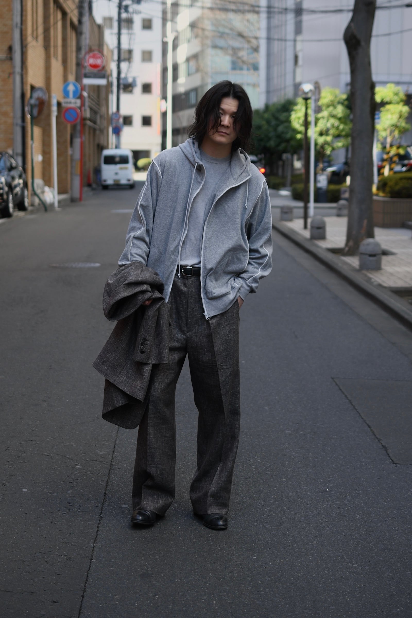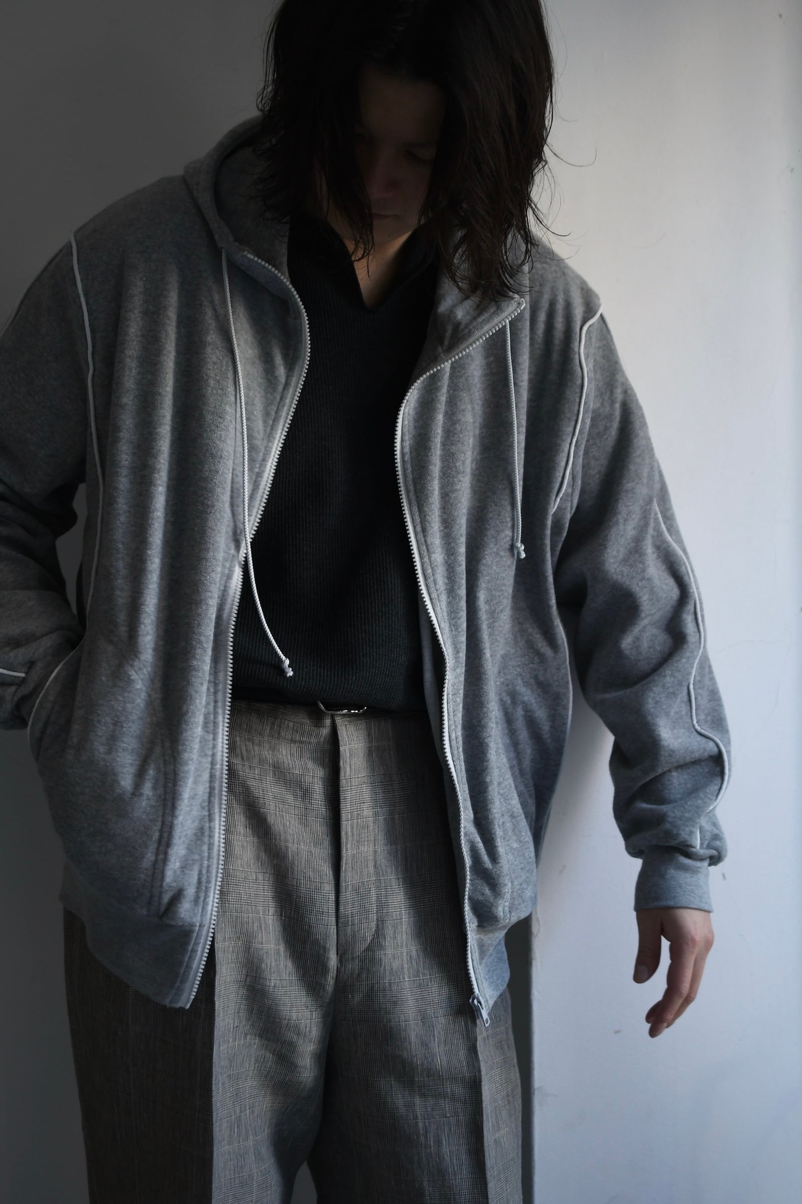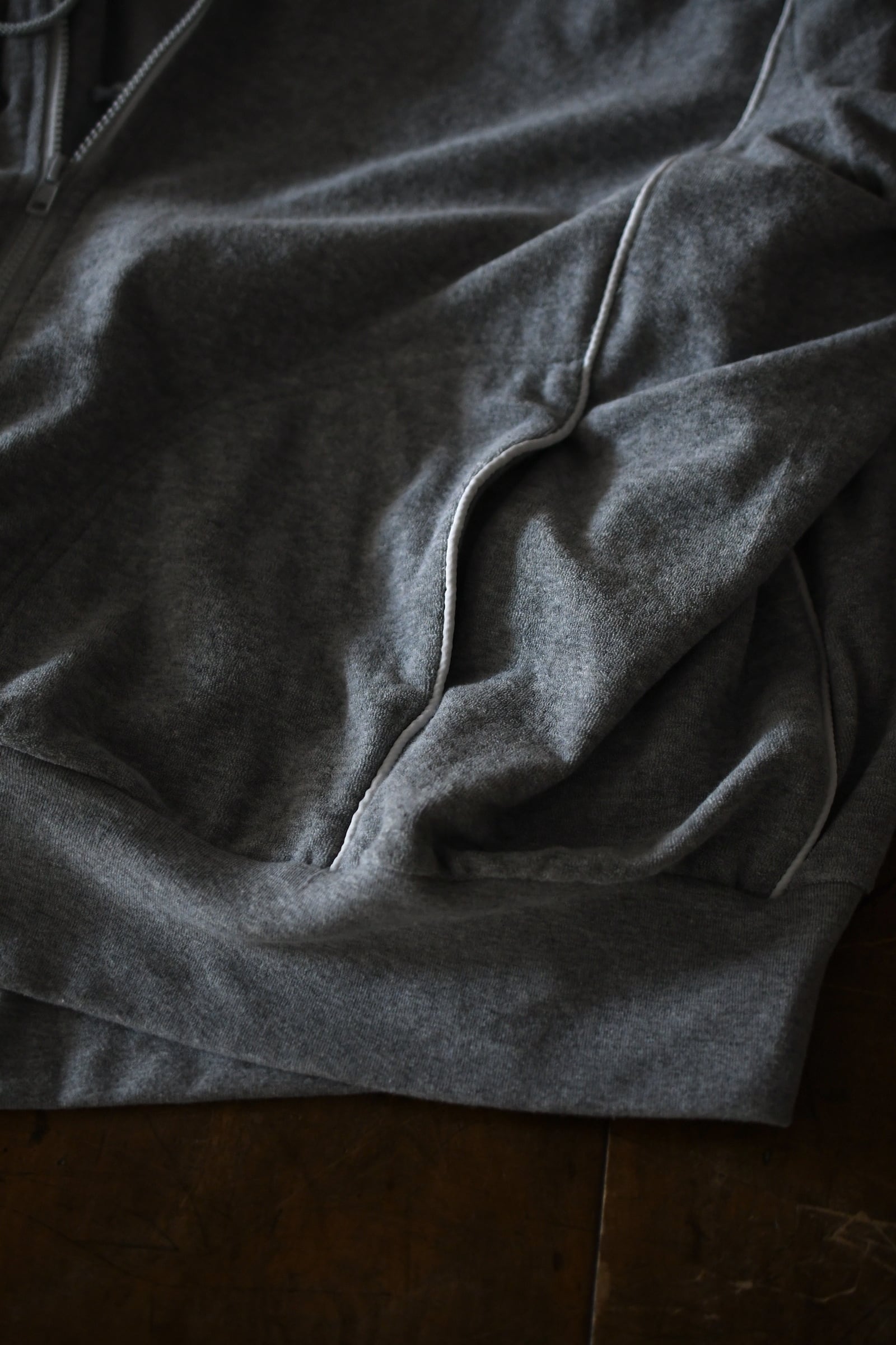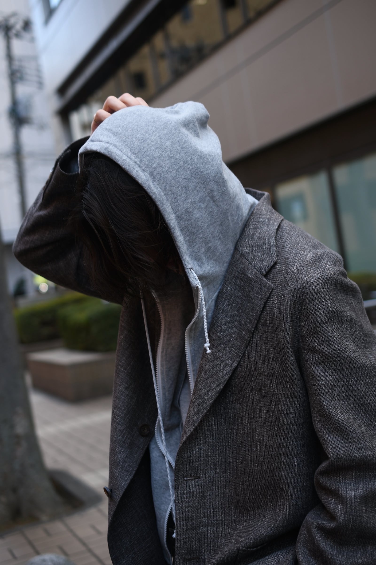 1970年代のスポーツブランド”N”が生産していたアレをリファレンスし、丁度いい距離感で気負わずに羽織れるフルジップのフーディを制作。表情のあるパイル素材は素肌の上でも心地良く、そして綿主体である為に軽く蒸れづらい魅力を持つ。また上品な光沢感があり、ラフになり過ぎずデニムやスラックスとも抜群の相性を魅せる。シルエットは程よくゆとりを持たせた設計で、身体のラインを拾わず、それでいてだらしなく見えないバランスに整えられている。インナーにシャツやカットソーを重ねても収まりは良く、素材感やカラーリングを含めて総合的に見てもスタイリングの汎用性は申し分無いだろう。デザイナー金子氏が『日常の延長線にちょうどいい、大人のトラックブルゾン』と語るように、様々な洋服と掛け合わせて起こる化学反応を是非堪能して貰えたら。