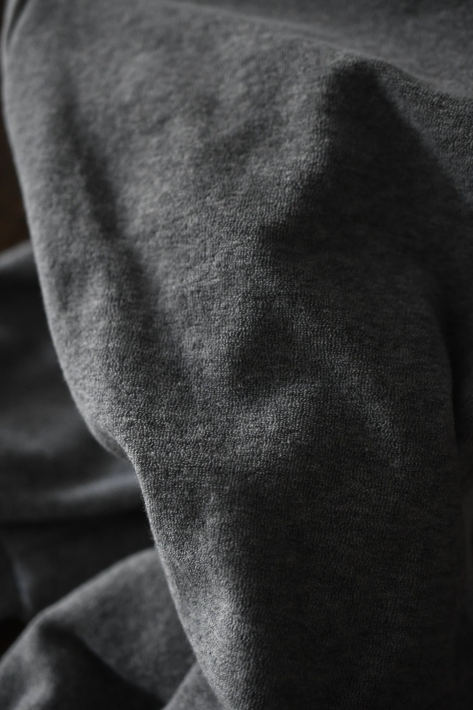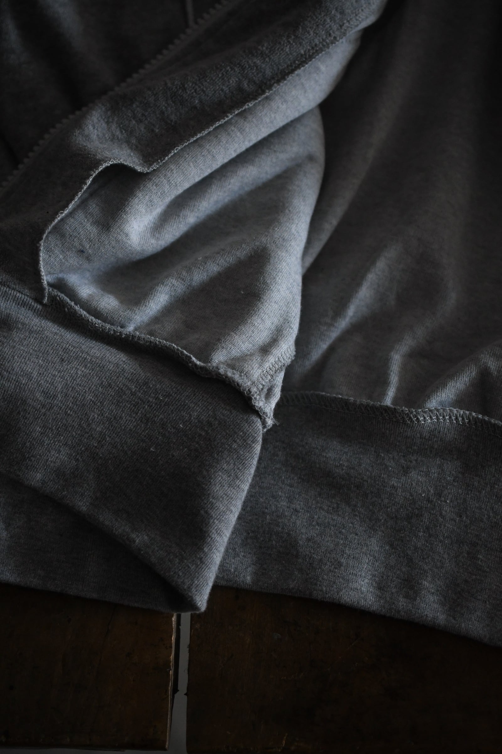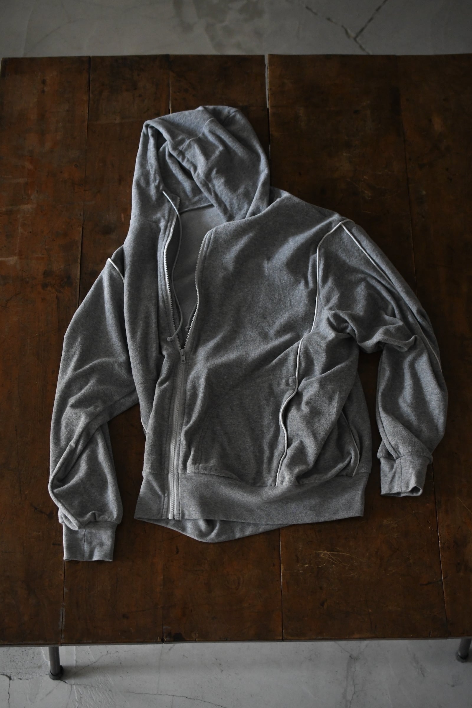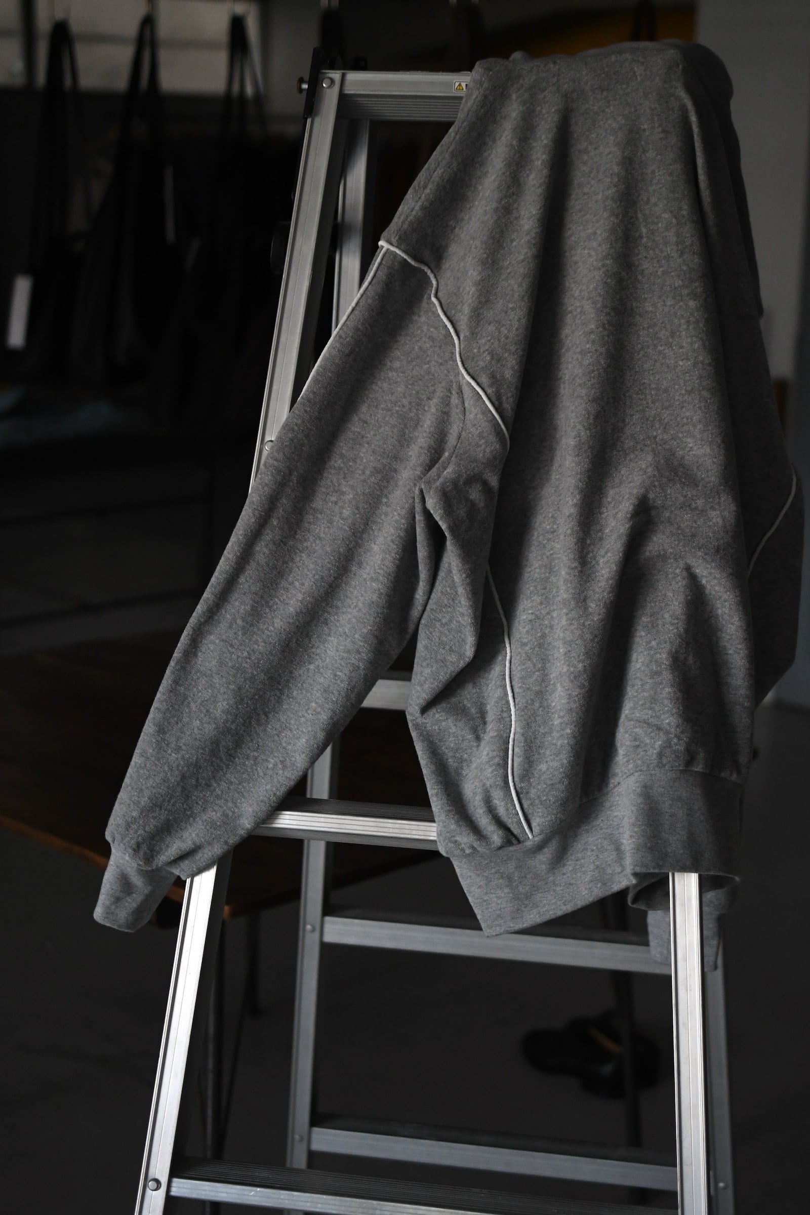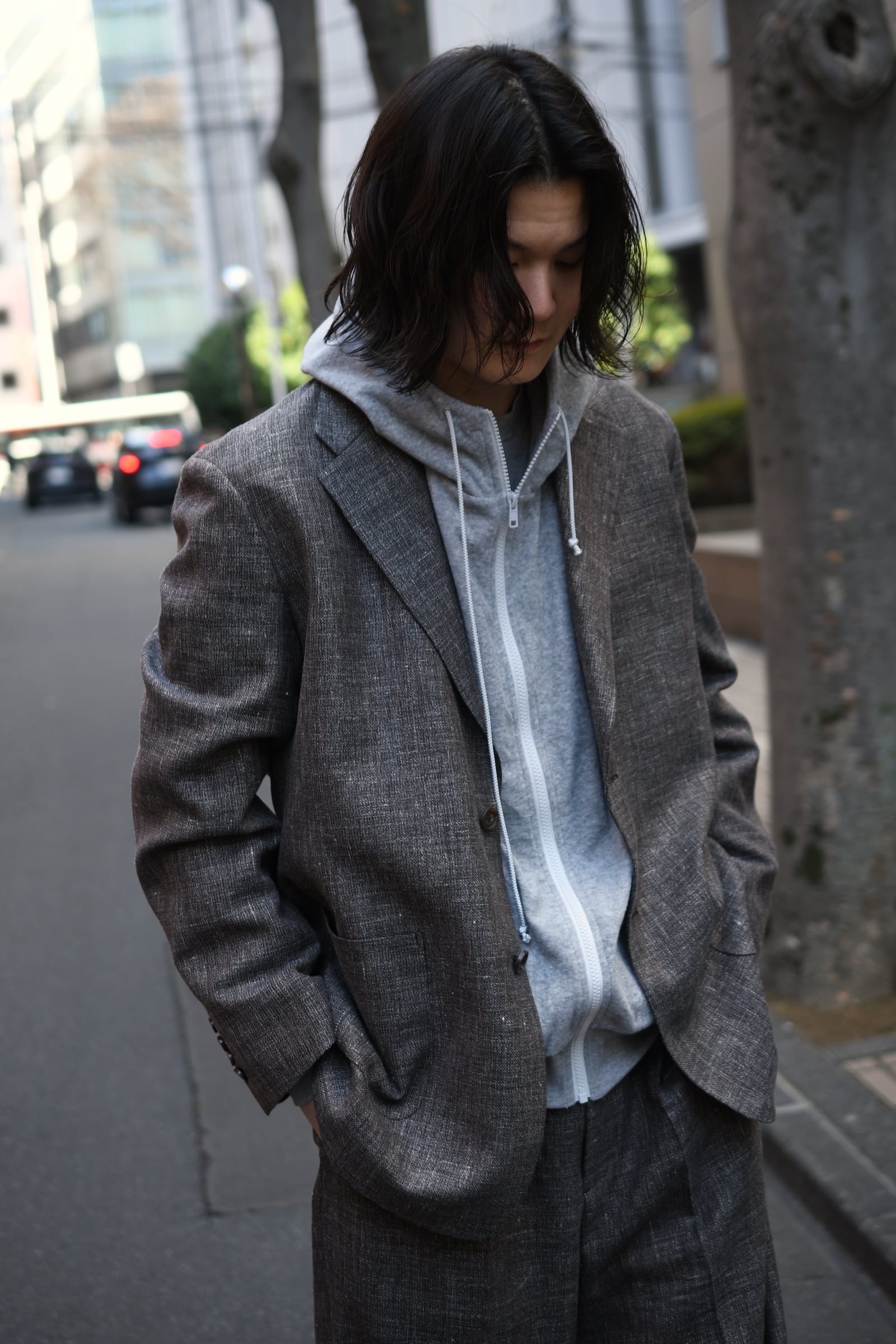 1970年代のスポーツブランド”N”が生産していたアレをリファレンスし、丁度いい距離感で気負わずに羽織れるフルジップのフーディを制作。表情のあるパイル素材は素肌の上でも心地良く、そして綿主体である為に軽く蒸れづらい魅力を持つ。また上品な光沢感があり、ラフになり過ぎずデニムやスラックスとも抜群の相性を魅せる。シルエットは程よくゆとりを持たせた設計で、身体のラインを拾わず、それでいてだらしなく見えないバランスに整えられている。インナーにシャツやカットソーを重ねても収まりは良く、素材感やカラーリングを含めて総合的に見てもスタイリングの汎用性は申し分無いだろう。デザイナー金子氏が『日常の延長線にちょうどいい、大人のトラックブルゾン』と語るように、様々な洋服と掛け合わせて起こる化学反応を是非堪能して貰えたら。