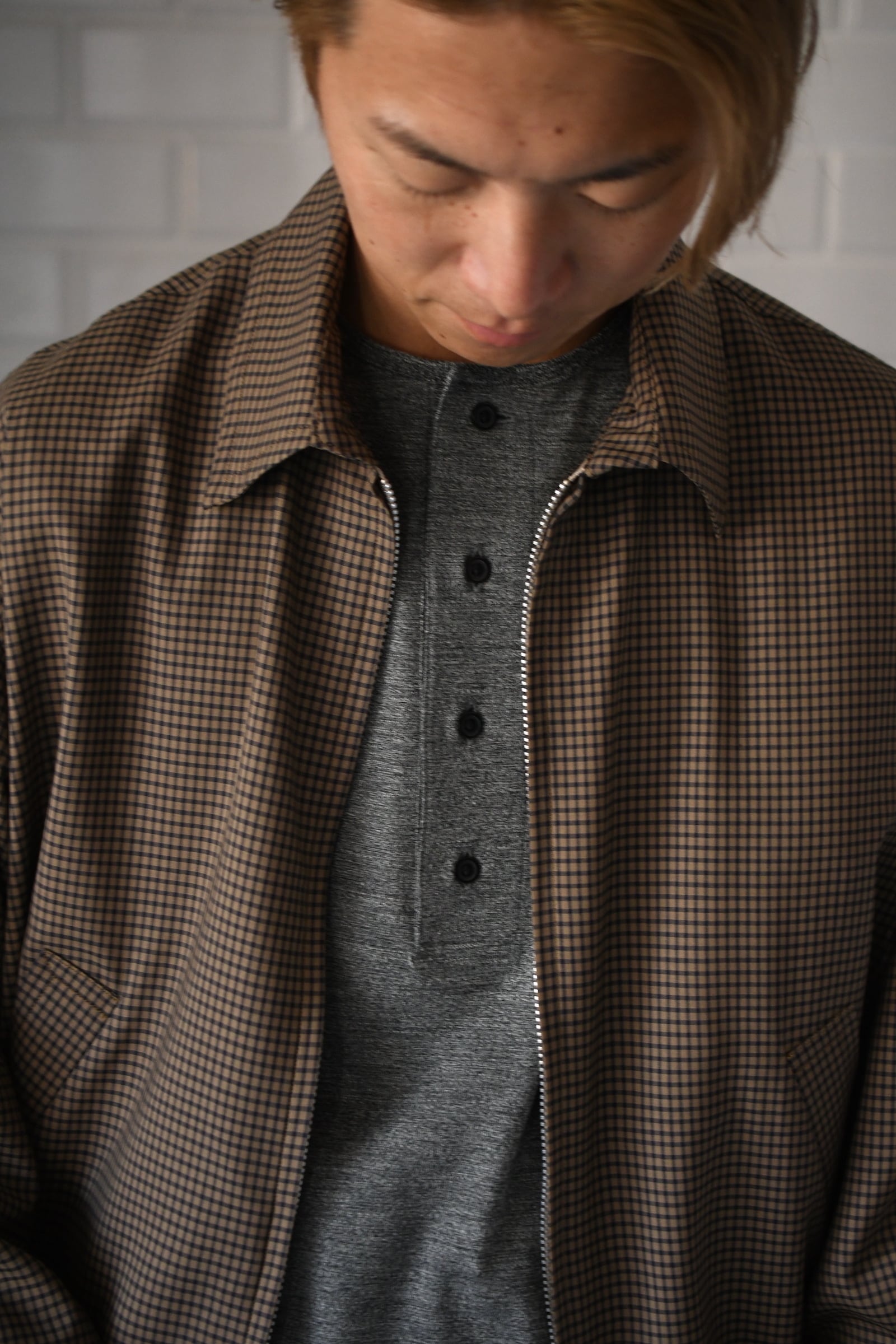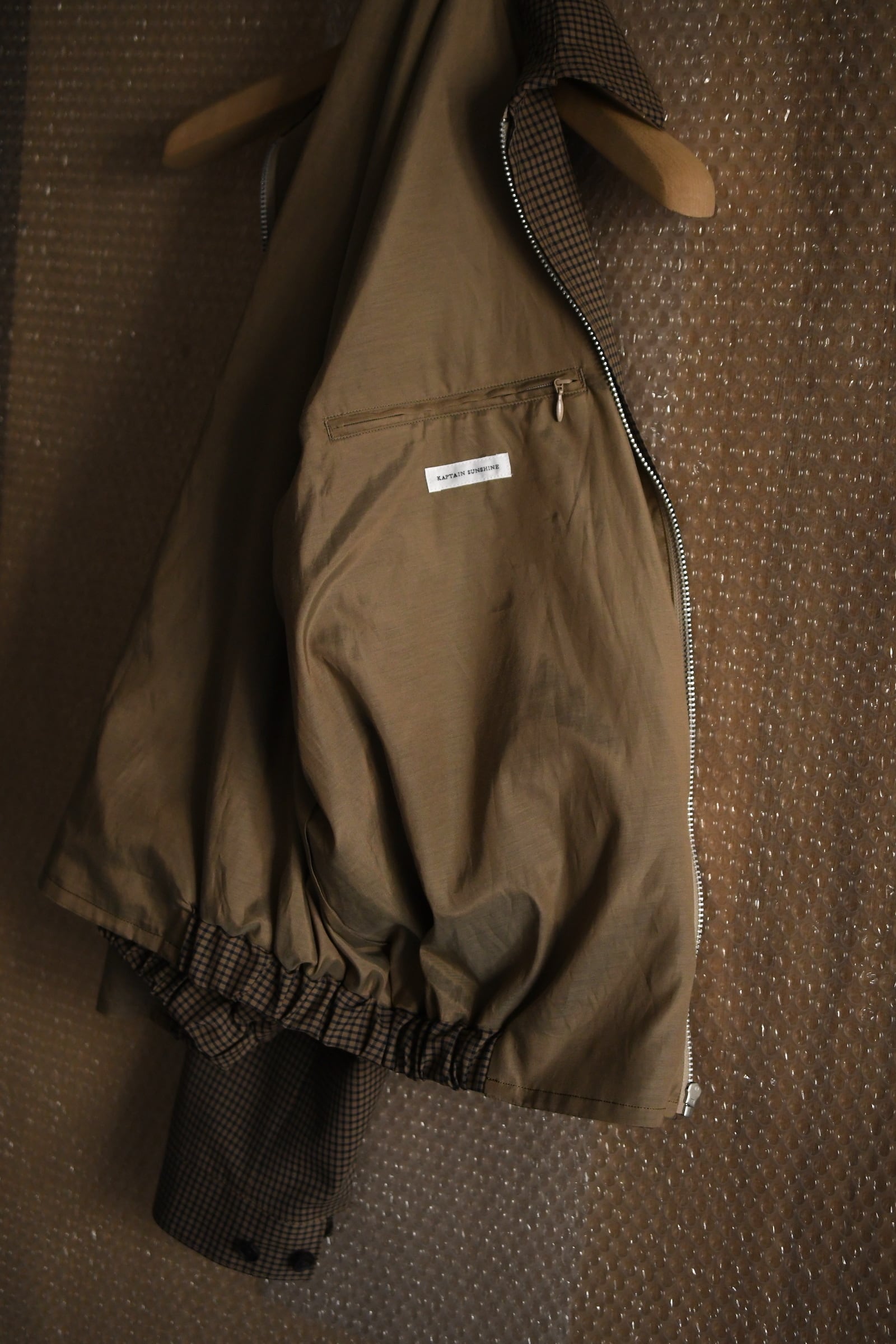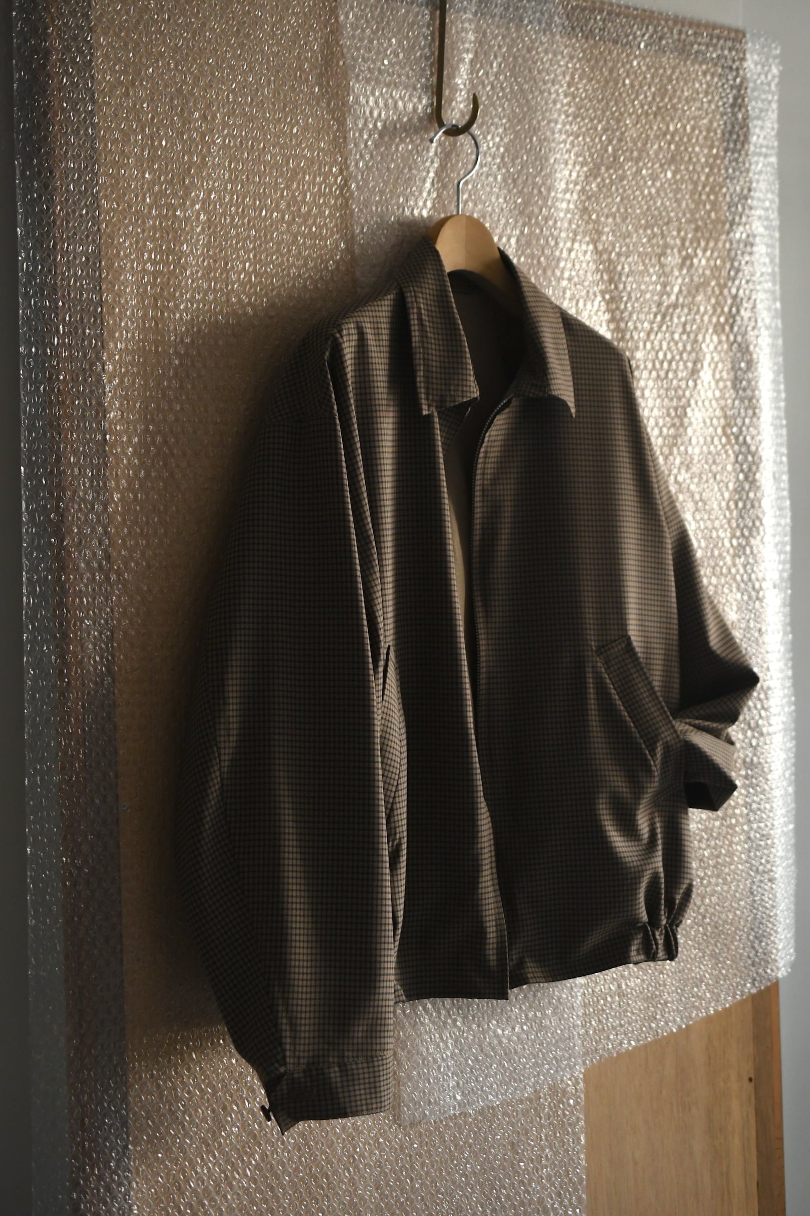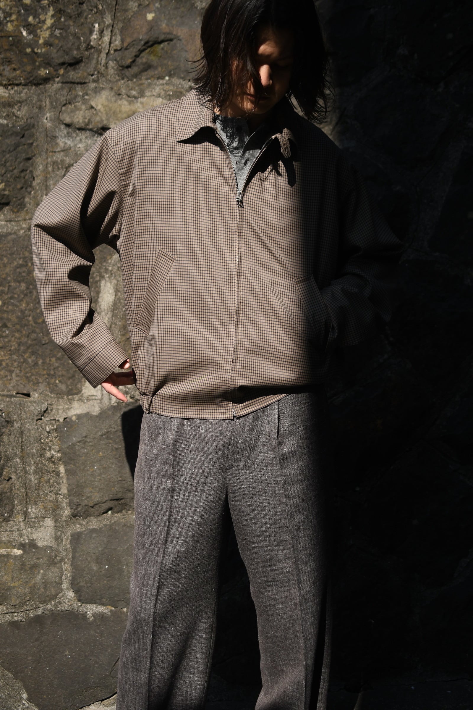 KAPTAIN SUSHINEが新たに手掛けた生地は、上質で滑らかな Super140’s 相当の極細ウールを用いて織り上げたサマーウール。サラッとした優しい質感、そして優れた防臭性や通気性、シワになりづらい耐久性をも備えており、春〜初秋までの長い期間で頼りになる嬉しいスペックを有している。更にウォッシャブル加工も施されており、高温多湿な日本の夏季に於いて強く求めたい ”気兼ねなく洗える”という魅力もそこにはしっかり秘められていた。今作はその魅惑的な生地をブルゾンに落とし込み、「シャツ感覚で着れる羽織り」を製作。薄手で軽やかだが、レーヨン混の裏地によって程よい厚みがあり、その嫌味の無い絶妙なボリューム感が羽織りモノとしての存在感を上手く確立してくれている。そして、優しい色合いだが不思議と渋さを感じる好配色の細やかな格子柄は、春夏という爽快な季節にキリッとした落ち着きを与えるかのようにモダンな空気感を纏わせており、より大人な1着へ仕上げてくれている。