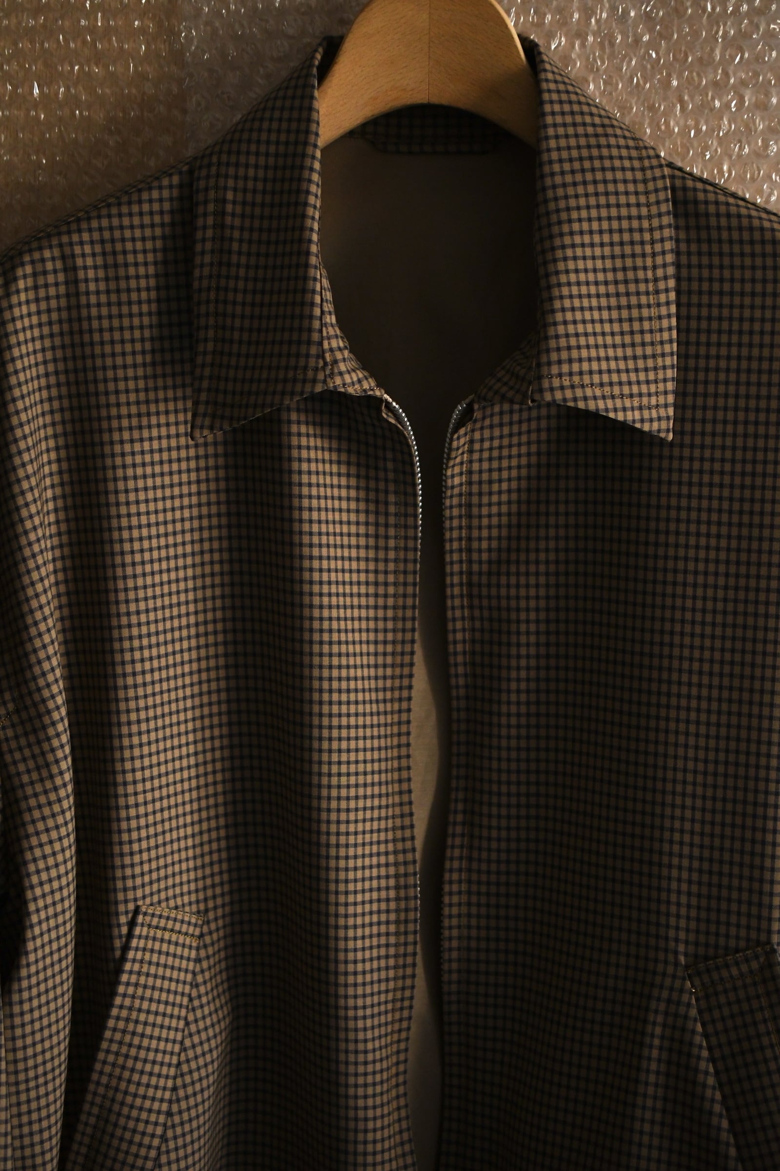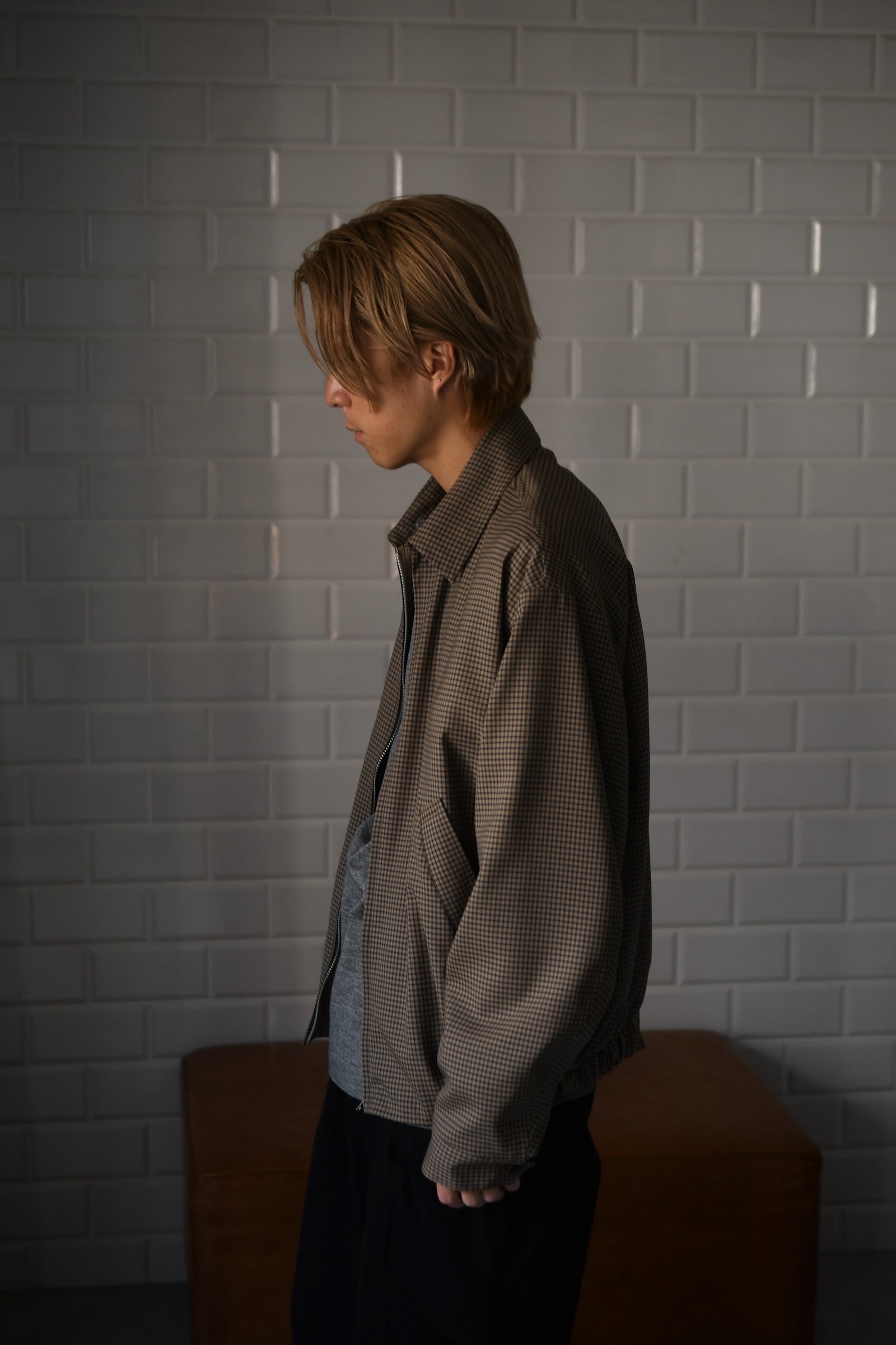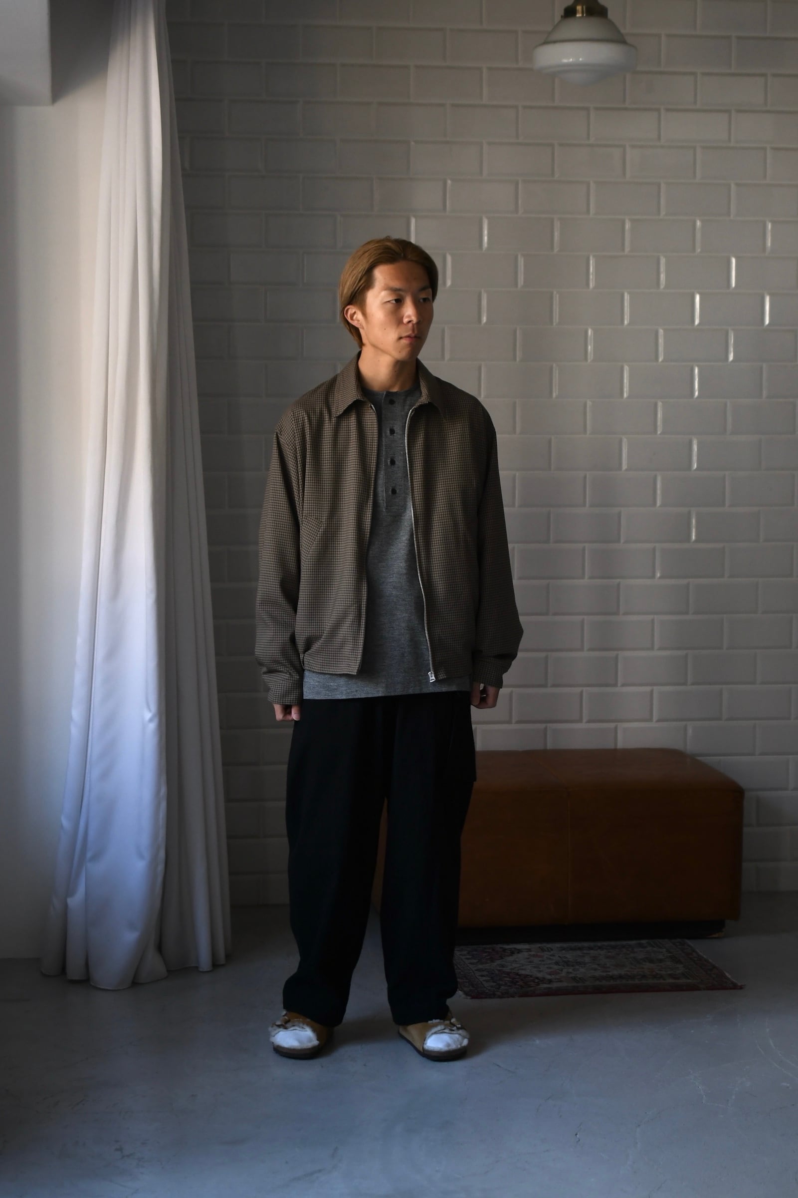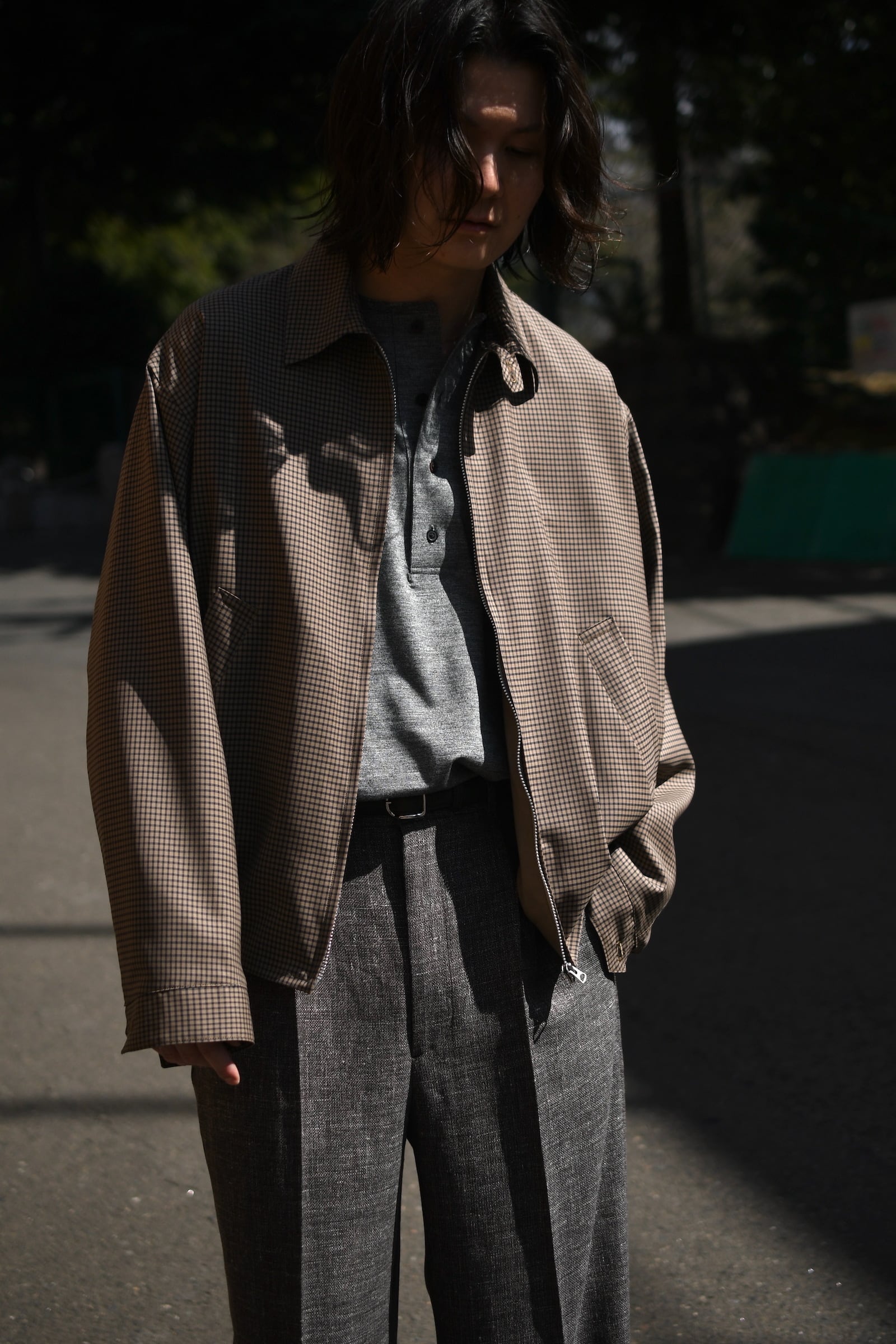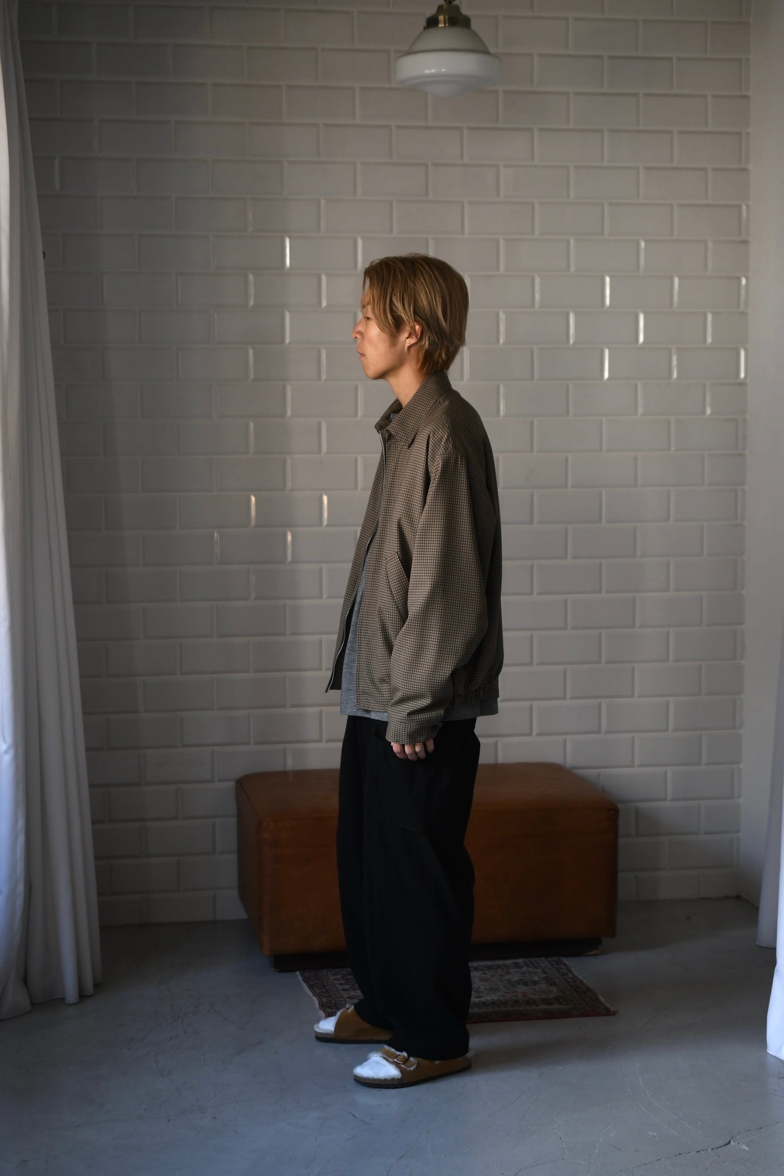 KAPTAIN SUSHINEが新たに手掛けた生地は、上質で滑らかな Super140’s 相当の極細ウールを用いて織り上げたサマーウール。サラッとした優しい質感、そして優れた防臭性や通気性、シワになりづらい耐久性をも備えており、春〜初秋までの長い期間で頼りになる嬉しいスペックを有している。更にウォッシャブル加工も施されており、高温多湿な日本の夏季に於いて強く求めたい ”気兼ねなく洗える”という魅力もそこにはしっかり秘められていた。今作はその魅惑的な生地をブルゾンに落とし込み、「シャツ感覚で着れる羽織り」を製作。薄手で軽やかだが、レーヨン混の裏地によって程よい厚みがあり、その嫌味の無い絶妙なボリューム感が羽織りモノとしての存在感を上手く確立してくれている。そして、優しい色合いだが不思議と渋さを感じる好配色の細やかな格子柄は、春夏という爽快な季節にキリッとした落ち着きを与えるかのようにモダンな空気感を纏わせており、より大人な1着へ仕上げてくれている。