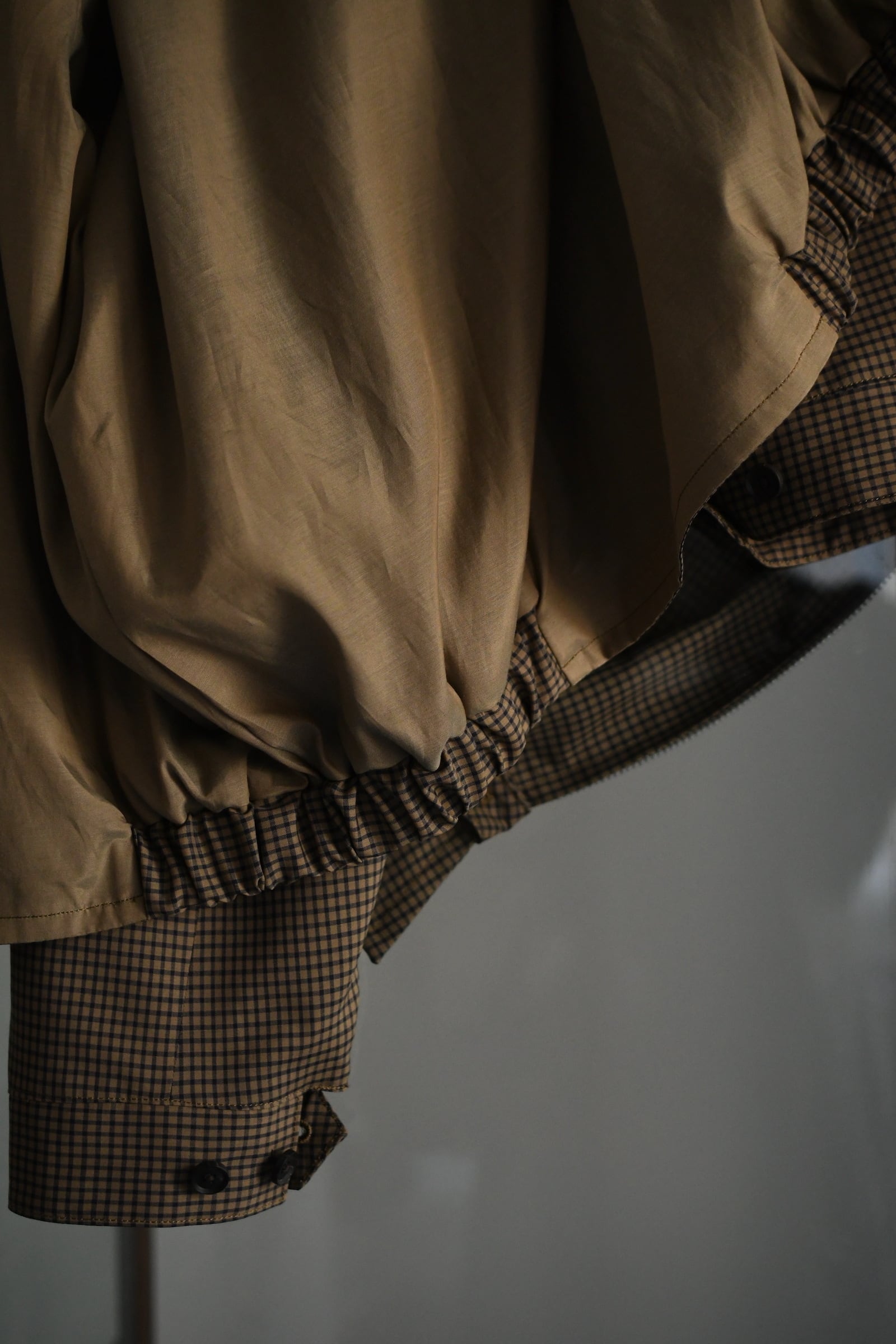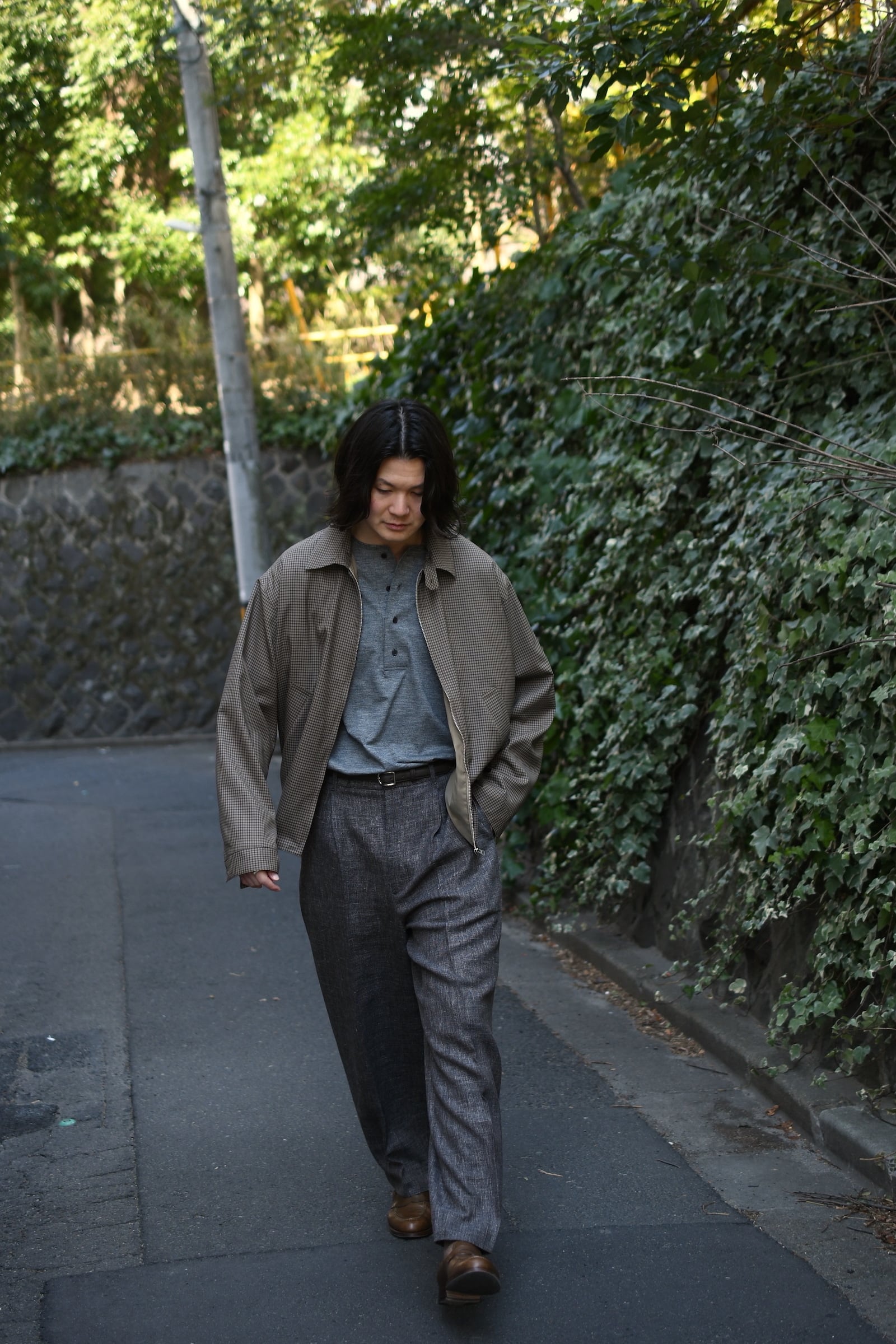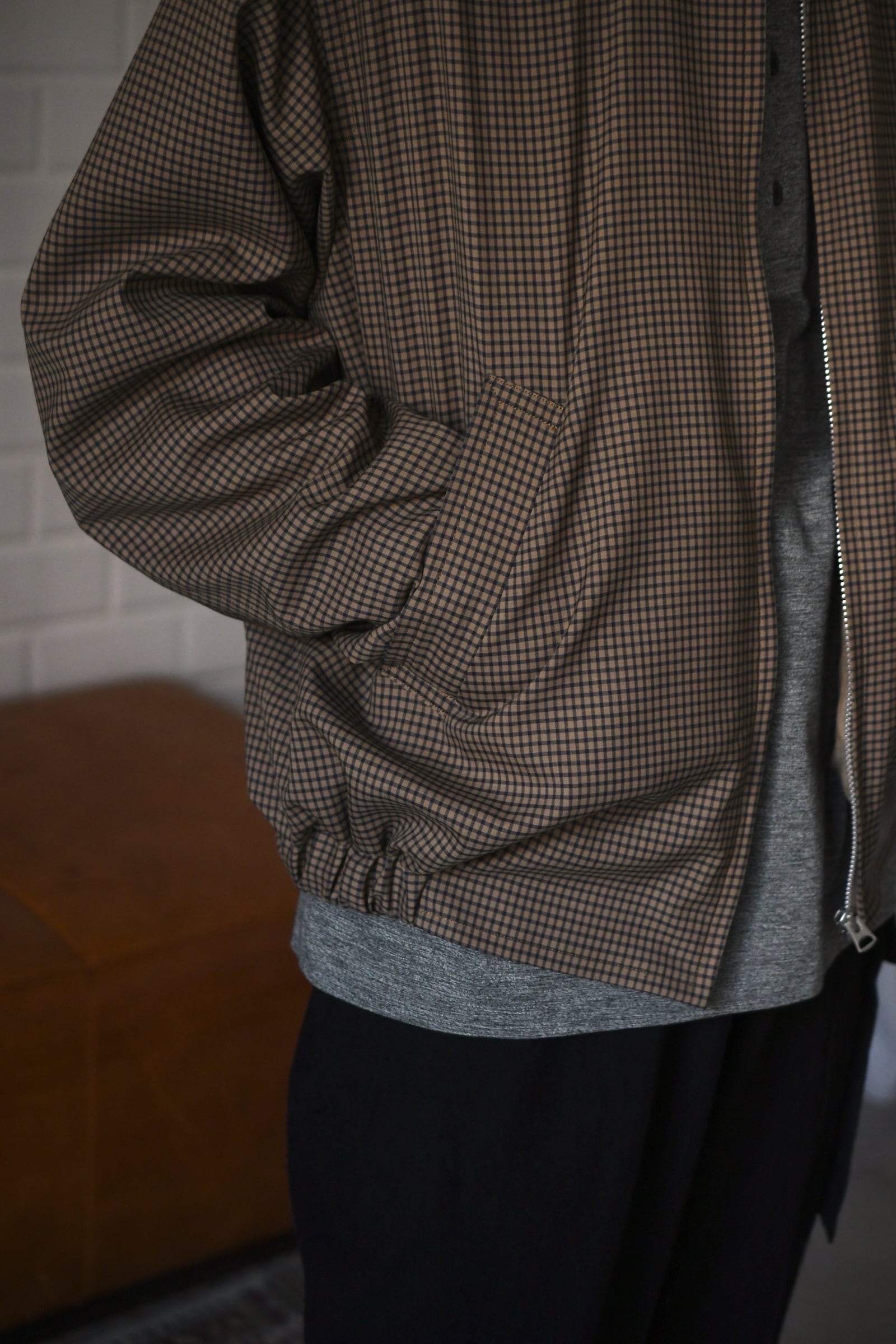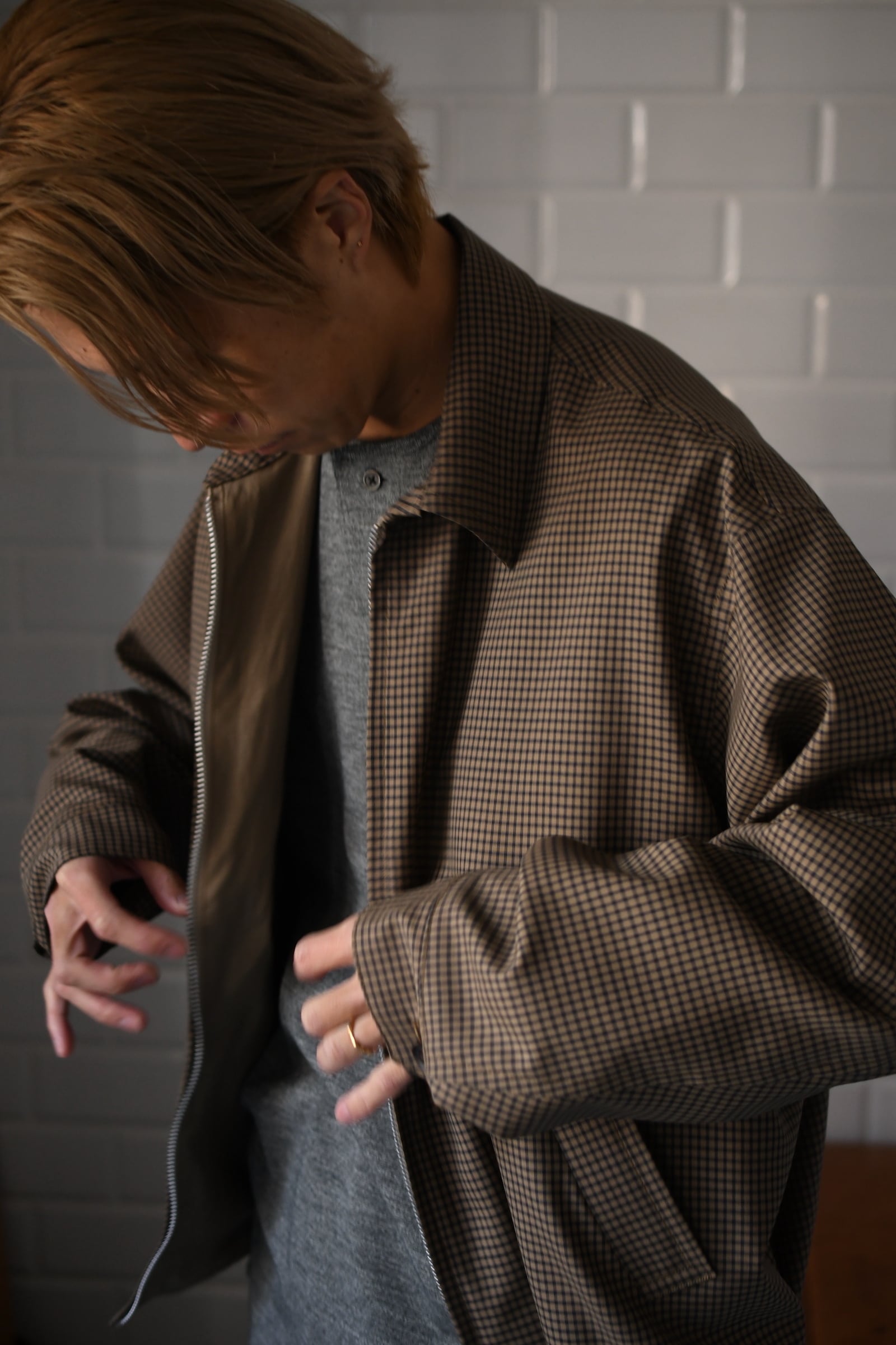KAPTAIN SUSHINEが新たに手掛けた生地は、上質で滑らかな Super140’s 相当の極細ウールを用いて織り上げたサマーウール。サラッとした優しい質感、そして優れた防臭性や通気性、シワになりづらい耐久性をも備えており、春〜初秋までの長い期間で頼りになる嬉しいスペックを有している。更にウォッシャブル加工も施されており、高温多湿な日本の夏季に於いて強く求めたい ”気兼ねなく洗える”という魅力もそこにはしっかり秘められていた。今作はその魅惑的な生地をブルゾンに落とし込み、「シャツ感覚で着れる羽織り」を製作。薄手で軽やかだが、レーヨン混の裏地によって程よい厚みがあり、その嫌味の無い絶妙なボリューム感が羽織りモノとしての存在感を上手く確立してくれている。そして、優しい色合いだが不思議と渋さを感じる好配色の細やかな格子柄は、春夏という爽快な季節にキリッとした落ち着きを与えるかのようにモダンな空気感を纏わせており、より大人な1着へ仕上げてくれている。