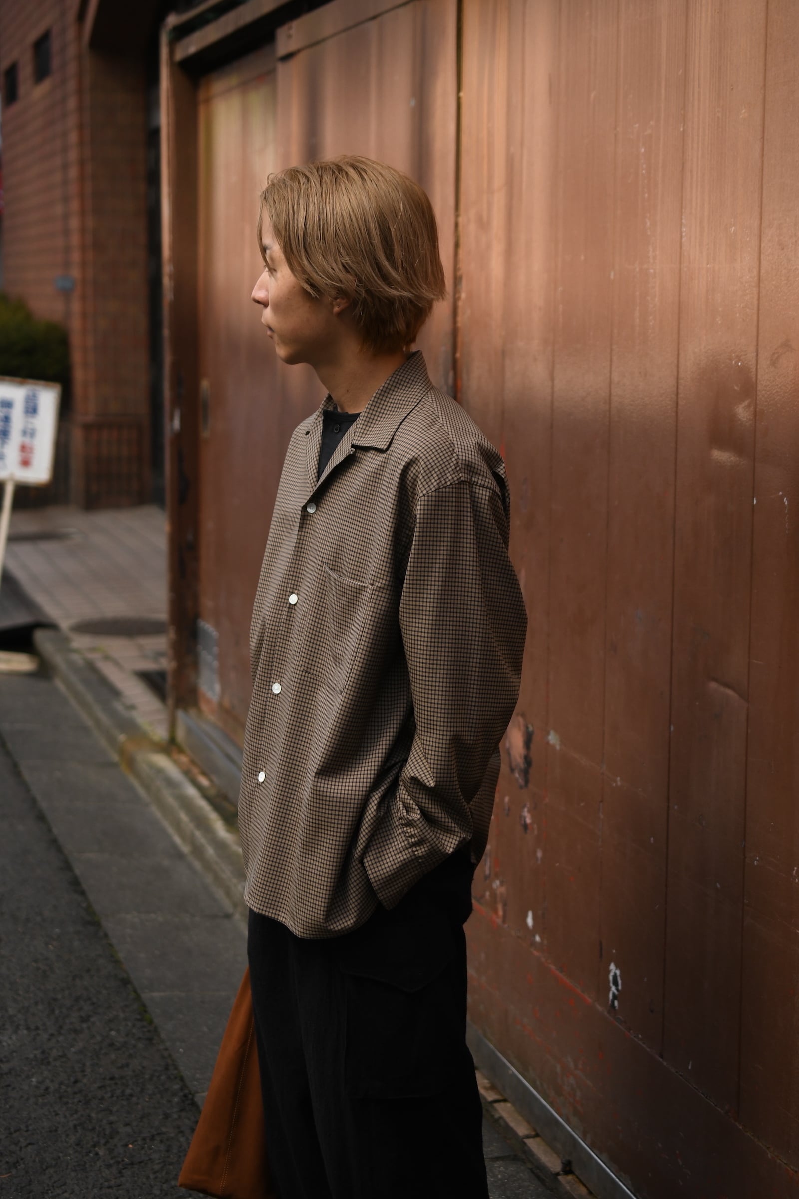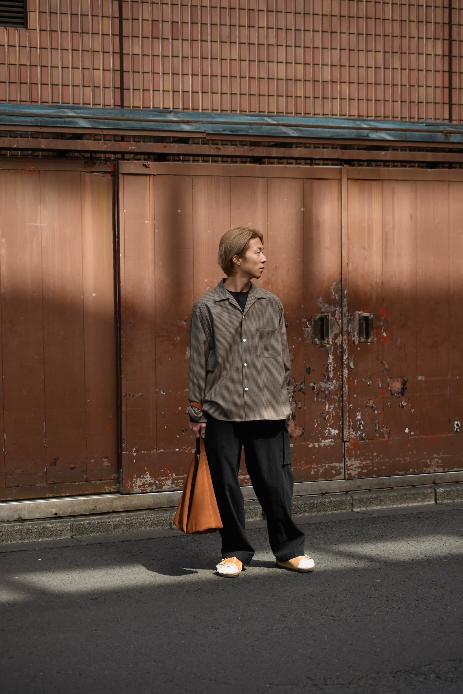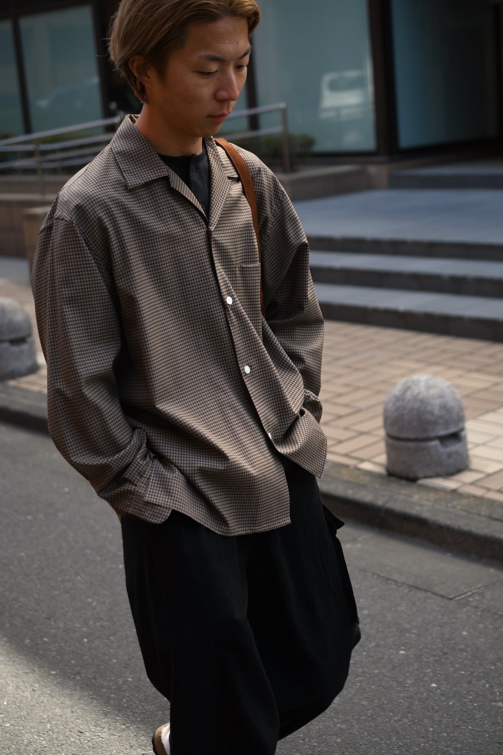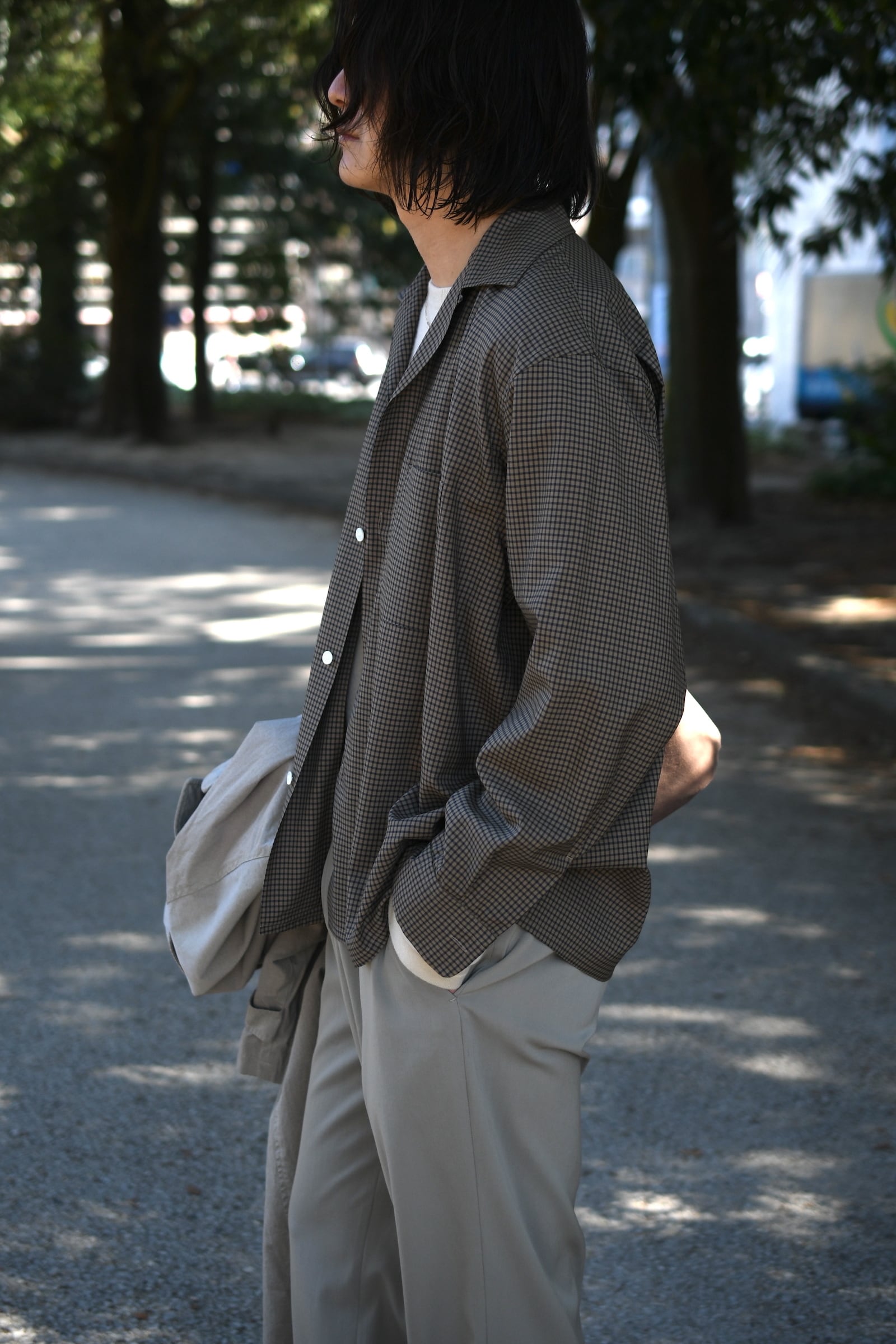 KAPTAIN SUSHINEが新たに手掛けた生地は、上質で滑らかな Super140’s 相当の極細ウールを用いて織り上げたサマーウール。サラッとした優しい質感、そして優れた防臭性や通気性、シワになりづらい耐久性をも備えており、春〜初秋までの長い期間で頼りになる嬉しいスペックを有している。更にウォッシャブル加工も施されており、高温多湿な日本の夏季に於いて強く求めたい ”気兼ねなく洗える”という魅力もそこにはしっかり秘められていた。その魅惑的な生地を用いて製作された開襟シャツは、揺れる軽やかなドレープと肌離れの良さを活かすように仕立てられたリラックス感あるバランスが素晴らしく、真夏でも快適に過ごす事が出来るだろう。そして、優しい色合いだが不思議と渋さを感じる好配色の細やかな格子柄は、春夏という爽快な季節にキリッとした落ち着きを与えるかのようにモダンな空気感を纏わせており、より大人な1着へ仕上げてくれている。
