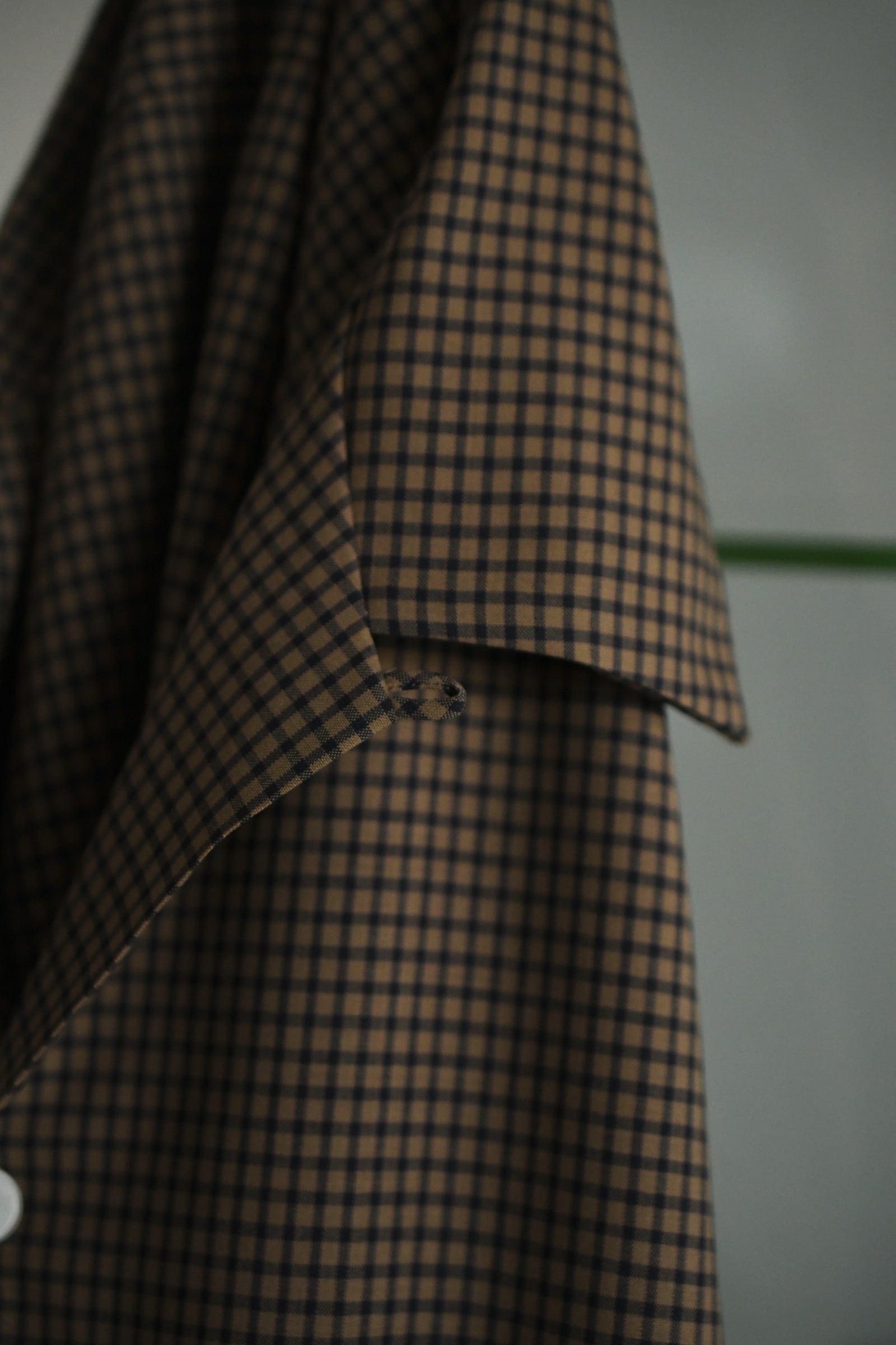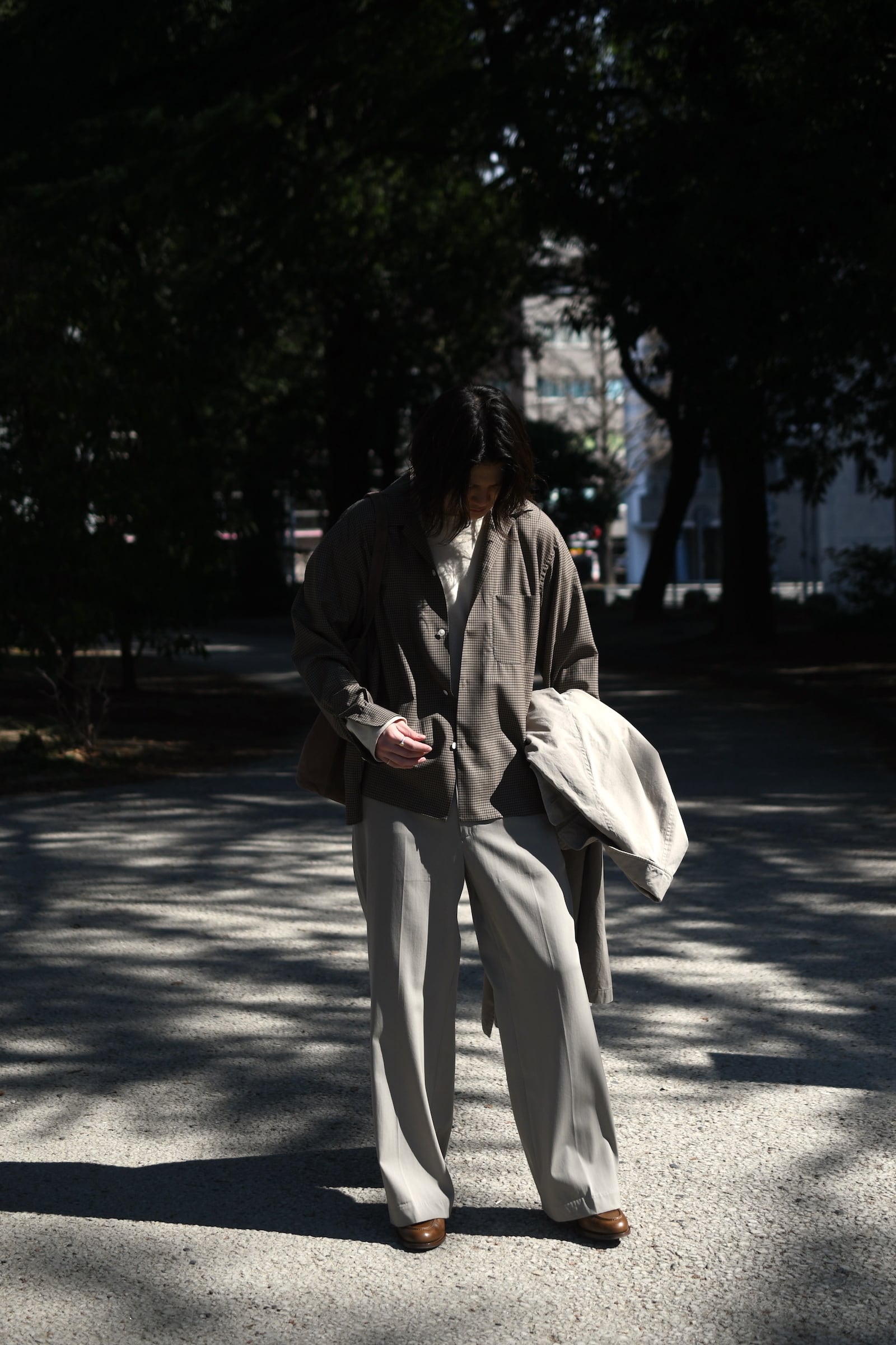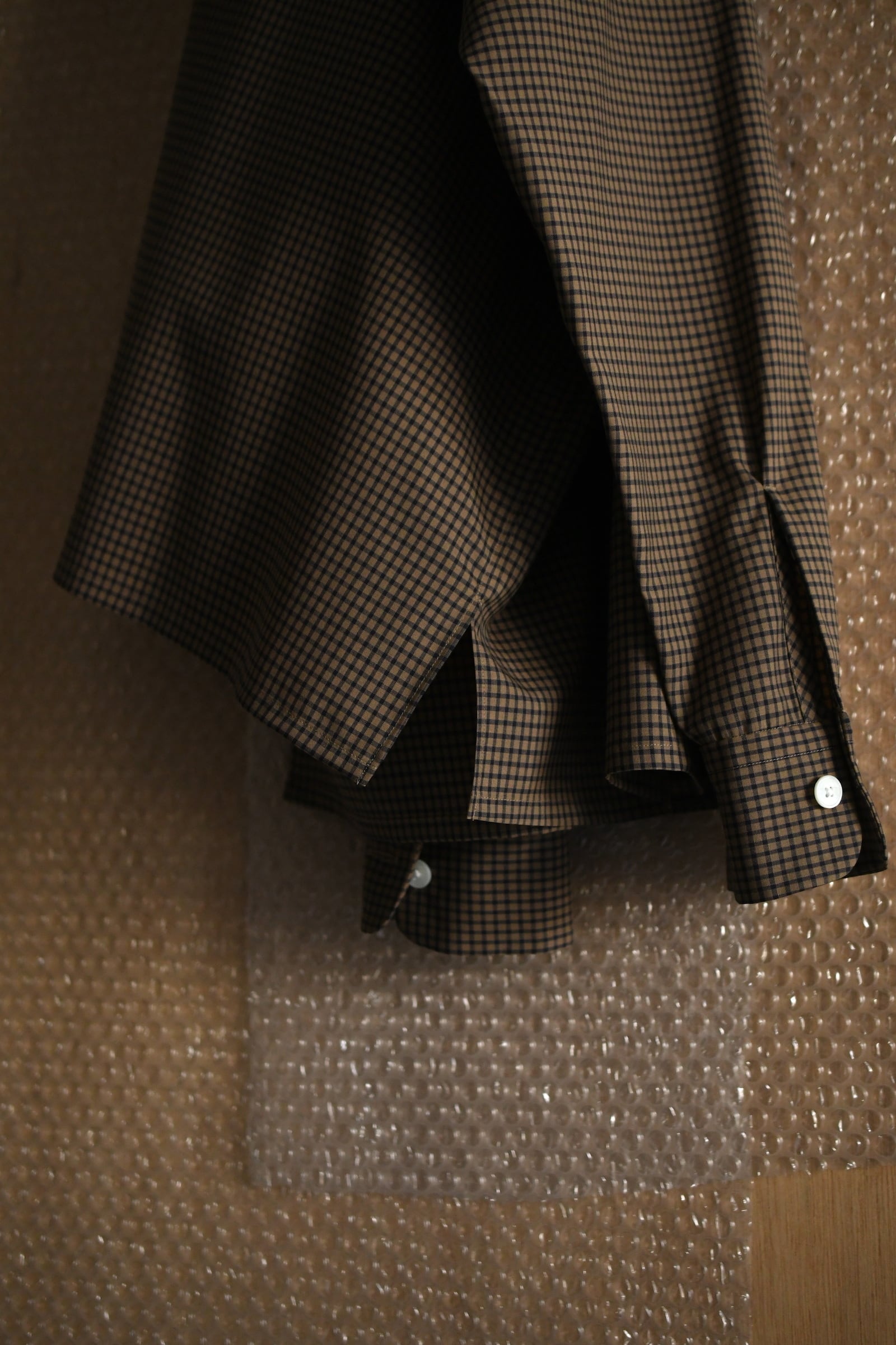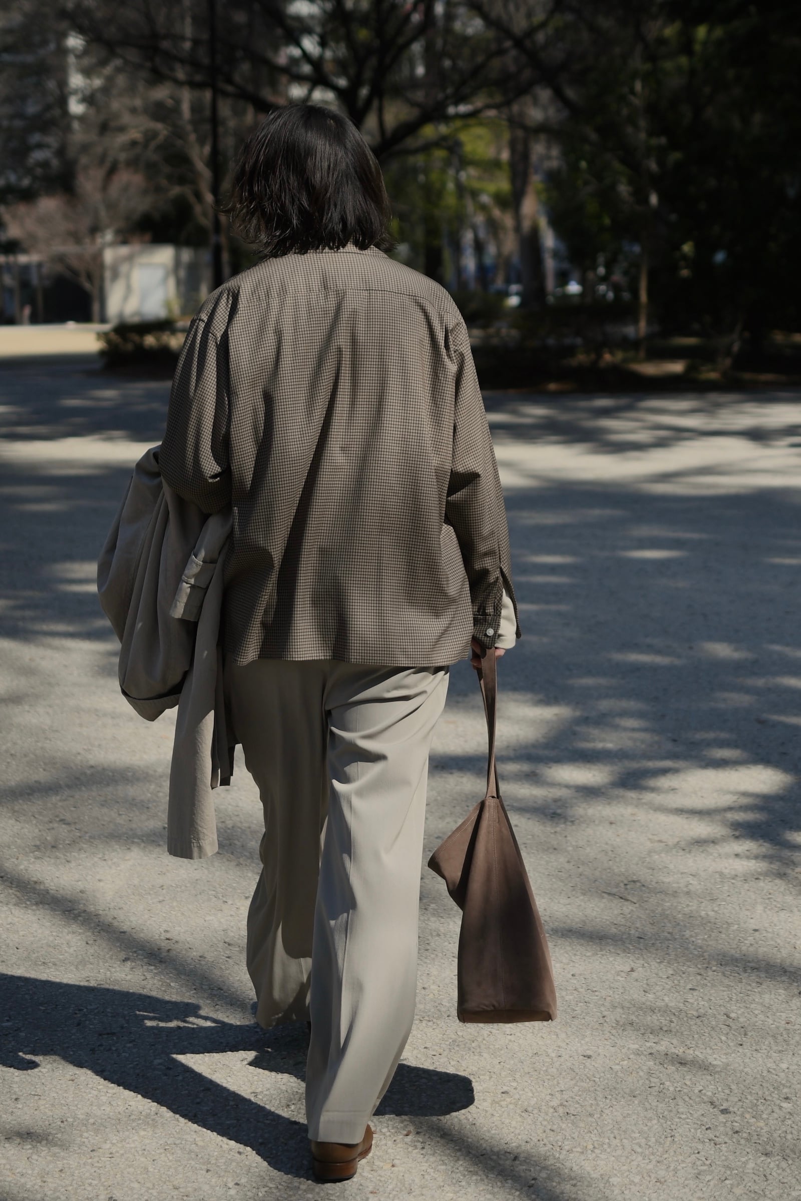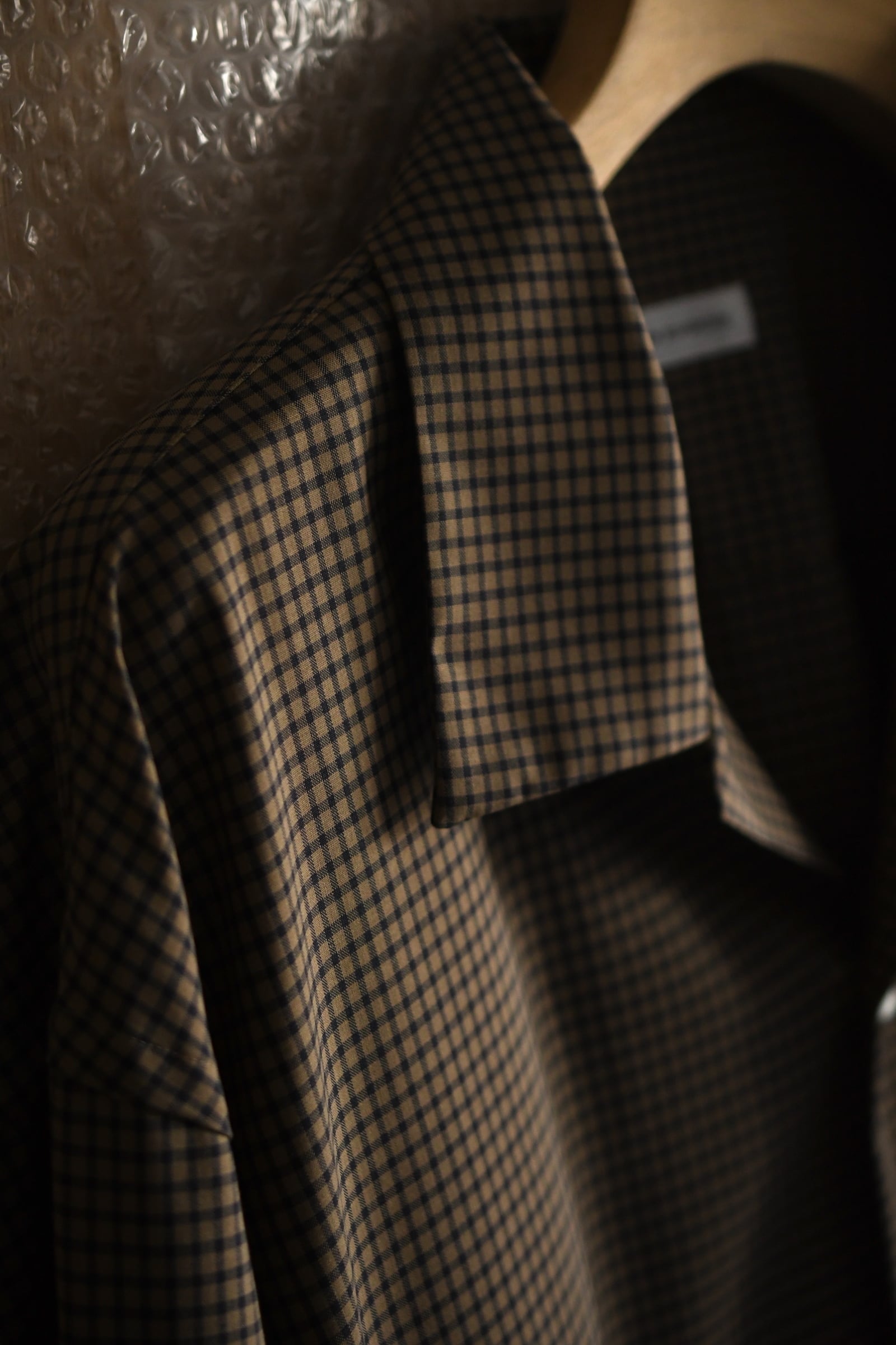 KAPTAIN SUSHINEが新たに手掛けた生地は、上質で滑らかな Super140’s 相当の極細ウールを用いて織り上げたサマーウール。サラッとした優しい質感、そして優れた防臭性や通気性、シワになりづらい耐久性をも備えており、春〜初秋までの長い期間で頼りになる嬉しいスペックを有している。更にウォッシャブル加工も施されており、高温多湿な日本の夏季に於いて強く求めたい ”気兼ねなく洗える”という魅力もそこにはしっかり秘められていた。その魅惑的な生地を用いて製作された開襟シャツは、揺れる軽やかなドレープと肌離れの良さを活かすように仕立てられたリラックス感あるバランスが素晴らしく、真夏でも快適に過ごす事が出来るだろう。そして、優しい色合いだが不思議と渋さを感じる好配色の細やかな格子柄は、春夏という爽快な季節にキリッとした落ち着きを与えるかのようにモダンな空気感を纏わせており、より大人な1着へ仕上げてくれている。