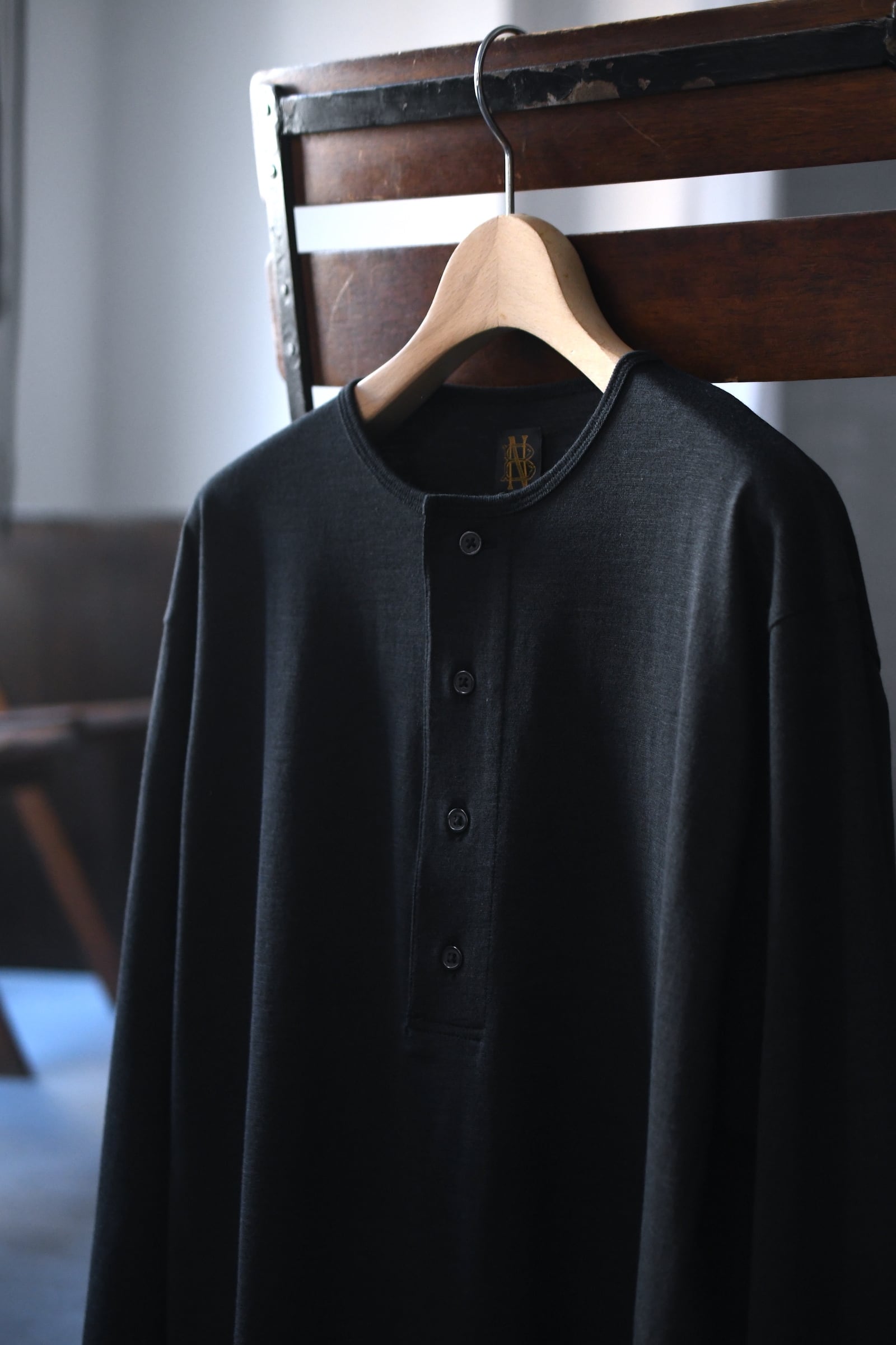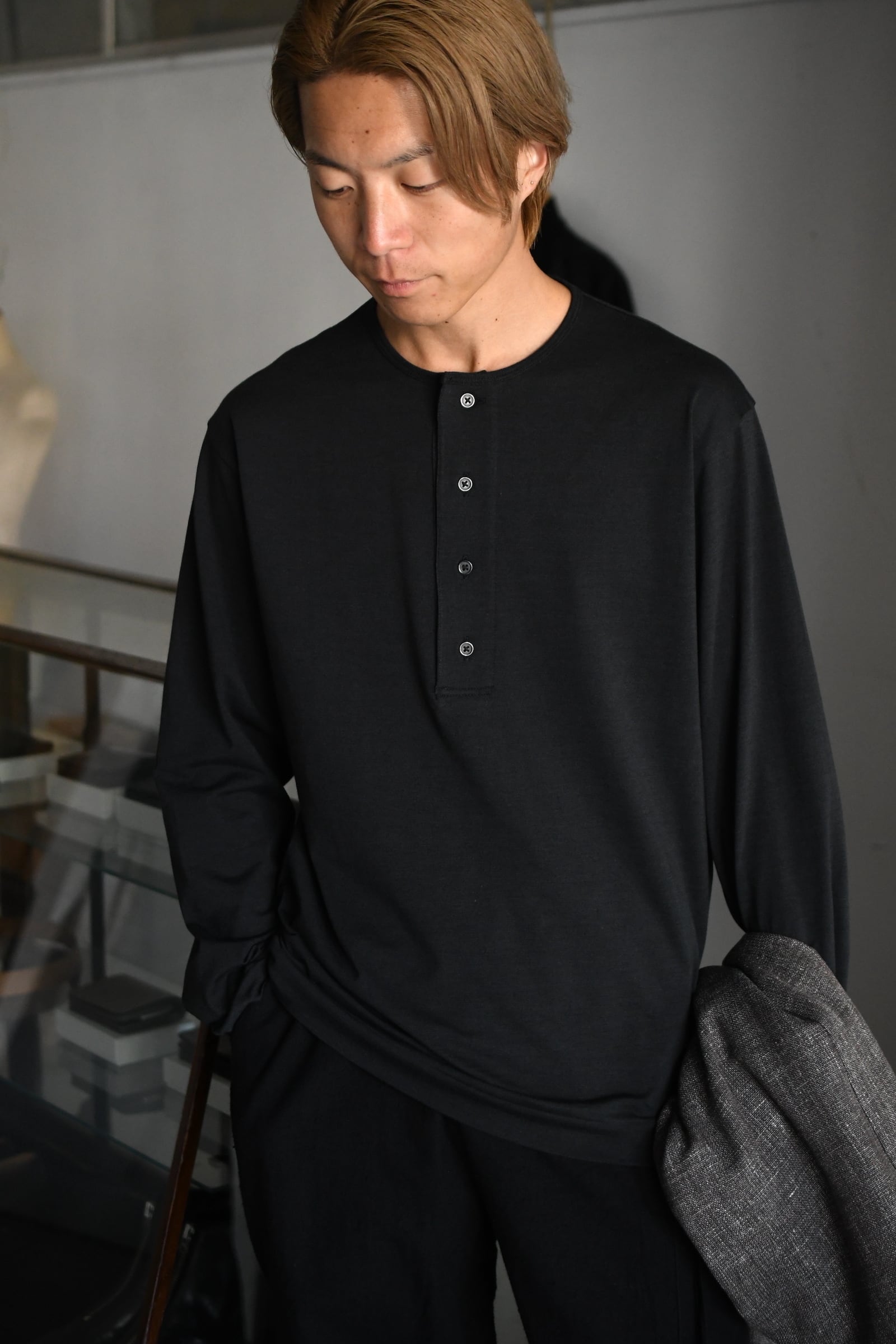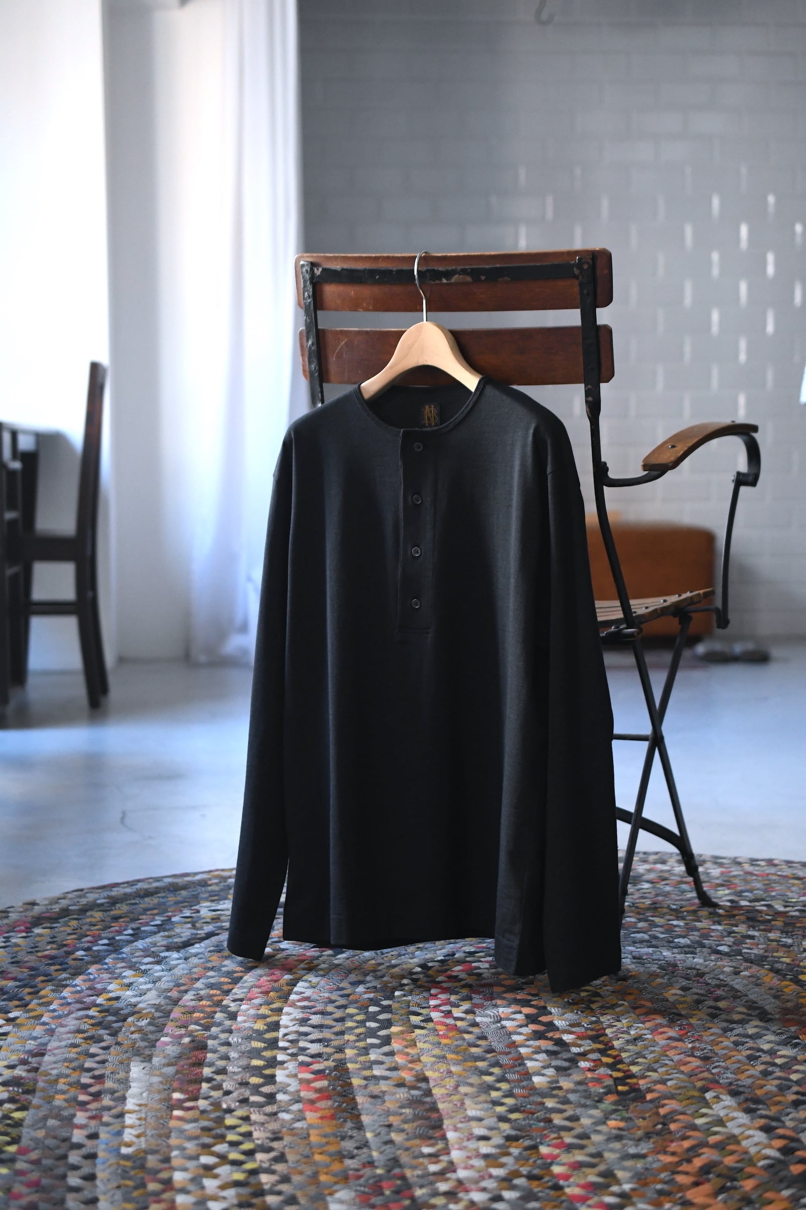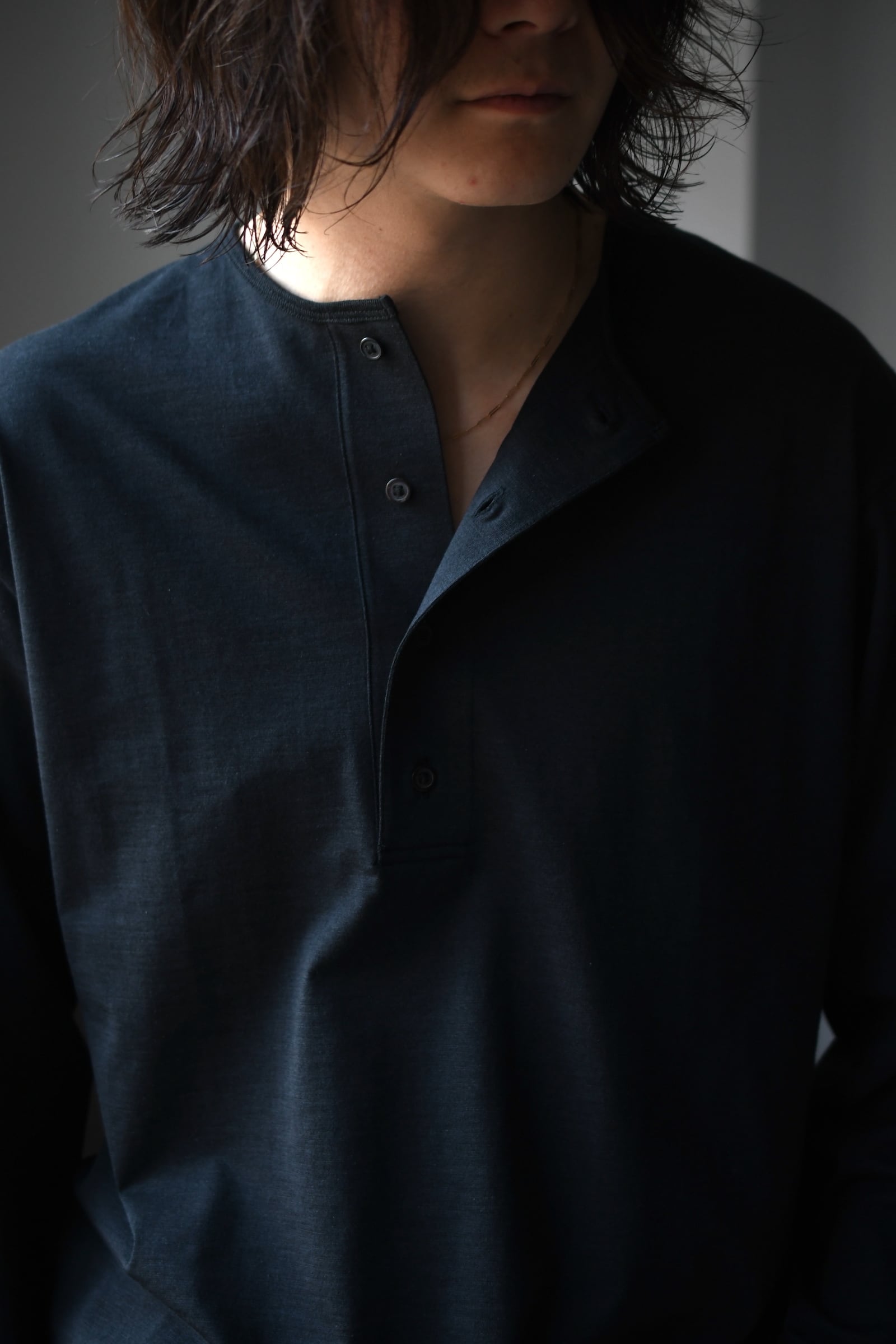 滑らかな質感の奥に独特な風合いが顔を覗かせるBATONERの新たなマテリアルとスリーピング型の掛け合わせは、普遍的でありながらも良いアクセントを重ね着の中で楽しませてくれるように思えた。凹凸感のある細番手のスラブ糸とストレートな細番手糸を撚糸した生地は、上述の通り独特な表情感が魅力であり、無地のように扱えながらもスラブの微かな濃淡が重ねる色のコントラストを上手くリードしてくれる。衿元は細幅バインダーネックで変形しづらく、袖口と裾口はシングルステッチ仕様と抜け目が無い。そして当然ながらに着心地の優越さは言うまでもなく素晴らしい。ヘンリーネックよりも釦の感覚があり深いバランスは、その開閉次第で様々な抜け感を首元に演出してくれる為、主役としてもシャツ、ジャケット等のインナー使いにも大きな期待が寄せられるだろう。意外と疎かには出来ない春夏の”中に何を着るか問題”。この1枚はその大きな突破口になると確信している。