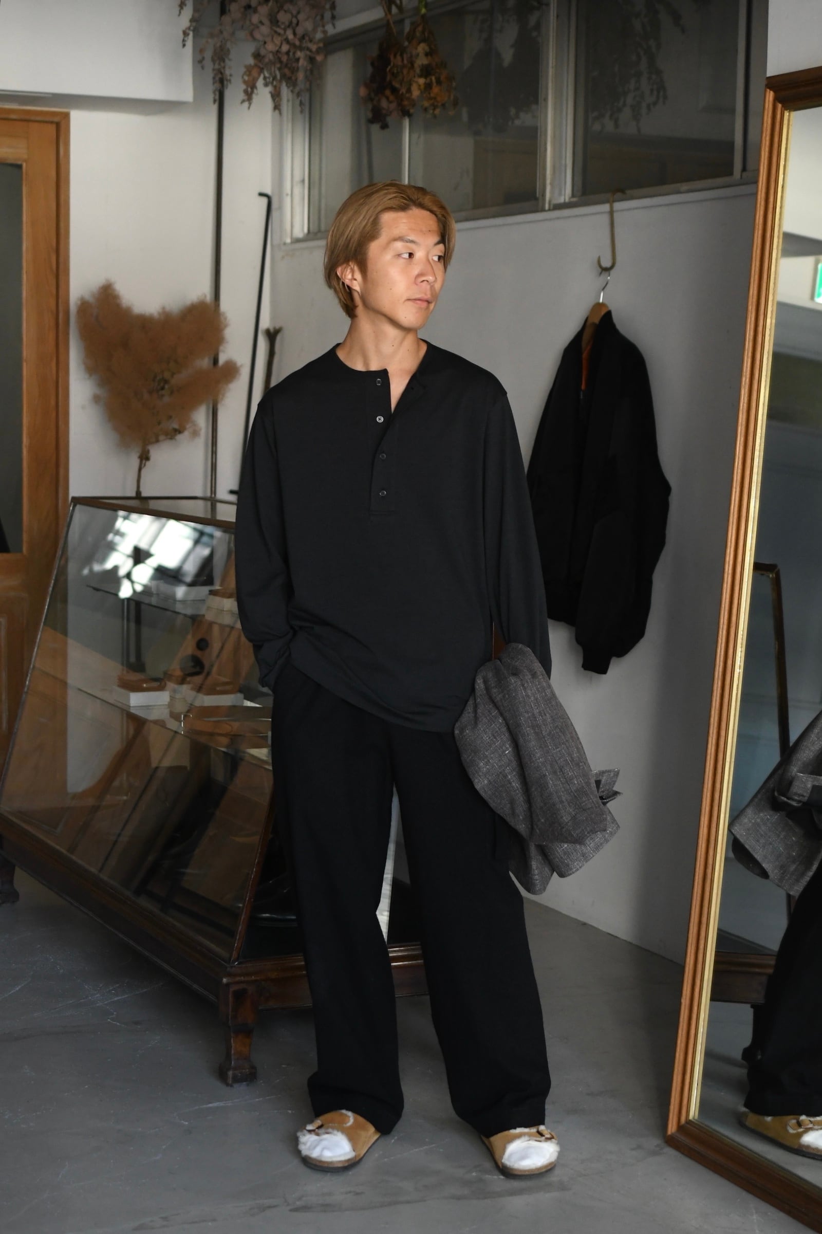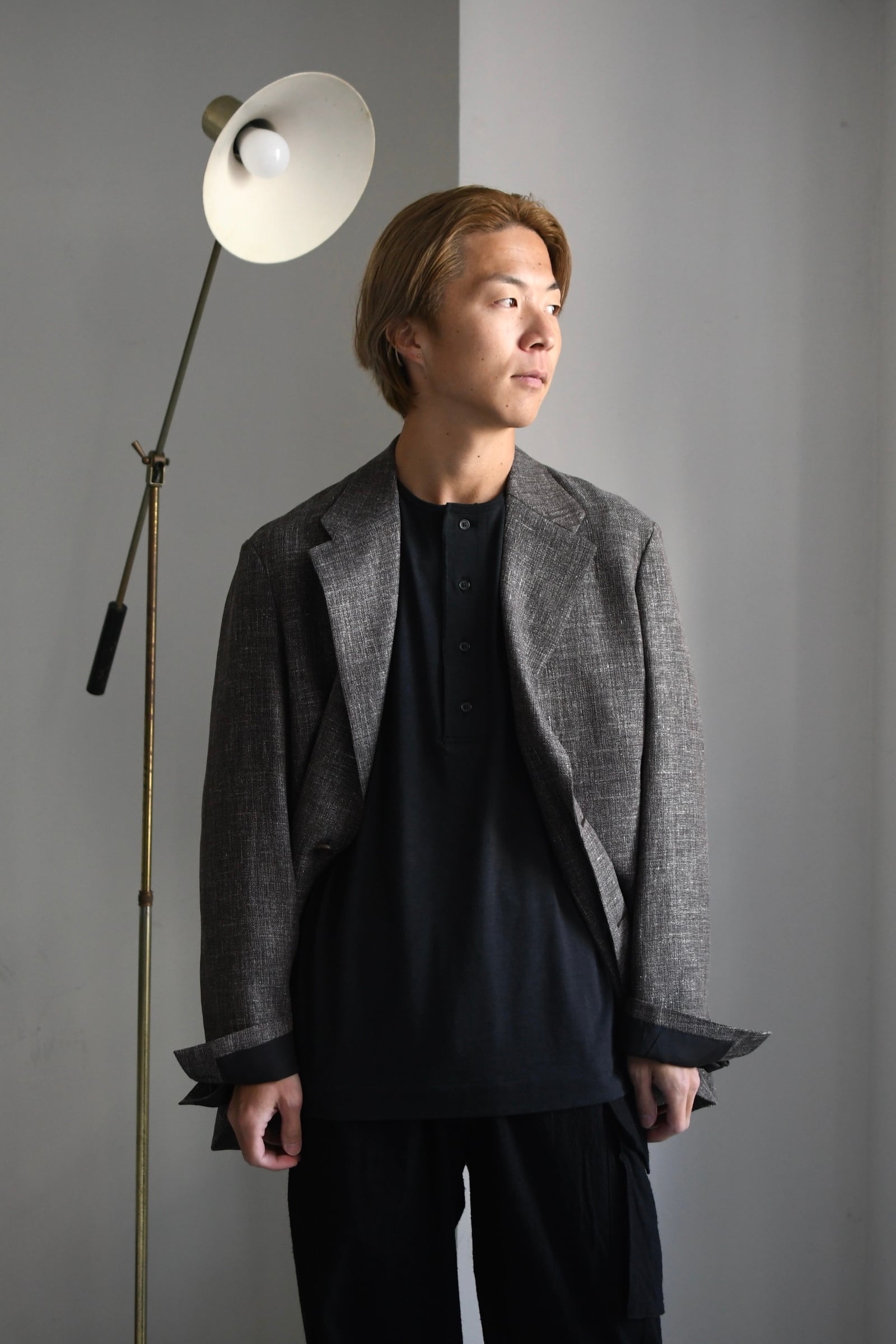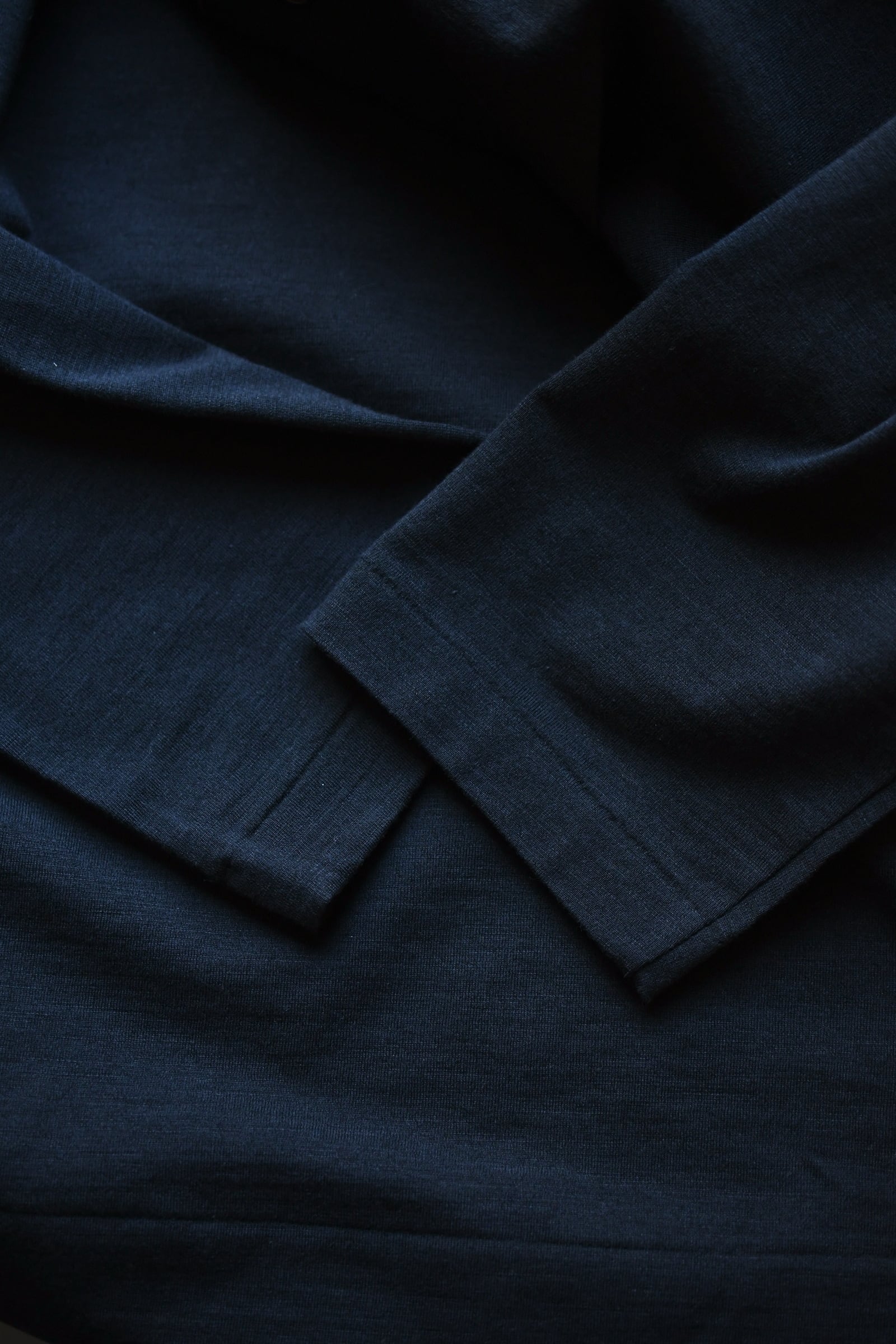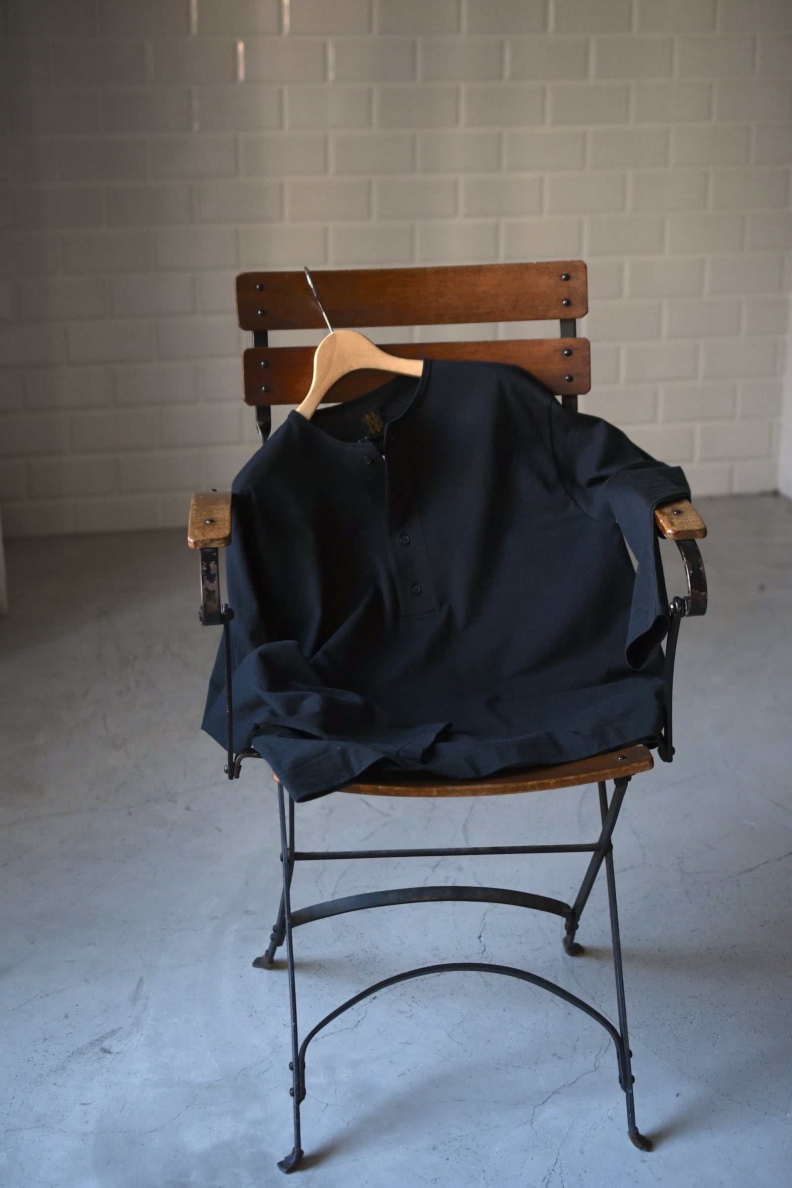 滑らかな質感の奥に独特な風合いが顔を覗かせるBATONERの新たなマテリアルとスリーピング型の掛け合わせは、普遍的でありながらも良いアクセントを重ね着の中で楽しませてくれるように思えた。凹凸感のある細番手のスラブ糸とストレートな細番手糸を撚糸した生地は、上述の通り独特な表情感が魅力であり、無地のように扱えながらもスラブの微かな濃淡が重ねる色のコントラストを上手くリードしてくれる。衿元は細幅バインダーネックで変形しづらく、袖口と裾口はシングルステッチ仕様と抜け目が無い。そして当然ながらに着心地の優越さは言うまでもなく素晴らしい。ヘンリーネックよりも釦の感覚があり深いバランスは、その開閉次第で様々な抜け感を首元に演出してくれる為、主役としてもシャツ、ジャケット等のインナー使いにも大きな期待が寄せられるだろう。意外と疎かには出来ない春夏の”中に何を着るか問題”。この1枚はその大きな突破口になると確信している。