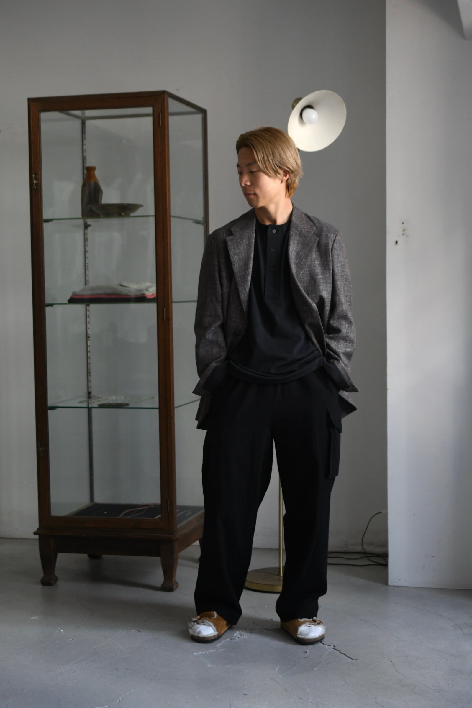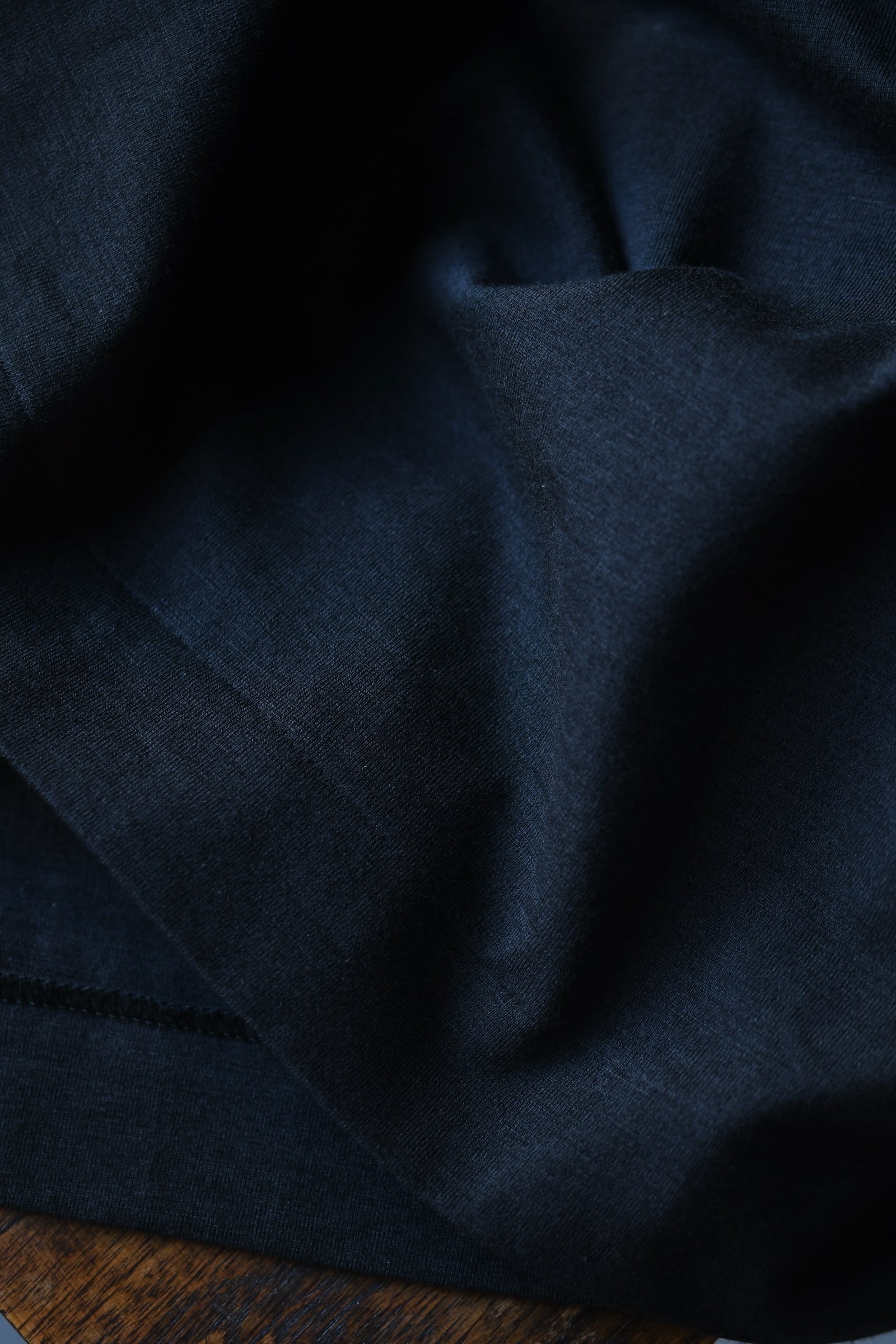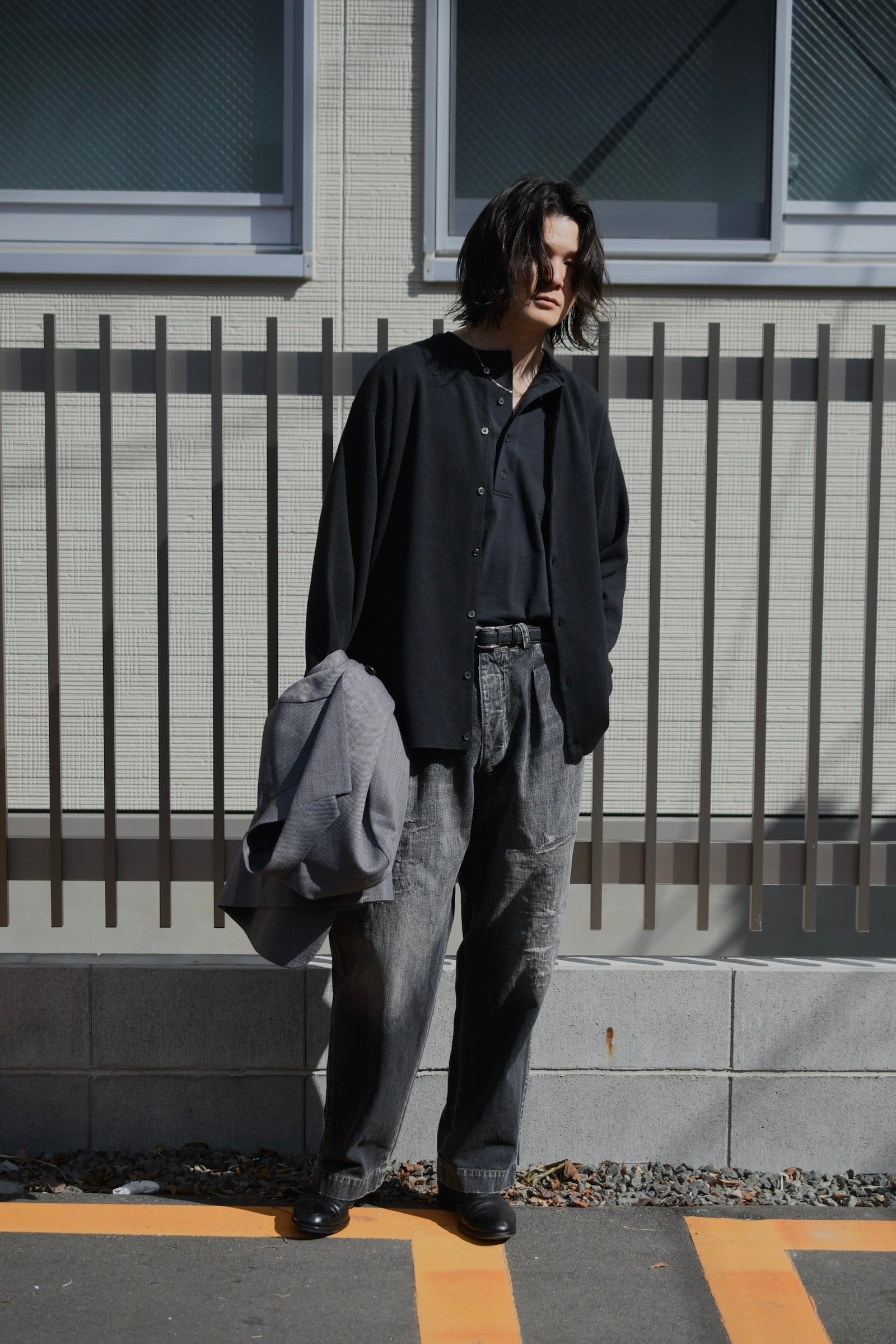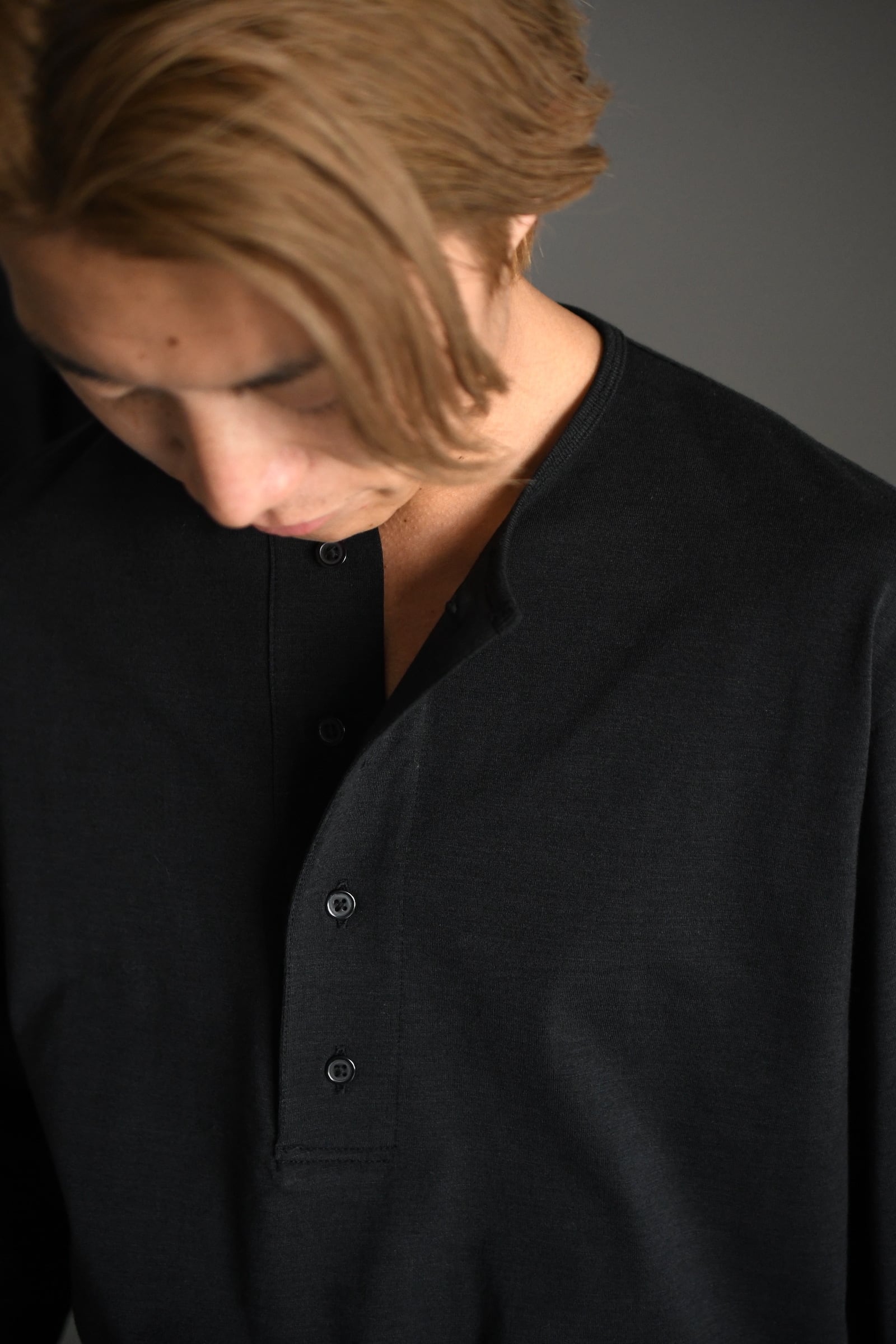 滑らかな質感の奥に独特な風合いが顔を覗かせるBATONERの新たなマテリアルとスリーピング型の掛け合わせは、普遍的でありながらも良いアクセントを重ね着の中で楽しませてくれるように思えた。凹凸感のある細番手のスラブ糸とストレートな細番手糸を撚糸した生地は、上述の通り独特な表情感が魅力であり、無地のように扱えながらもスラブの微かな濃淡が重ねる色のコントラストを上手くリードしてくれる。衿元は細幅バインダーネックで変形しづらく、袖口と裾口はシングルステッチ仕様と抜け目が無い。そして当然ながらに着心地の優越さは言うまでもなく素晴らしい。ヘンリーネックよりも釦の感覚があり深いバランスは、その開閉次第で様々な抜け感を首元に演出してくれる為、主役としてもシャツ、ジャケット等のインナー使いにも大きな期待が寄せられるだろう。意外と疎かには出来ない春夏の”中に何を着るか問題”。この1枚はその大きな突破口になると確信している。