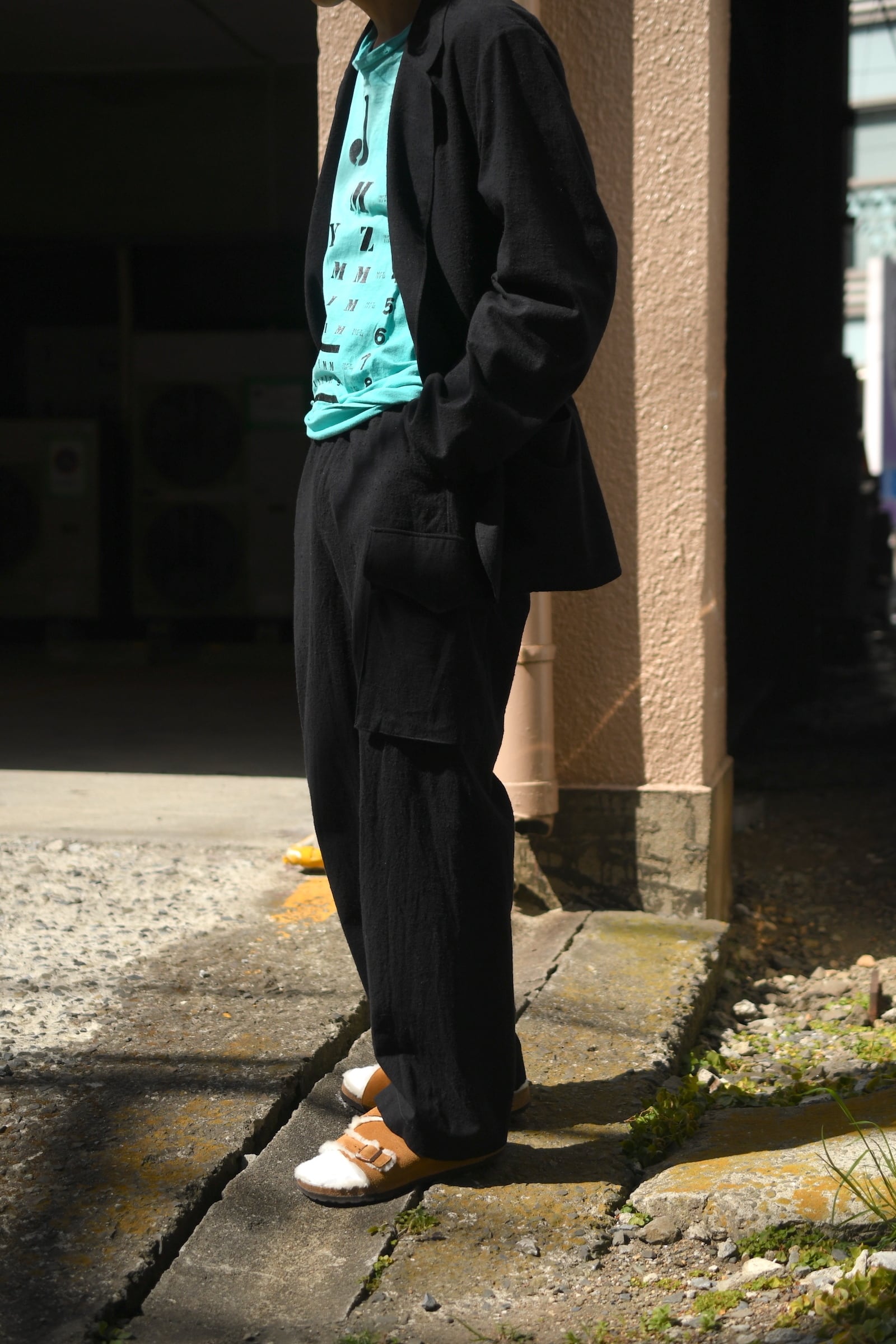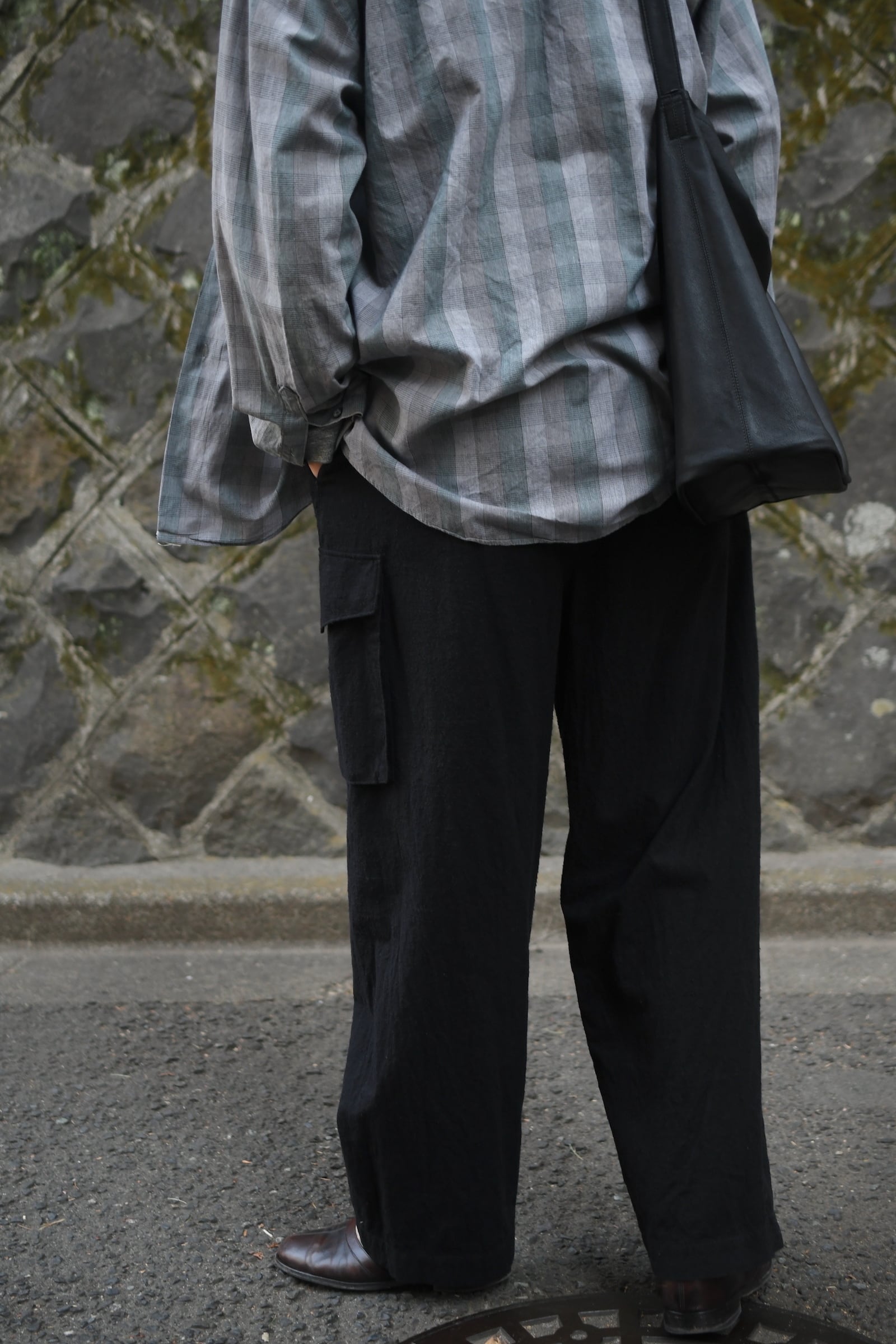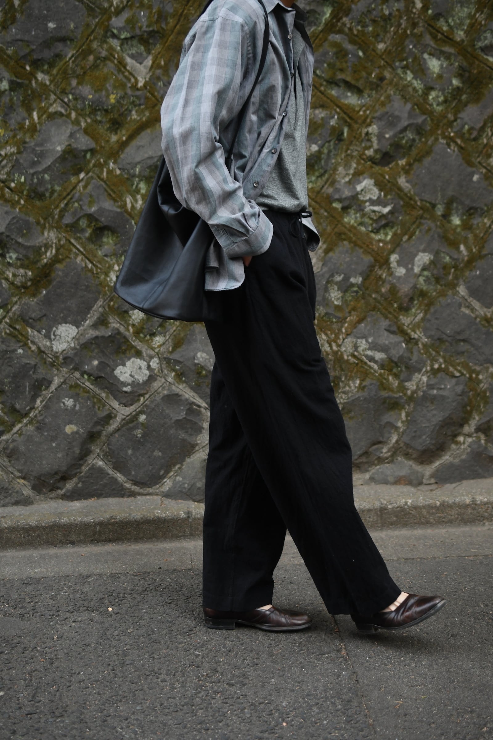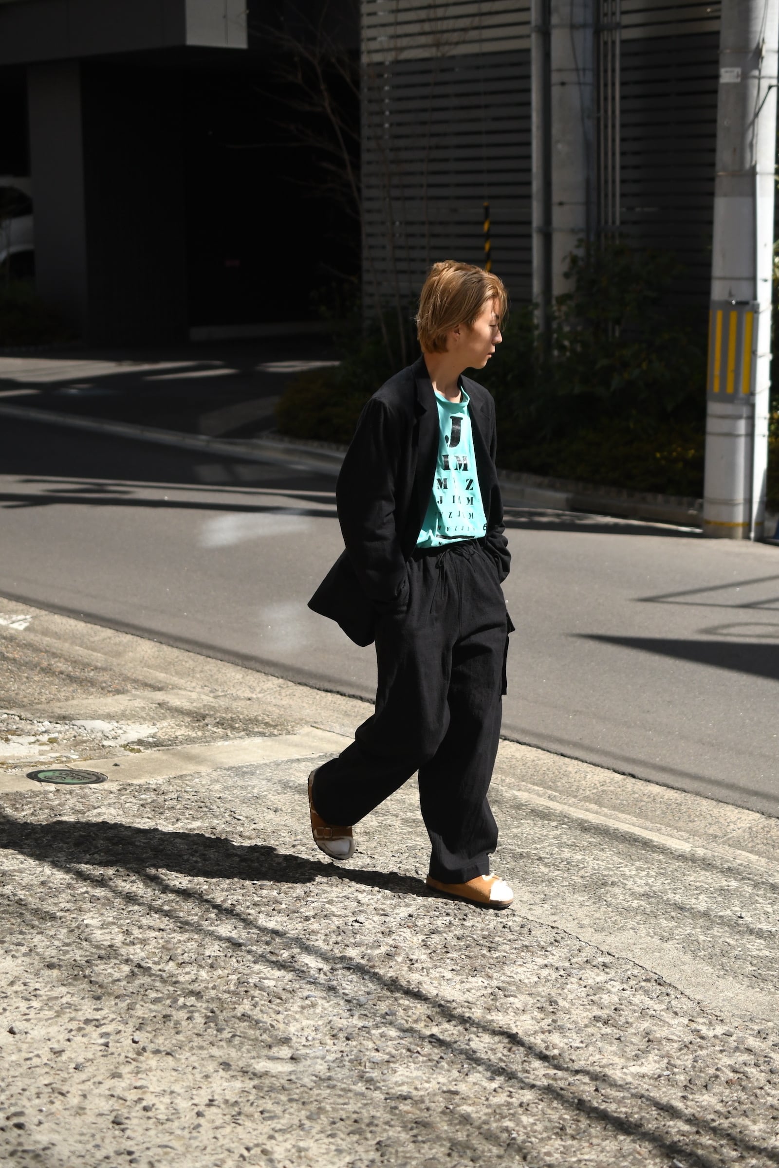 イージーに穿ける心地良さが土台にある上で、サイドに剥ぎのない仕様と巧みなパターンセンスで美しいシルエットを有する定番の4Pパンツは、今季より少し余白感が広がり、そして日本の夏季にも最適と言える贅沢な素材感を纏って新たに誕生した。染色、番手の異なるコットンシルクのムラ糸3種を織り交ぜた後にワッシャータンブラー加工を施した生地は、ネップを際立たせた立体感ある素朴な風合いと柔らかな着心地を誇り、軽量で通気性が良く、清涼的で肌離れも良い。時季で言えば春から梅雨、そして真夏においても重宝する優れた素材感と断言出来る。春はシャツ、ニットのお供から始まり、夏はリネンを筆頭とした爽快な素材達と合わせて是非堪能して頂きたい。