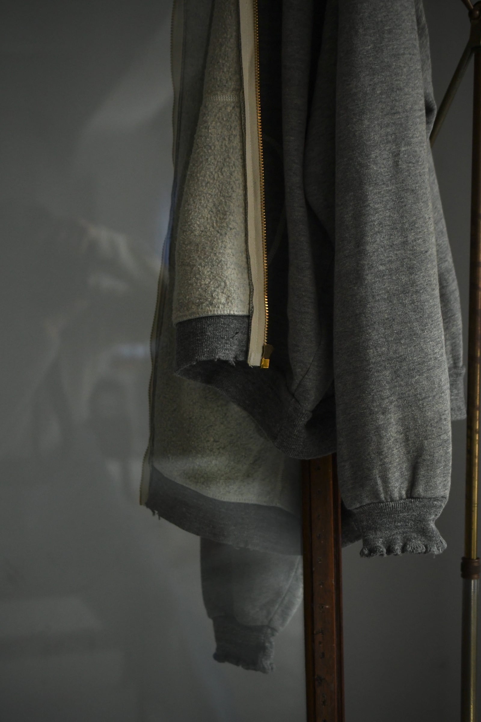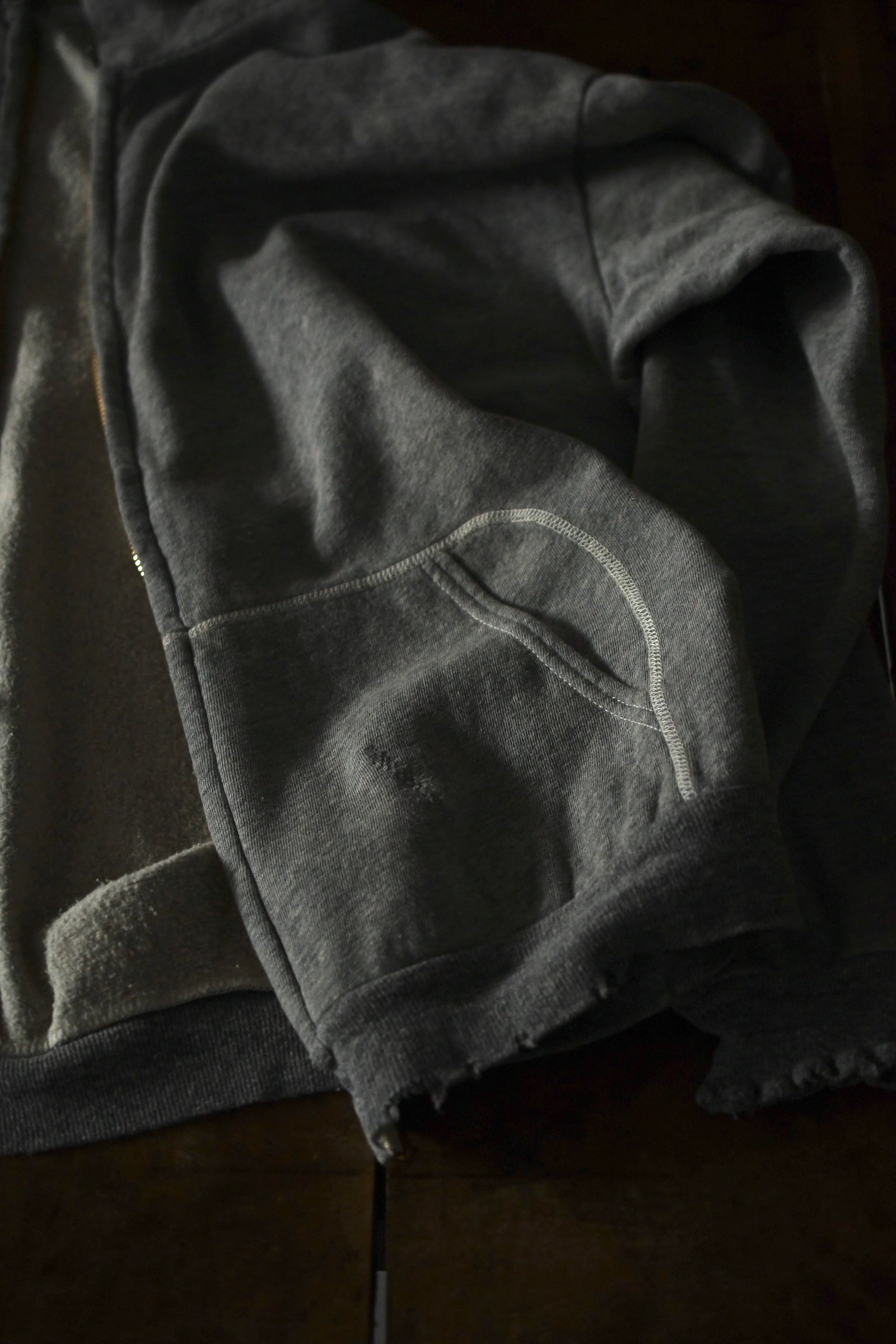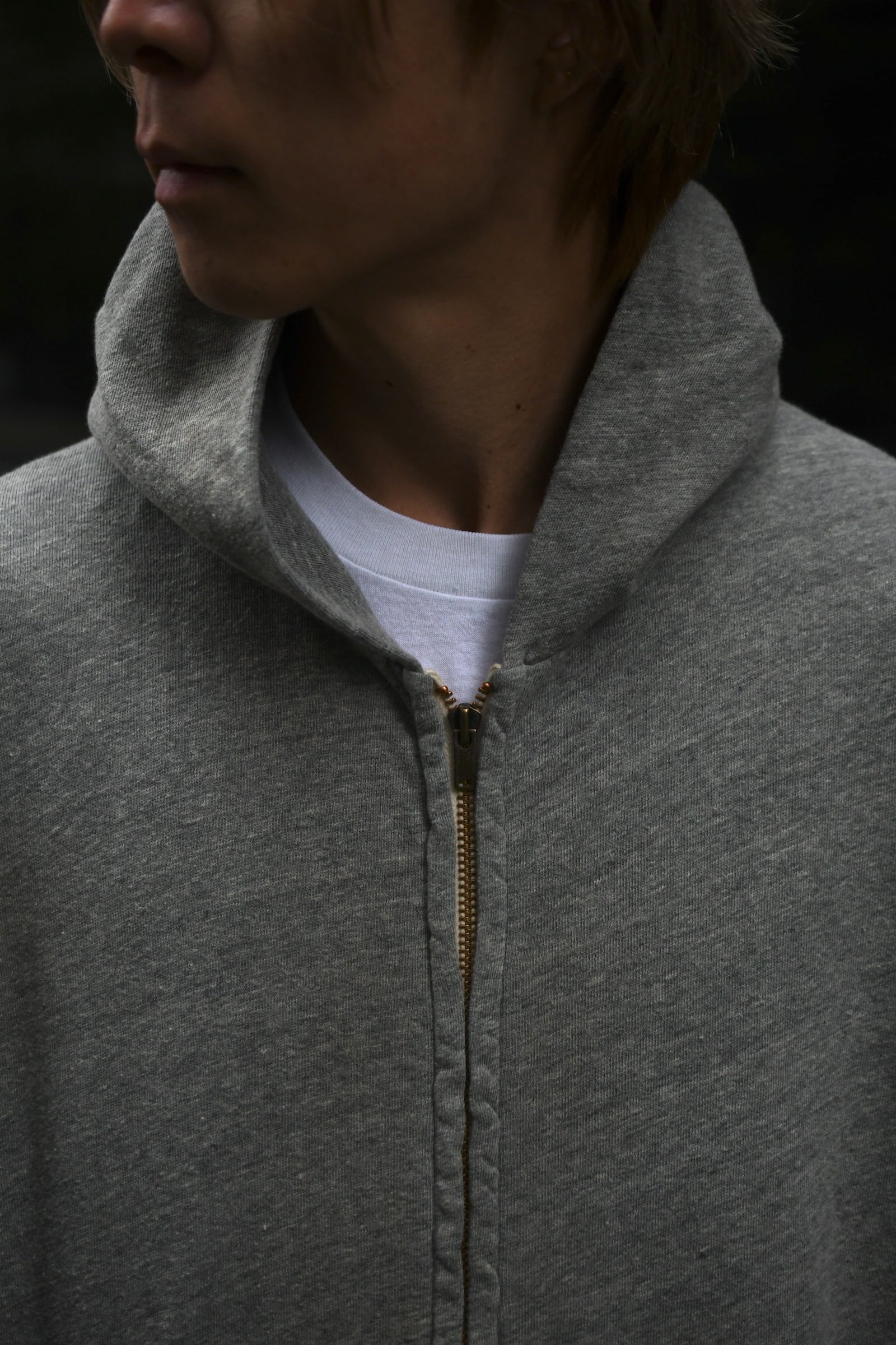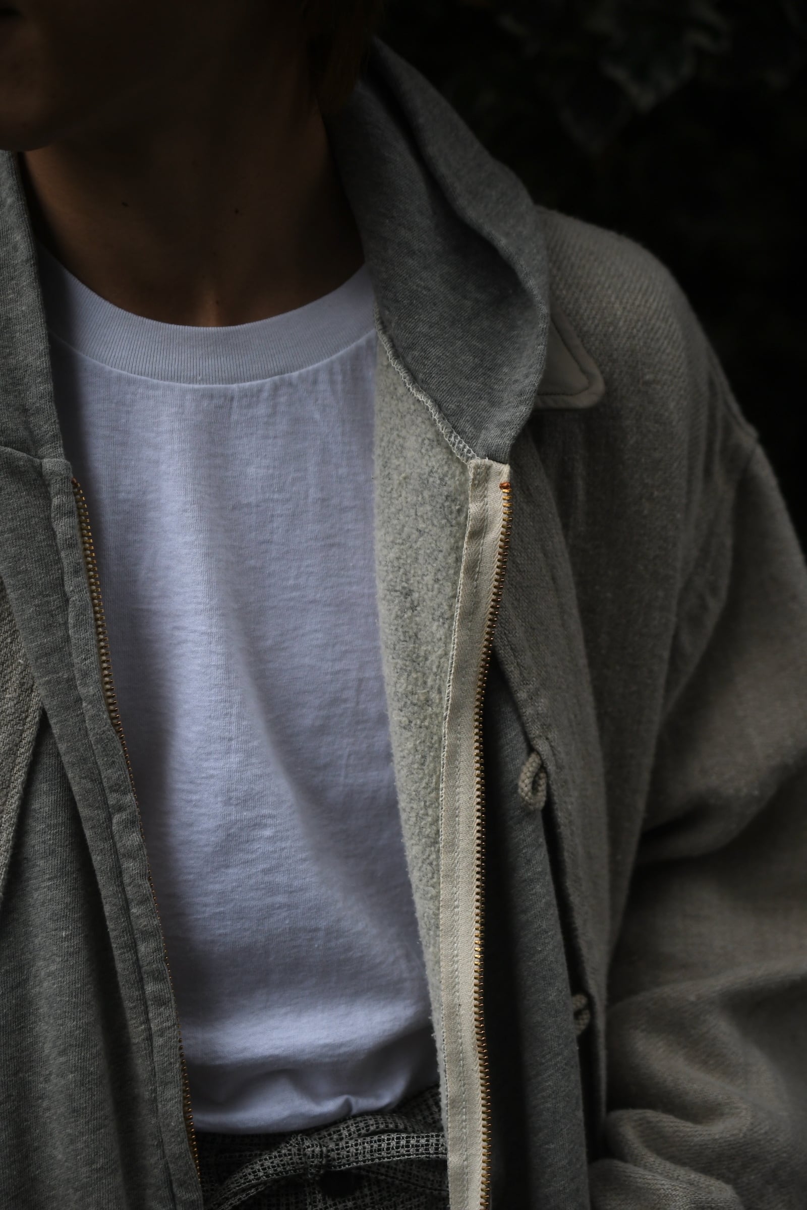 60’s前後に生産されていたヴィンテージの個体をベースに、これまでのZIPフーディーよりも更にレイヤードの一手を担うモノとなった今作。4本針ミシンで縫い付けたポケット、伸びて緩くなったリブが助長させる崩れたシルエット感、所々に仕掛けられた手作業による自然なボロ。そして同様にビンテージ派生で辿り着いた生地は、裏起毛が経年変化で滑落し毛が抜けて薄手になった肉感を再現している。シルエットの妙と、気温の変化に大きく左右される事のない絶妙な生地の厚みは、今〜春先に必須の羽織りの中に自然と馴染み、職人の手作業で加工された色ムラと褪せた風合い、ヨレたZIPが様々な着こなしの中で静かな存在感を示す。この新たなフーディーは、無理なく物足りなさを埋める優れた1着として今後間違いなく重宝する予感がしてならない。