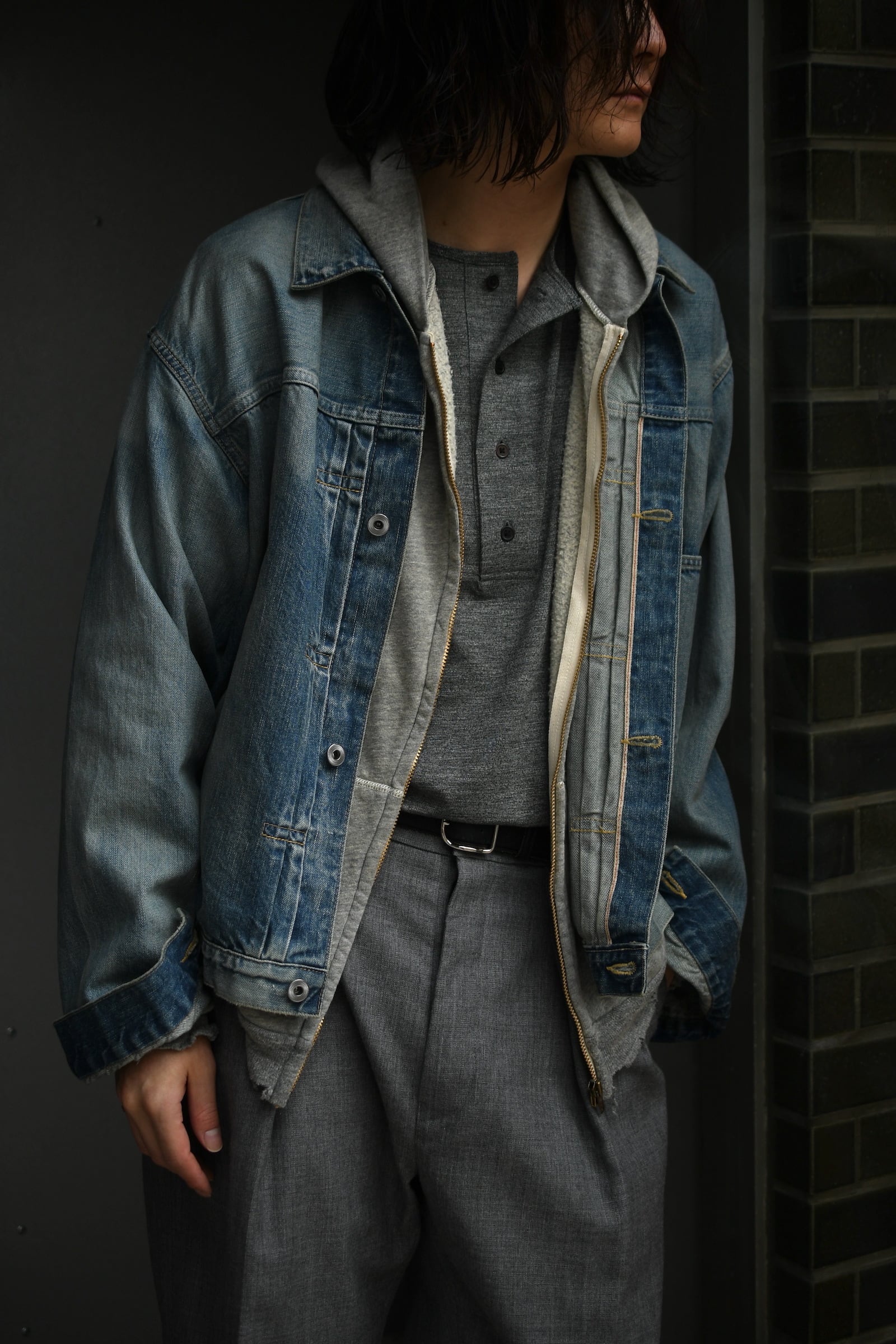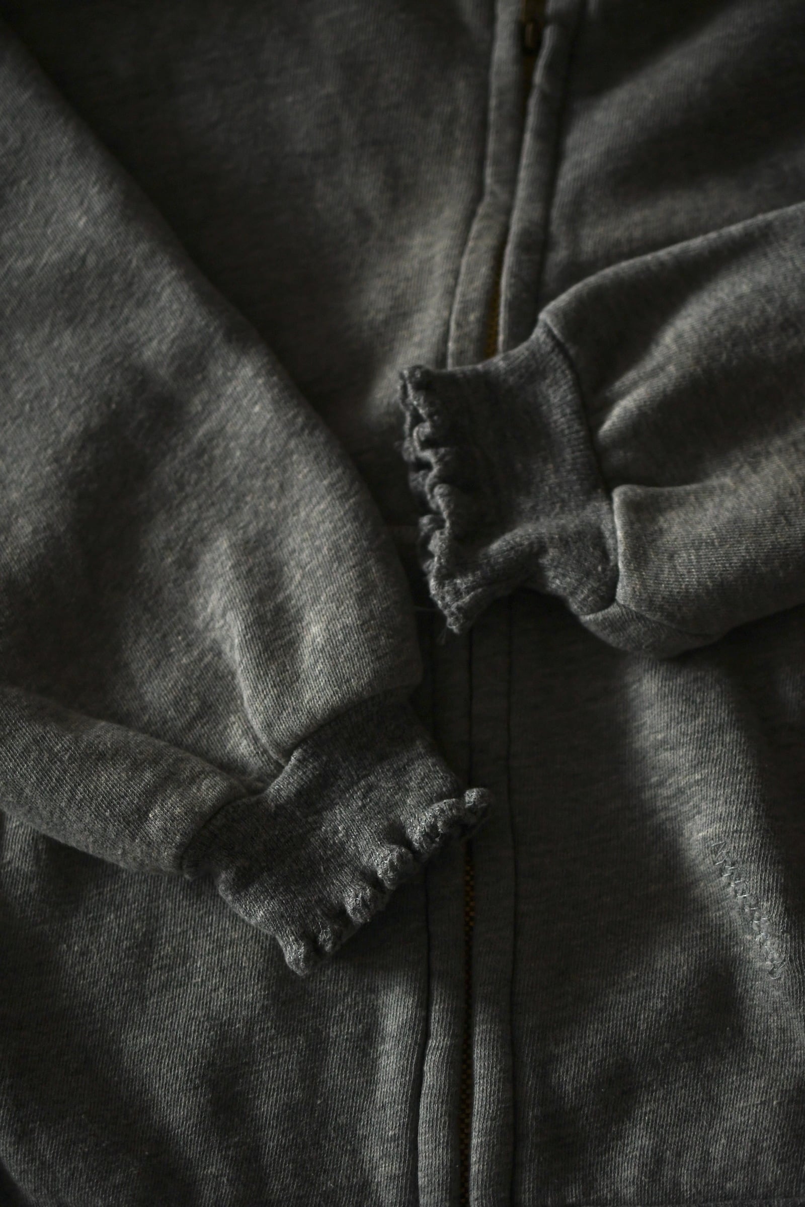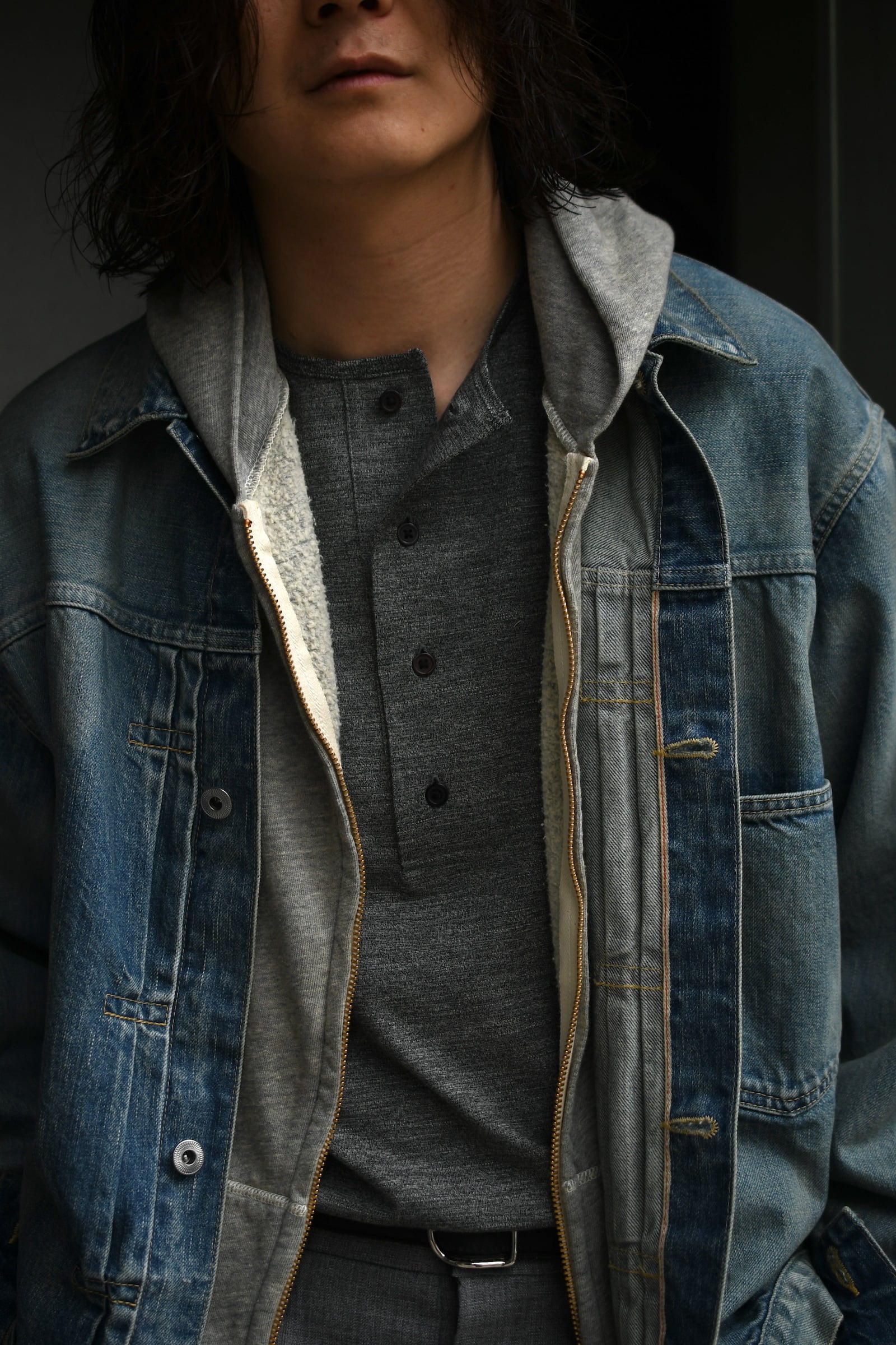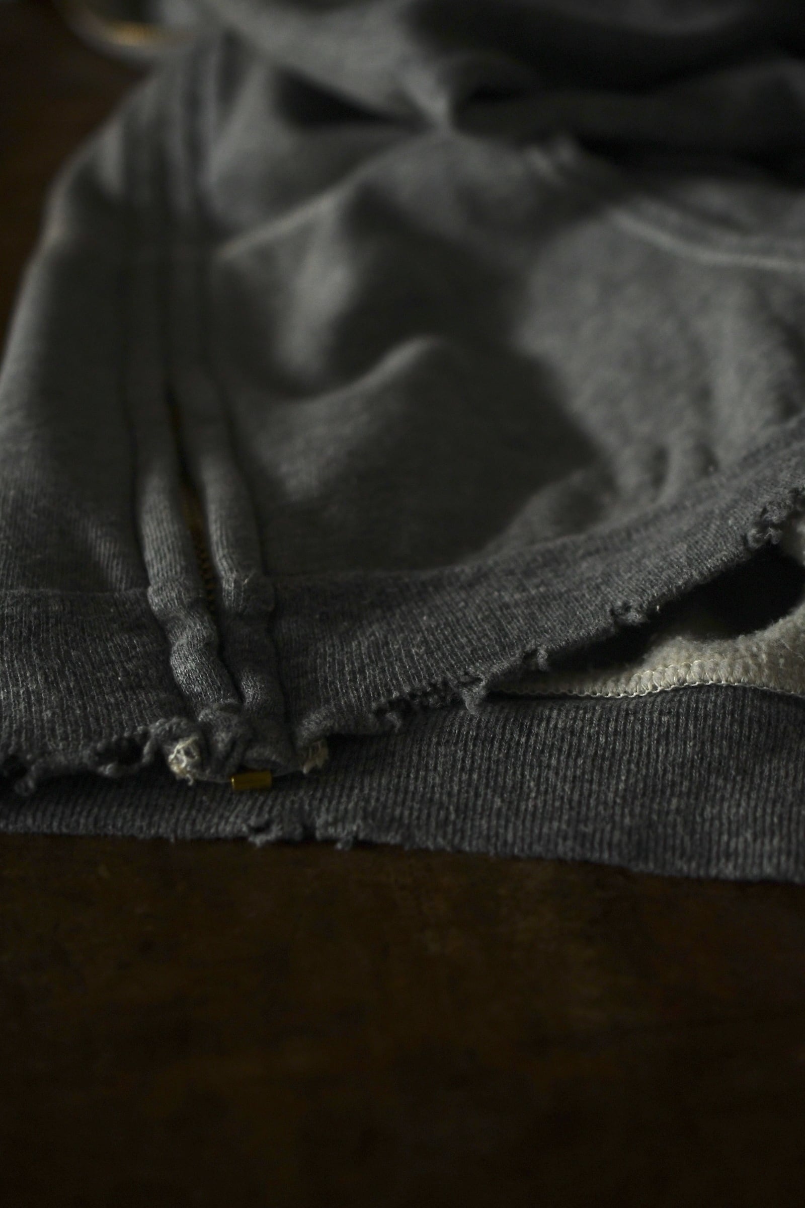 60’s前後に生産されていたヴィンテージの個体をベースに、これまでのZIPフーディーよりも更にレイヤードの一手を担うモノとなった今作。4本針ミシンで縫い付けたポケット、伸びて緩くなったリブが助長させる崩れたシルエット感、所々に仕掛けられた手作業による自然なボロ。そして同様にビンテージ派生で辿り着いた生地は、裏起毛が経年変化で滑落し毛が抜けて薄手になった肉感を再現している。シルエットの妙と、気温の変化に大きく左右される事のない絶妙な生地の厚みは、今〜春先に必須の羽織りの中に自然と馴染み、職人の手作業で加工された色ムラと褪せた風合い、ヨレたZIPが様々な着こなしの中で静かな存在感を示す。この新たなフーディーは、無理なく物足りなさを埋める優れた1着として今後間違いなく重宝する予感がしてならない。