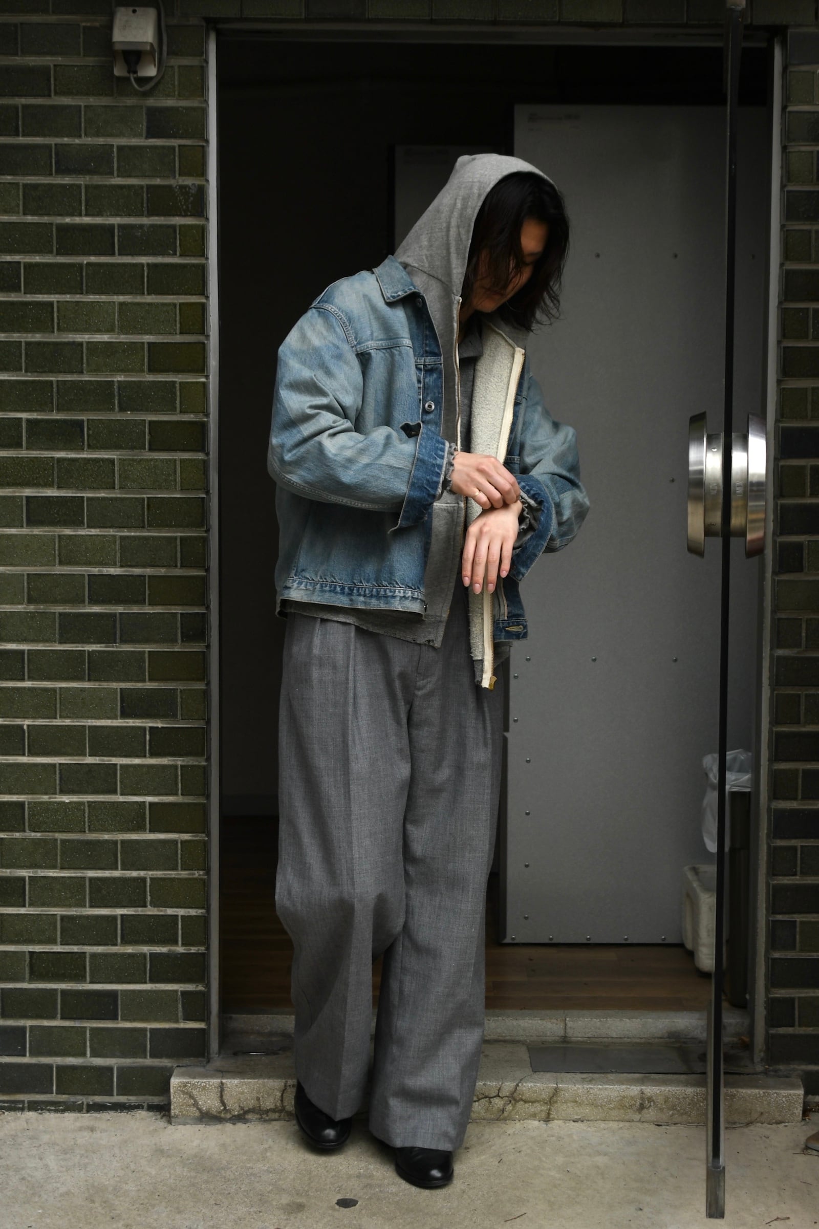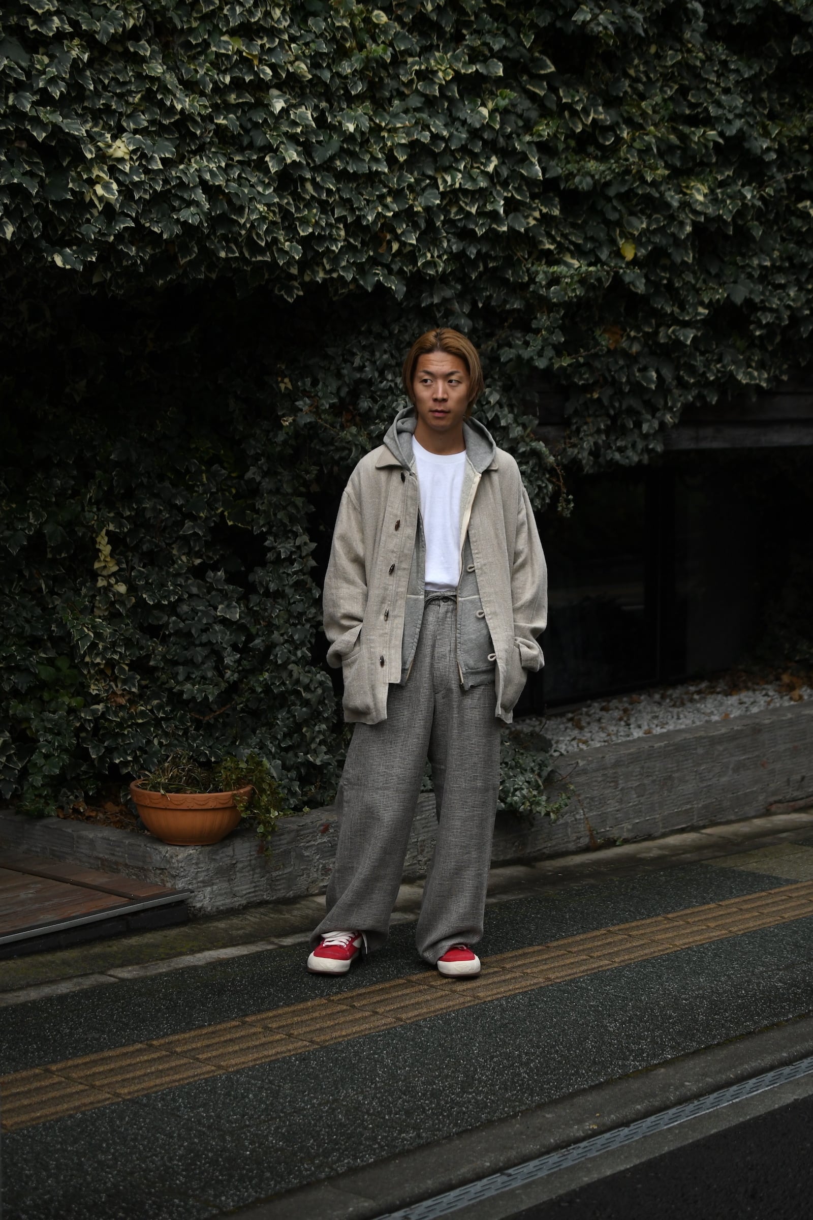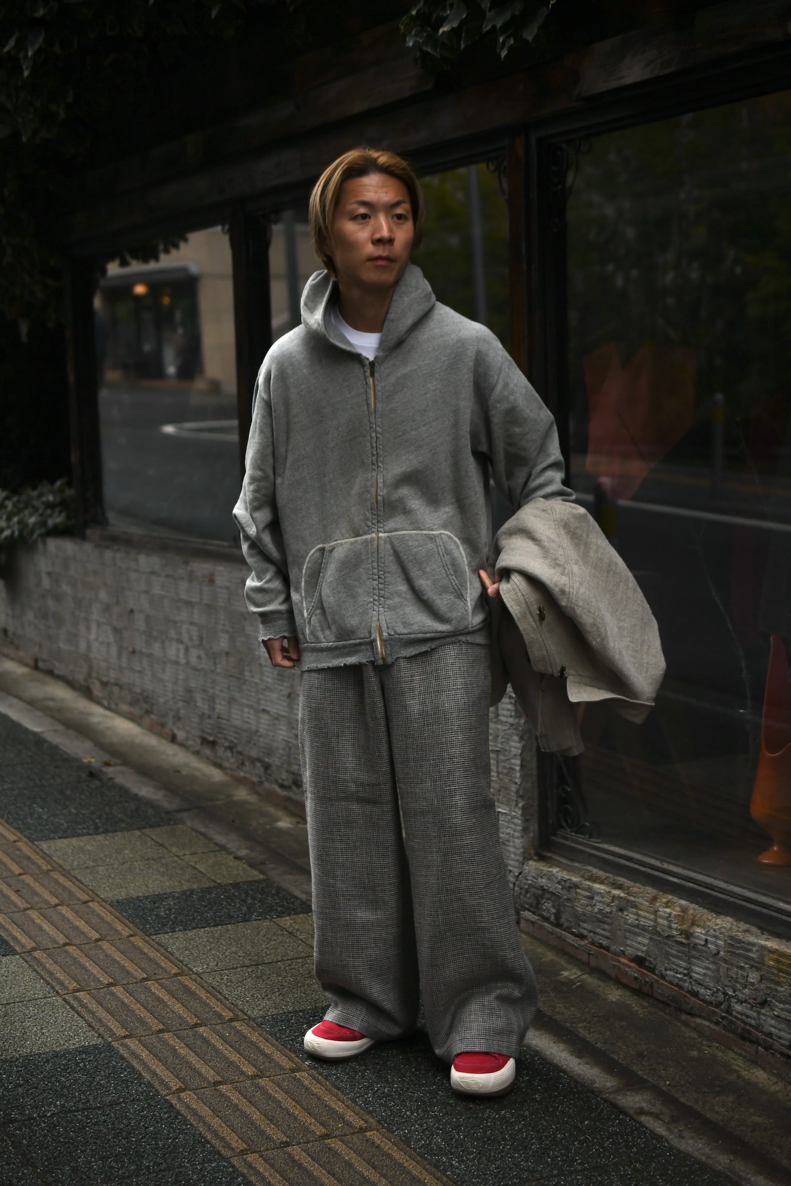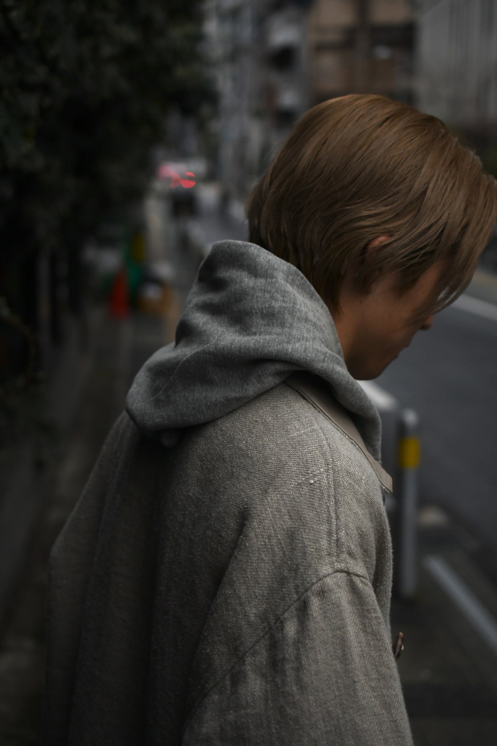 60’s前後に生産されていたヴィンテージの個体をベースに、これまでのZIPフーディーよりも更にレイヤードの一手を担うモノとなった今作。4本針ミシンで縫い付けたポケット、伸びて緩くなったリブが助長させる崩れたシルエット感、所々に仕掛けられた手作業による自然なボロ。そして同様にビンテージ派生で辿り着いた生地は、裏起毛が経年変化で滑落し毛が抜けて薄手になった肉感を再現している。シルエットの妙と、気温の変化に大きく左右される事のない絶妙な生地の厚みは、今〜春先に必須の羽織りの中に自然と馴染み、職人の手作業で加工された色ムラと褪せた風合い、ヨレたZIPが様々な着こなしの中で静かな存在感を示す。この新たなフーディーは、無理なく物足りなさを埋める優れた1着として今後間違いなく重宝する予感がしてならない。