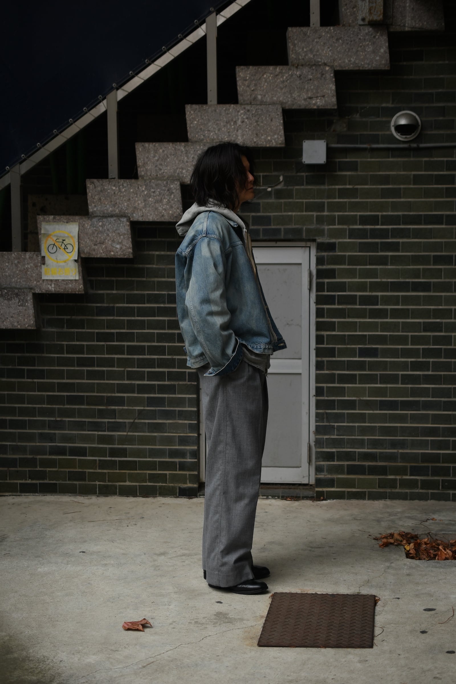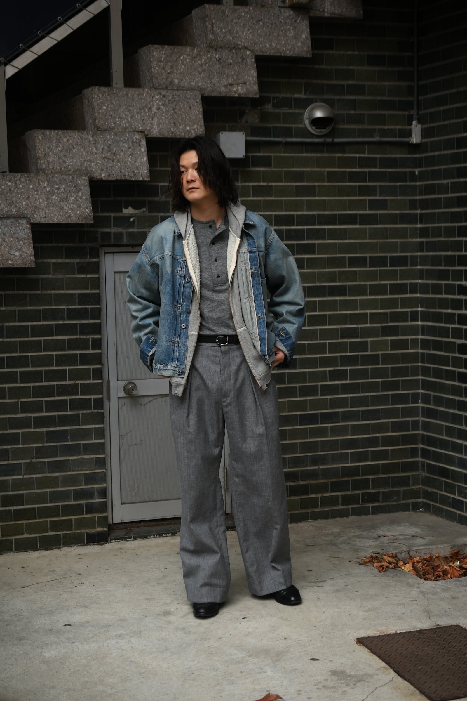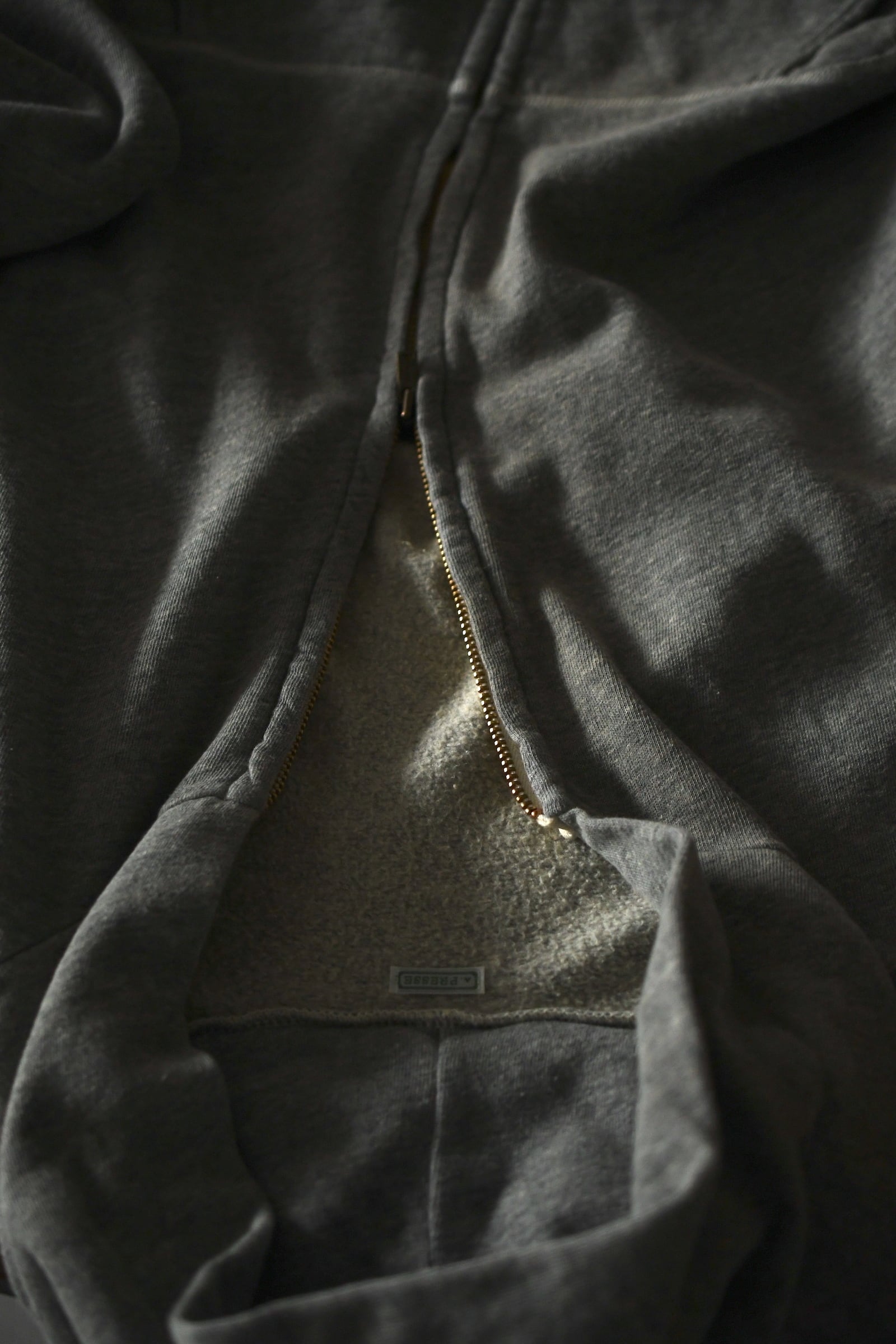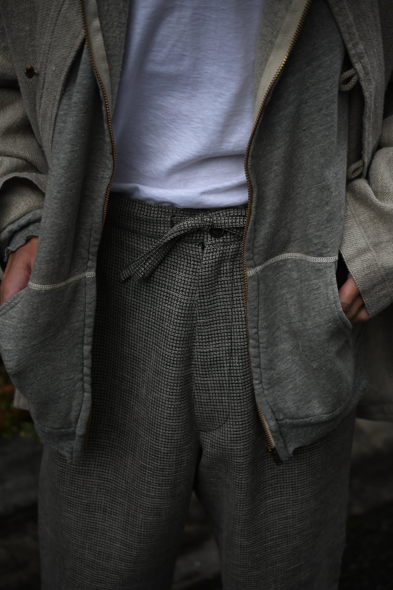 60’s前後に生産されていたヴィンテージの個体をベースに、これまでのZIPフーディーよりも更にレイヤードの一手を担うモノとなった今作。4本針ミシンで縫い付けたポケット、伸びて緩くなったリブが助長させる崩れたシルエット感、所々に仕掛けられた手作業による自然なボロ。そして同様にビンテージ派生で辿り着いた生地は、裏起毛が経年変化で滑落し毛が抜けて薄手になった肉感を再現している。シルエットの妙と、気温の変化に大きく左右される事のない絶妙な生地の厚みは、今〜春先に必須の羽織りの中に自然と馴染み、職人の手作業で加工された色ムラと褪せた風合い、ヨレたZIPが様々な着こなしの中で静かな存在感を示す。この新たなフーディーは、無理なく物足りなさを埋める優れた1着として今後間違いなく重宝する予感がしてならない。