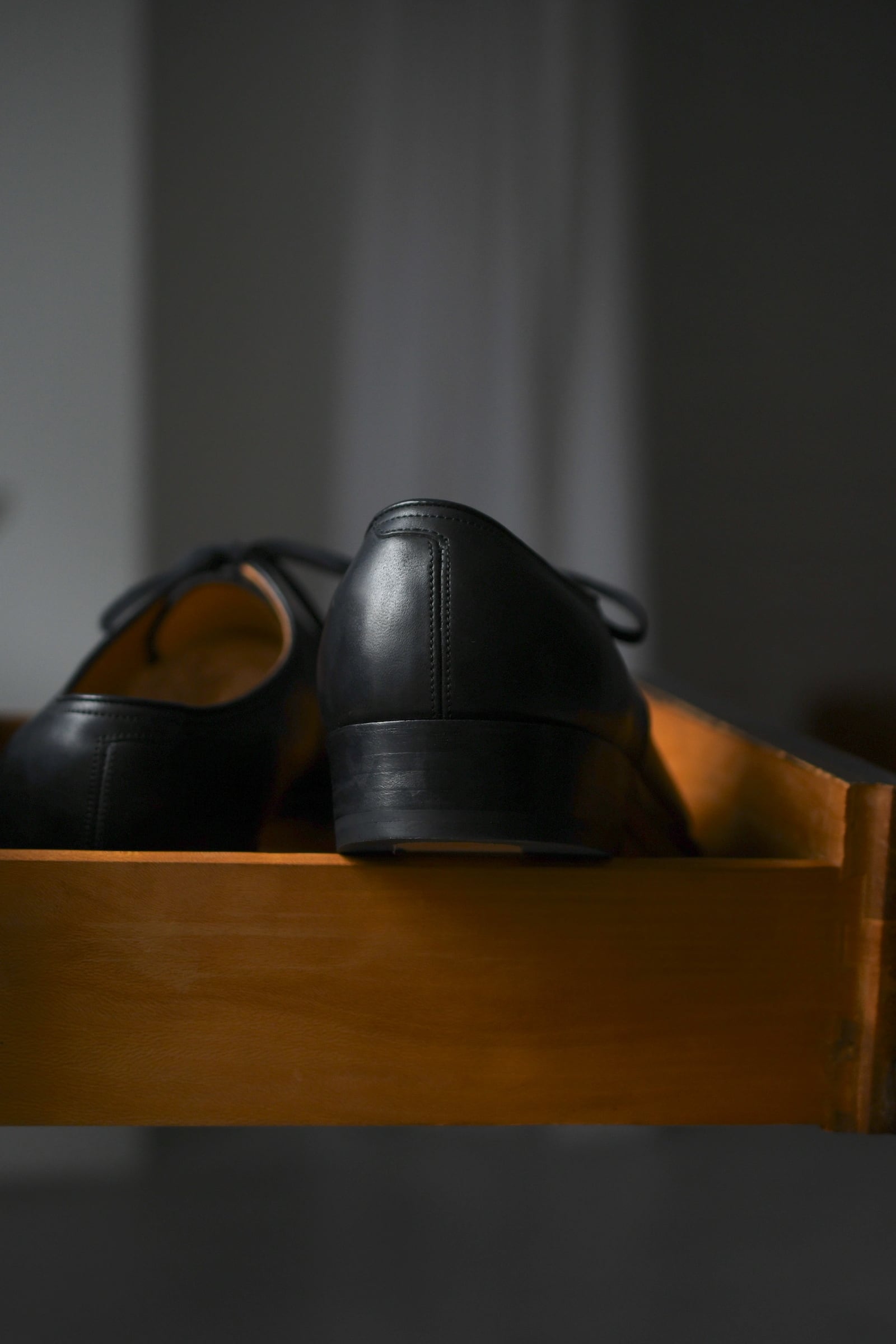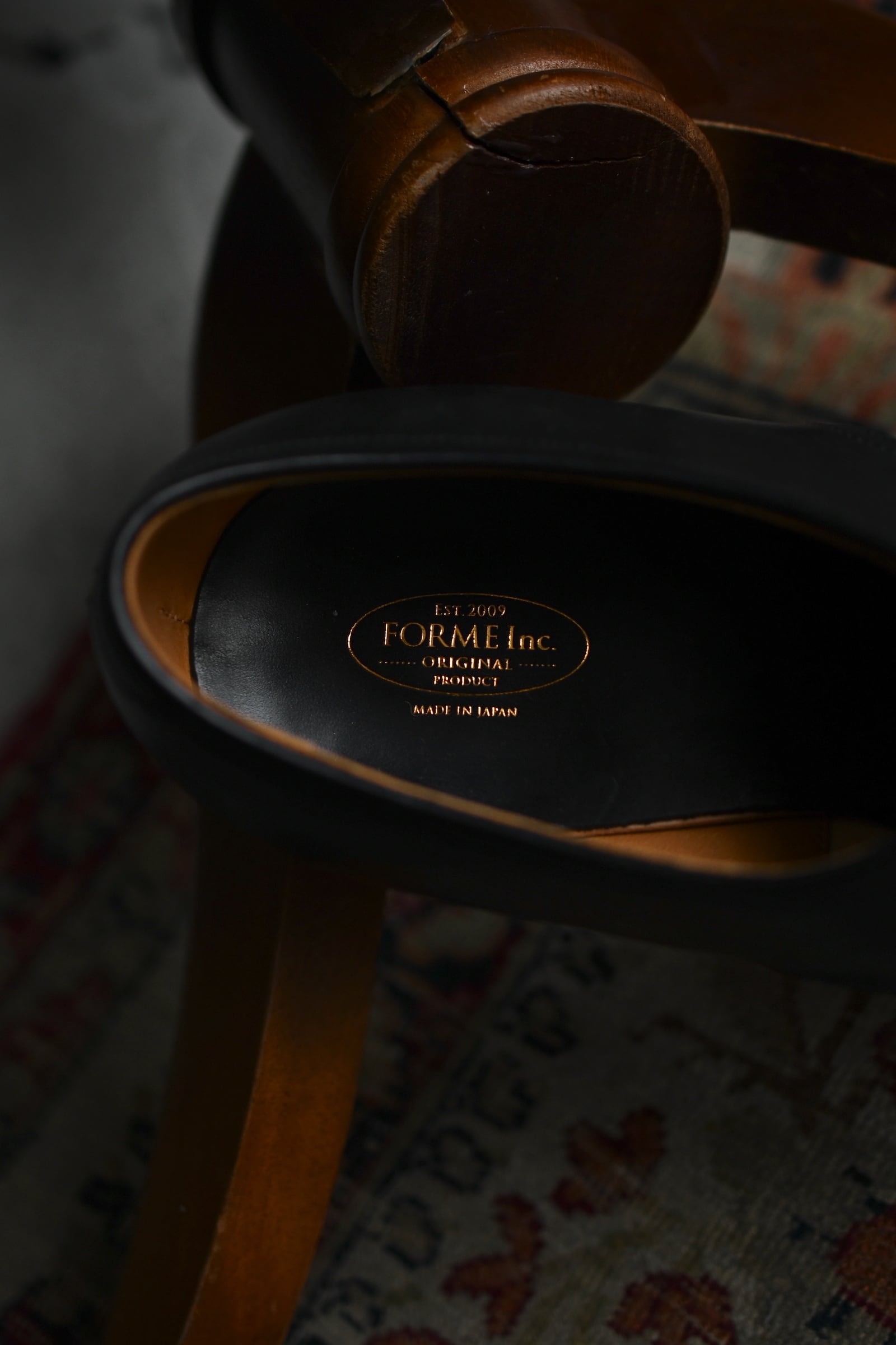 昨年の春に新しく誕生した”Low shoes”は、少しだけドレスから距離を置いた程よい抜け感と新鮮な履き心地が最大の魅力を誇る。ローファー同様に12番木型を使用した小ぶりでシャープなフォルムを土台としながら、トゥを極端に低くデザインする事で少しばかりのカジュアルさを与え、そこに手縫いで施されたモカが立体感とトラディショナルな佇まいをしっかりと演出。更にはトゥ部分に芯を入れない事で指の可動域が広がり、使用者は体感したことのないフィッティングを味わう事になる。そして今作はformeの顔的存在ともなったClass(馬革臀部)を落とし込み、独特の艶感とダイナミックに皺を刻んでいく魅力的なエイジングも併せて得られるモノとなった。極上の履き心地と様々なスタイルに自然と馴染みながらワイルドかつ上品な表情に移ろう馬革の経年変化。紛れも無くこの 1足もformeの傑作と言える逸品だろう。
