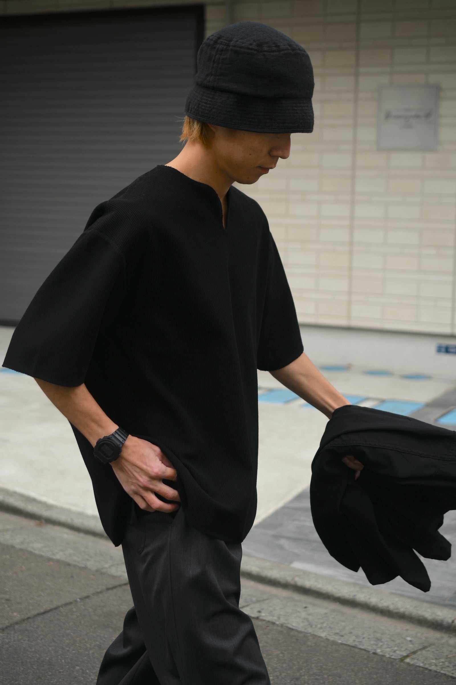 羽織り物が必須の今から暑さが続く夏を見据えると、今季もこの1枚は欠かせない存在になりそう。通常のサーマル生地とは異なり、表面の凹凸と反して裏面はフラットな仕様で着心地は良く、繊維レベルにまで及ぶ特殊な構造により型崩れを気にする心配はいらない。そして、吸水速乾性も兼ね備えているという徹底ぶりで、秘めたる機能的なポテンシャルは他の綿素材のカットソーを凌駕する。首元はVでも無くスキッパーとも異なる独特の曲線が美しく、抜け感の中に確かな色気が共存しており、単体としての魅せ方もりだが、首元から覗く"レイヤードの妙”は他では味わう事ができない大きな魅力と言えるだろう。ゆったりとしたフィッテイングだが、袖や裾の末端処理はリブを省く事で収まりが良く、カットソー以上スウェット未満の丁度いい肉感も相まって、インアウト共に多様な着方を堪能できる。