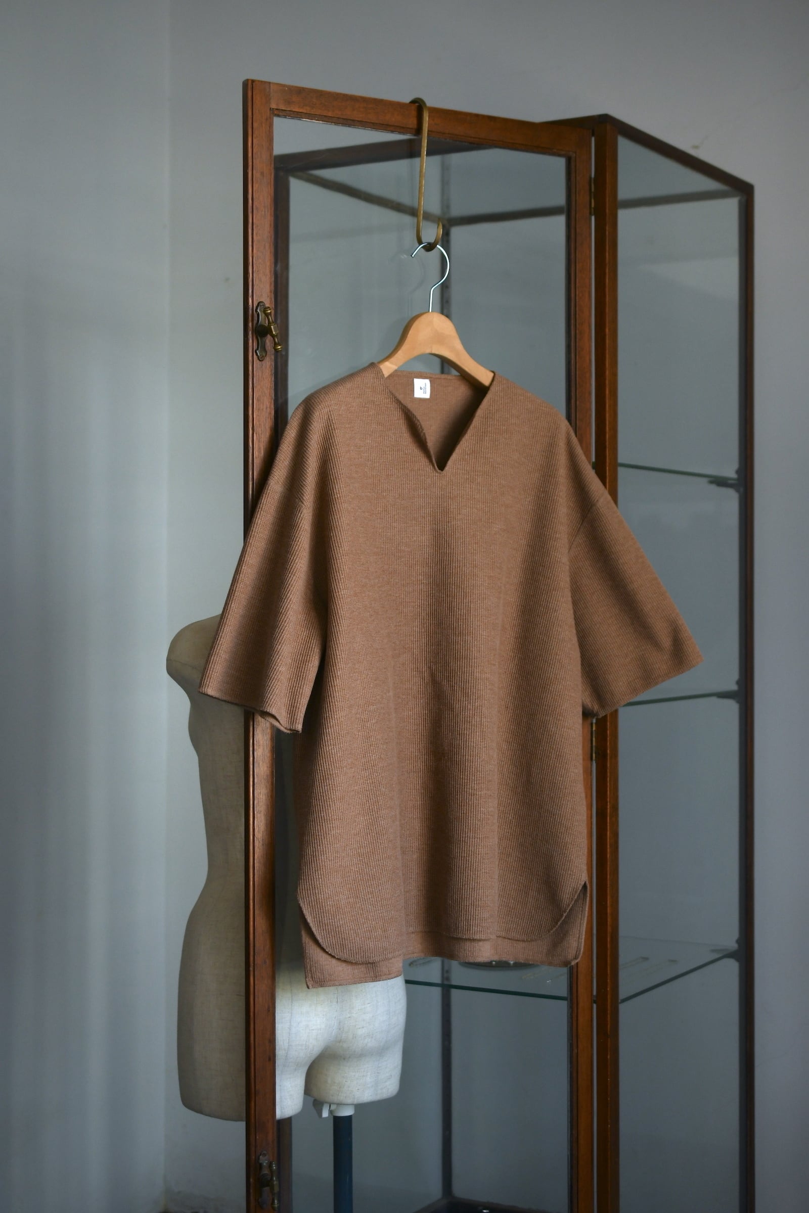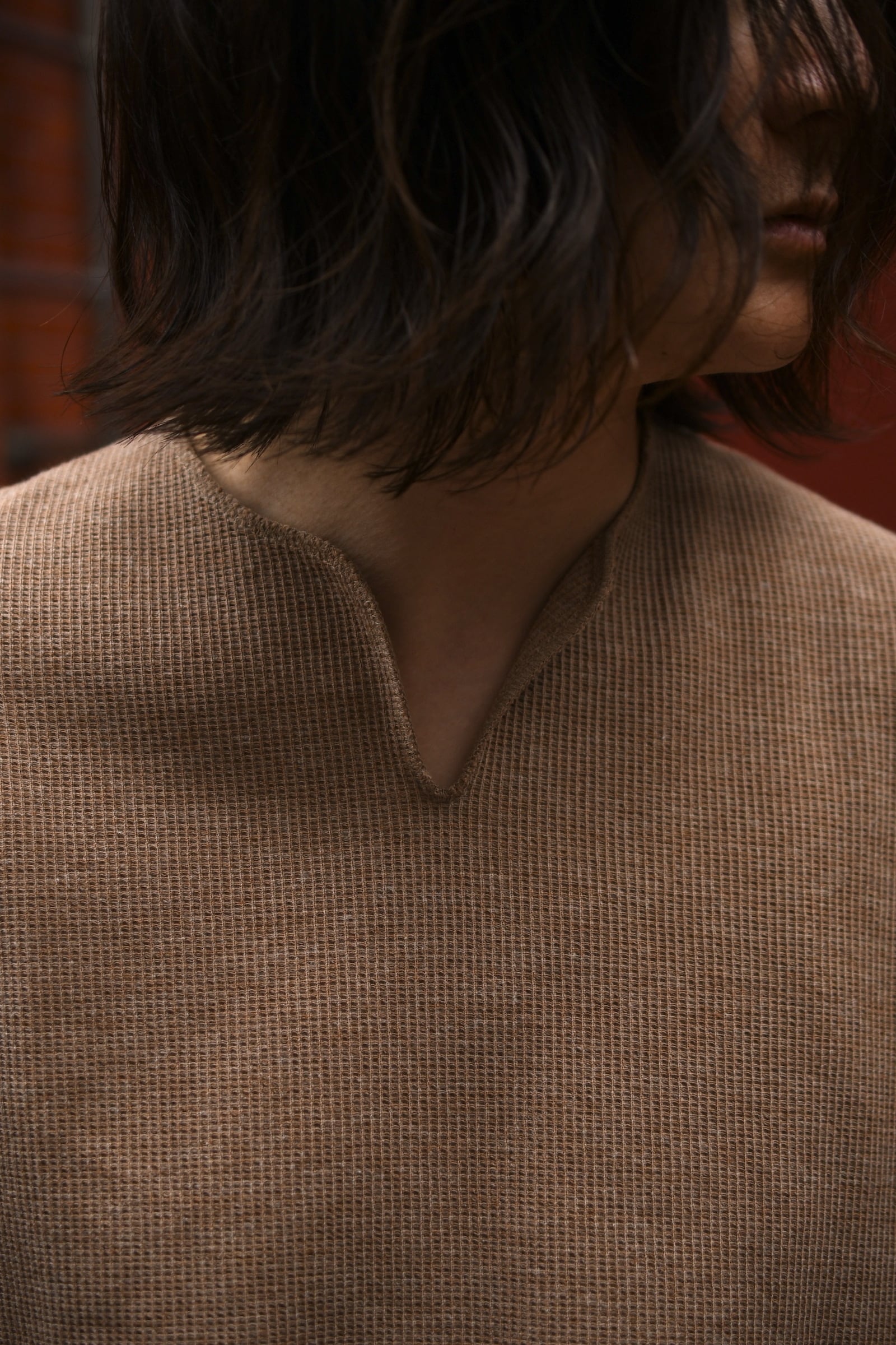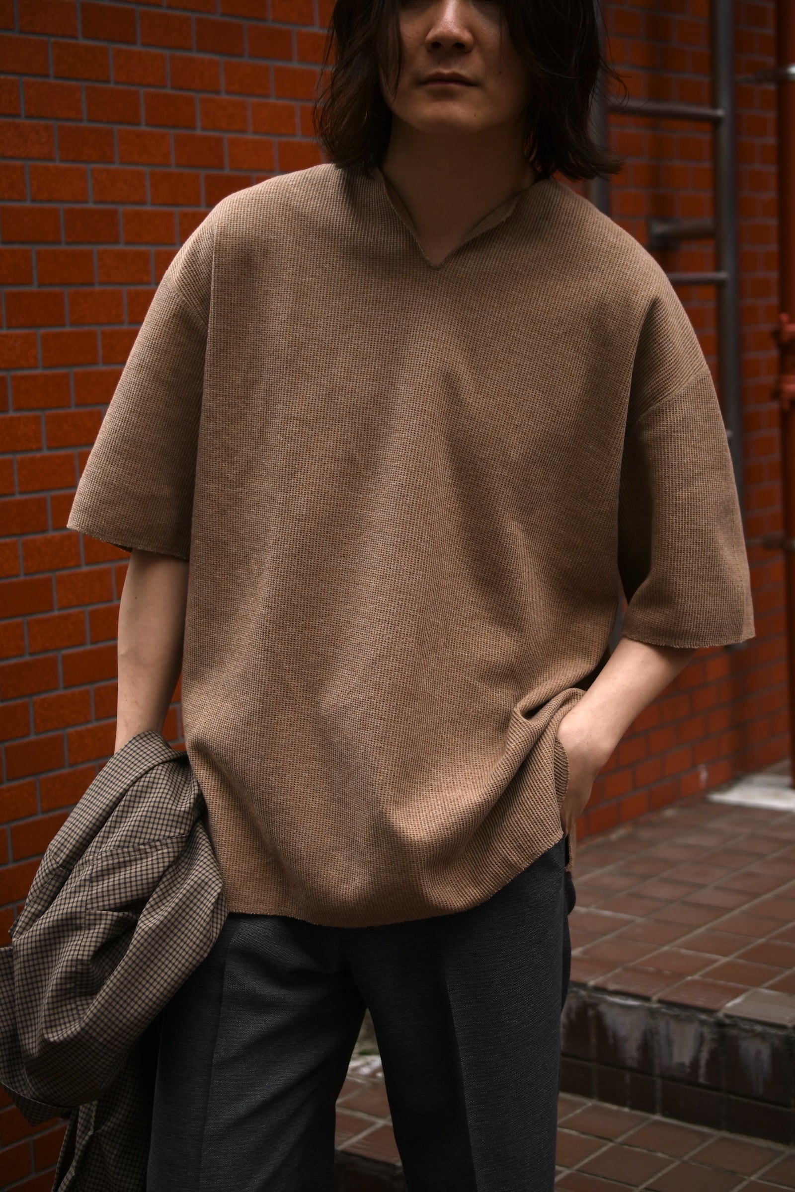 羽織り物が必須の今から暑さが続く夏を見据えると、今季もこの1枚は欠かせない存在になりそう。通常のサーマル生地とは異なり、表面の凹凸と反して裏面はフラットな仕様で着心地は良く、繊維レベルにまで及ぶ特殊な構造により型崩れを気にする心配はいらない。そして、吸水速乾性も兼ね備えているという徹底ぶりで、秘めたる機能的なポテンシャルは他の綿素材のカットソーを凌駕する。首元はVでも無くスキッパーとも異なる独特の曲線が美しく、抜け感の中に確かな色気が共存しており、単体としての魅せ方もりだが、首元から覗く"レイヤードの妙”は他では味わう事ができない大きな魅力と言えるだろう。ゆったりとしたフィッテイングだが、袖や裾の末端処理はリブを省く事で収まりが良く、カットソー以上スウェット未満の丁度いい肉感も相まって、インアウト共に多様な着方を堪能できる。