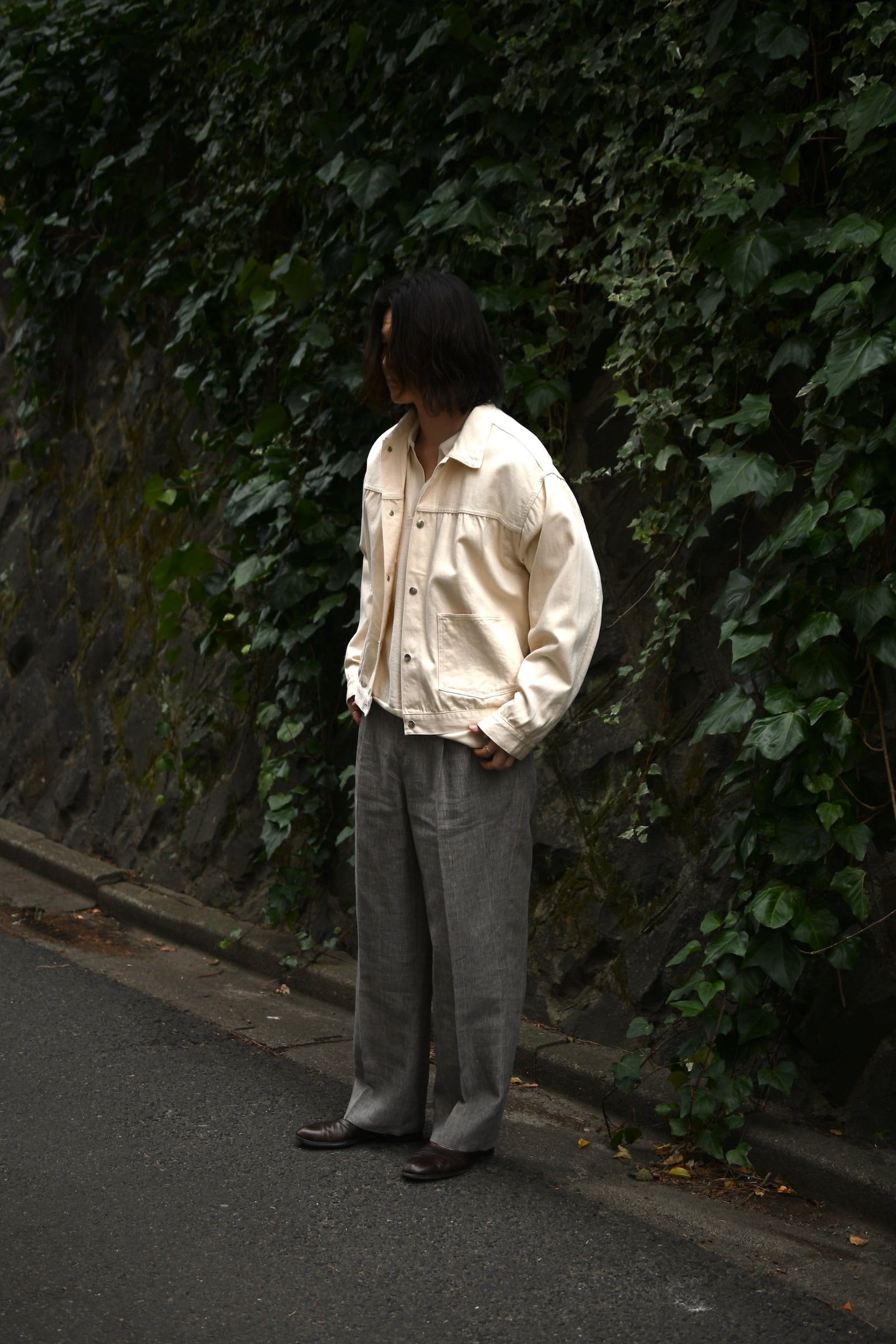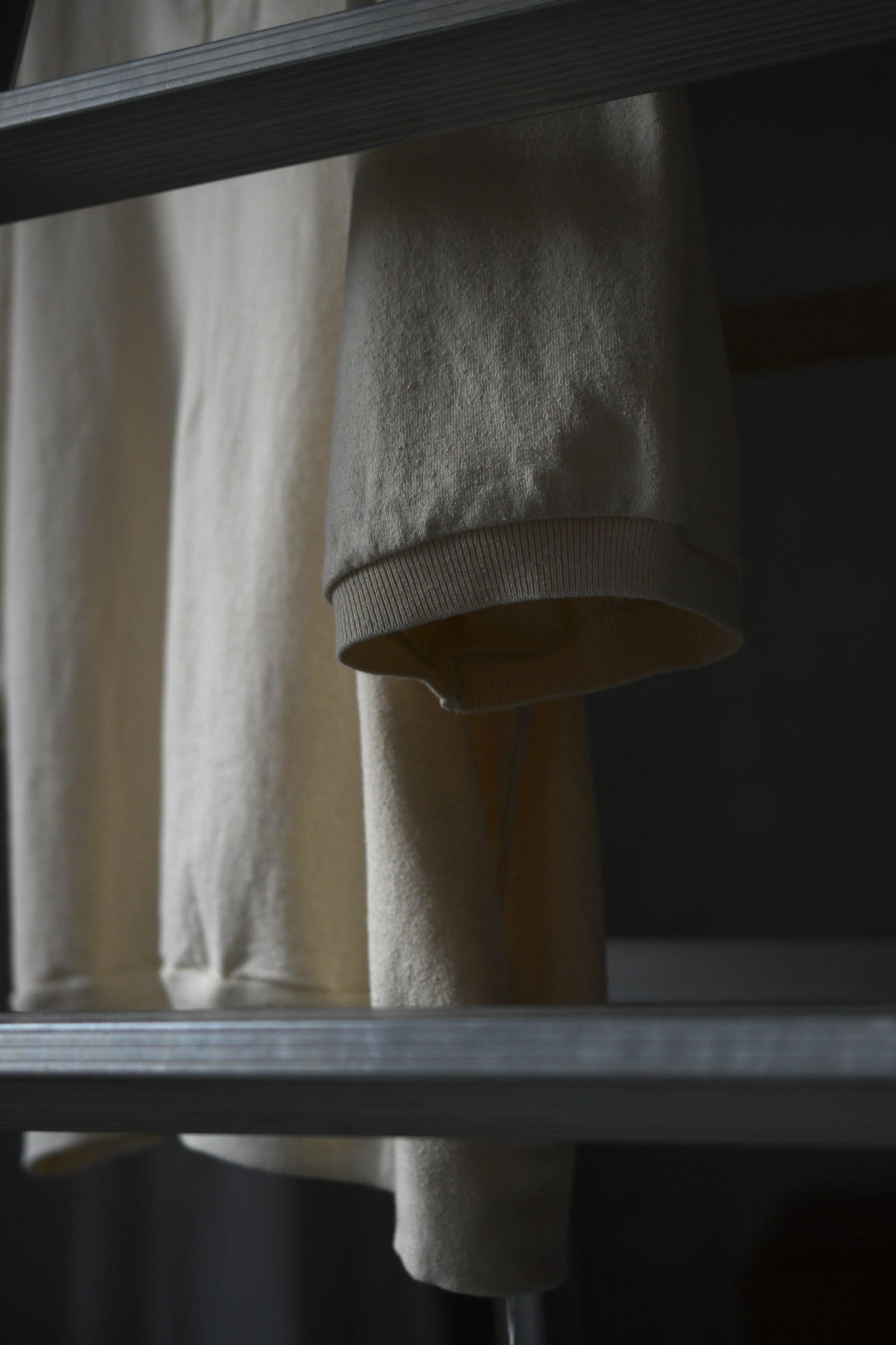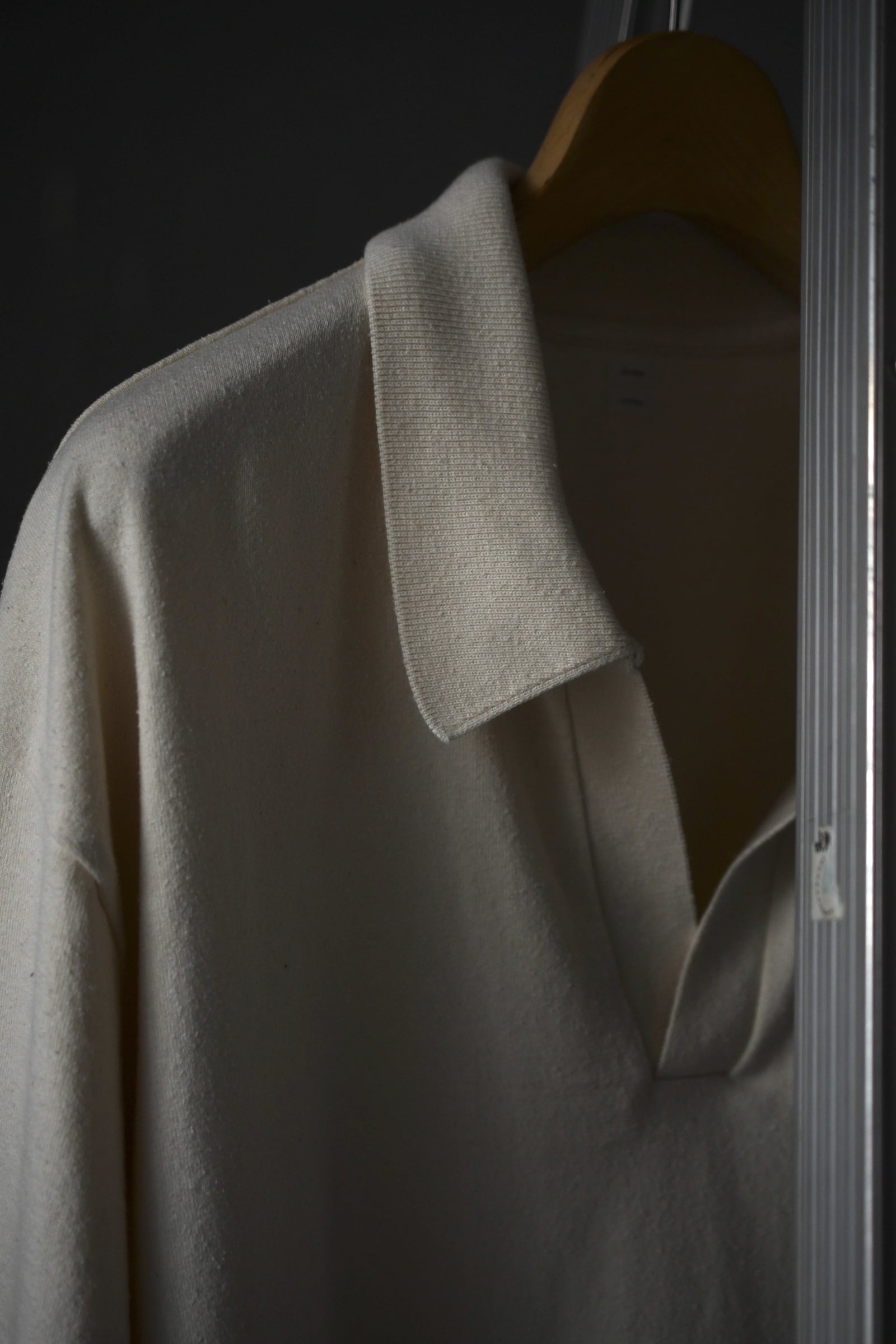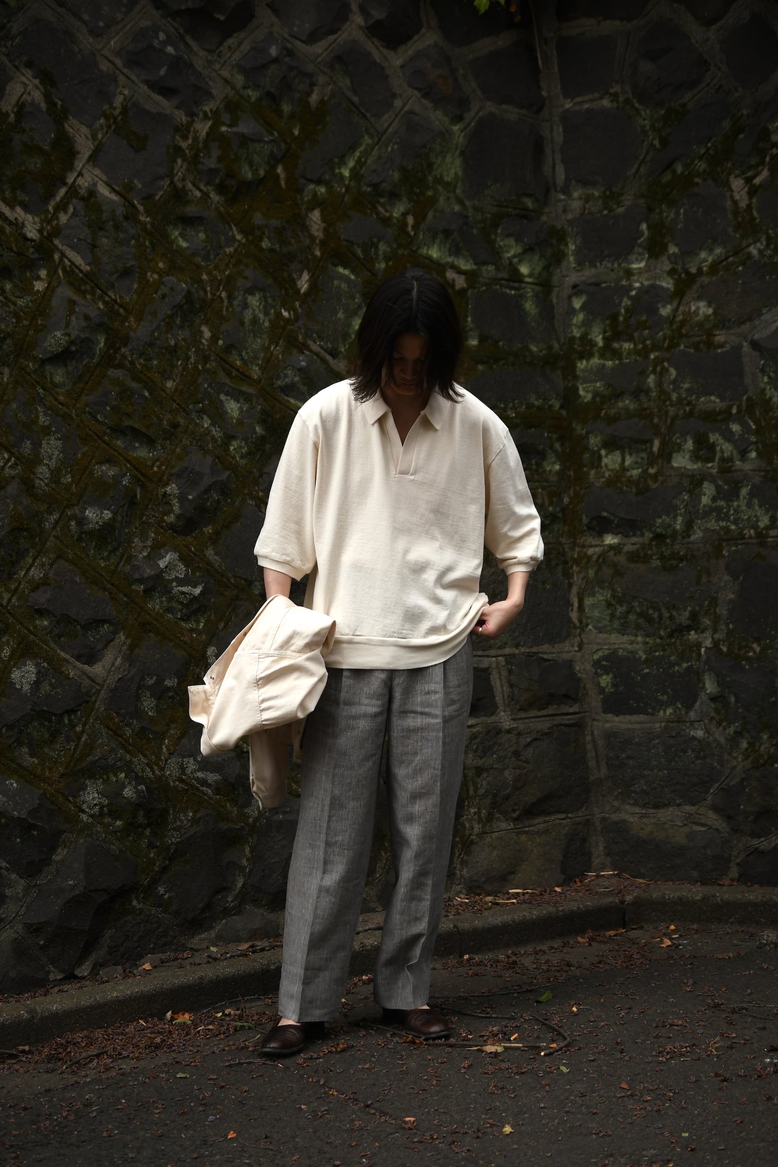blurhmsが手掛けているコットンシルクネップのシリーズは、単純に上質な素材でリラックス感を上手く体現している訳では無く、難題を簡単にやってのけている驚愕のシリーズと言える。蚕が自ら繭を割って出てくる事で得られるローシルクは、繊維の断面から生まれる独特のネップが生地に表情を与える反面、その滑らかさが故にダレ感も発生してしまうデリケートな扱いが求められる高級繊維。このシリーズでは、そういったシルクの特性を考慮し、単純にコットンを混在させる手法では無く、シルクを支えるように綿を走らせ、「素朴なネップの表情感」「滑らかな質感」「耐性の高さ」を実現。素材同士の良さを損わせる事なく見事に1つの生地へ落とし込ませている。新型となる半袖仕様のスキッパー型は、緩さと締まりのメリハリが効いた程よく緩いシルエットバランスと、広さを抑えた首元のVラインが特徴的で、夏の主役を担いながら今時季はインナーとしても大いに活躍してくれる。
