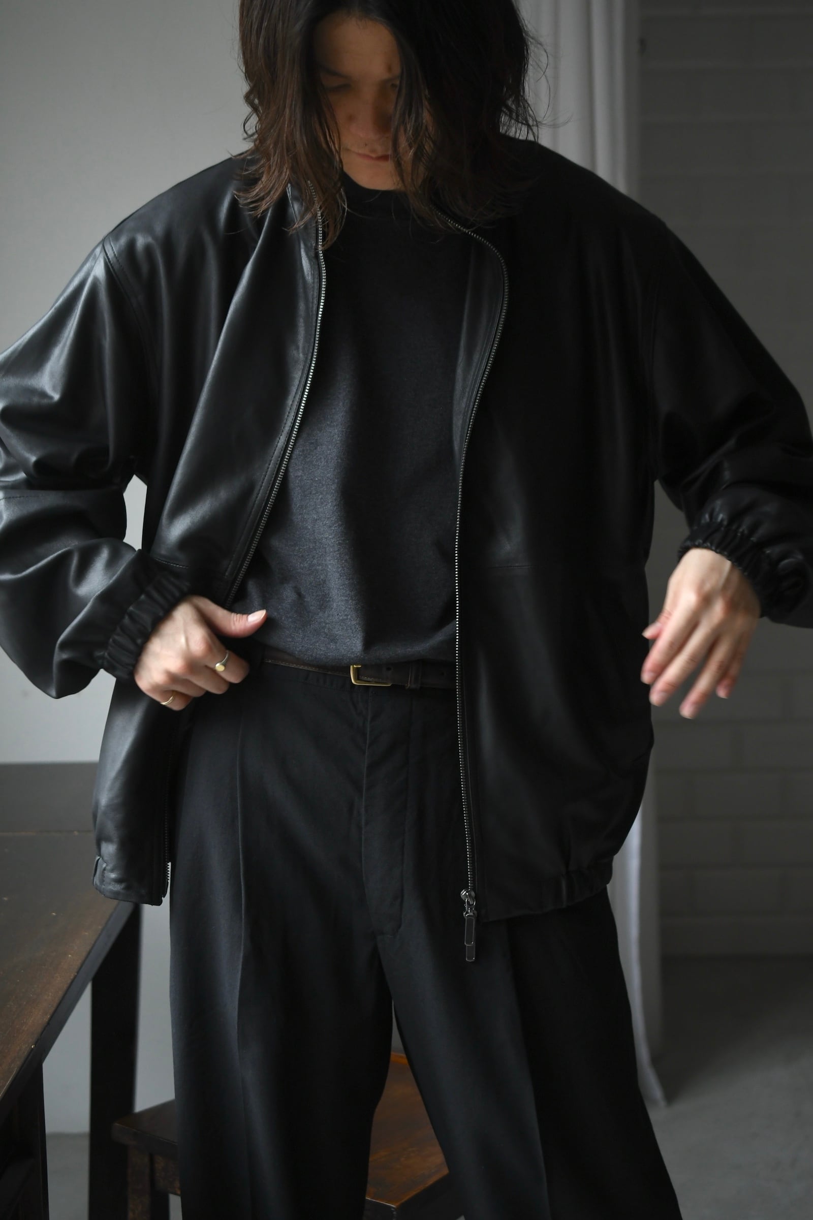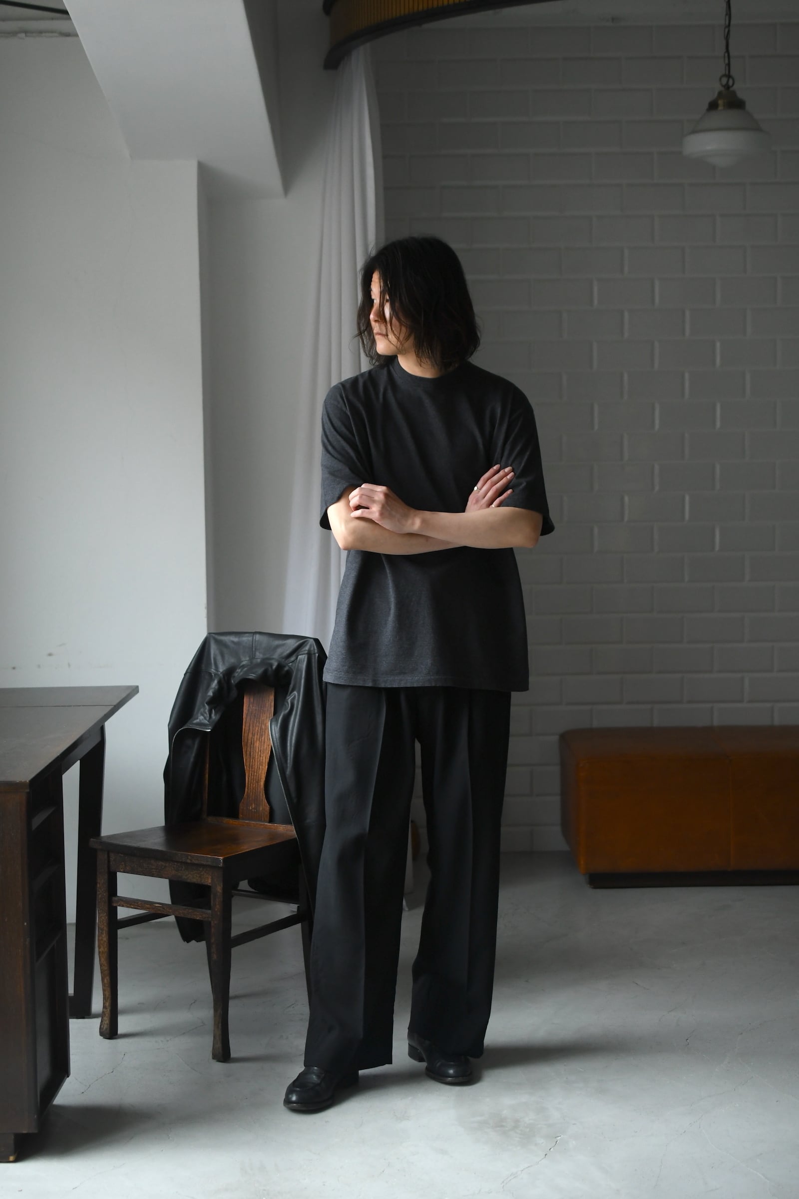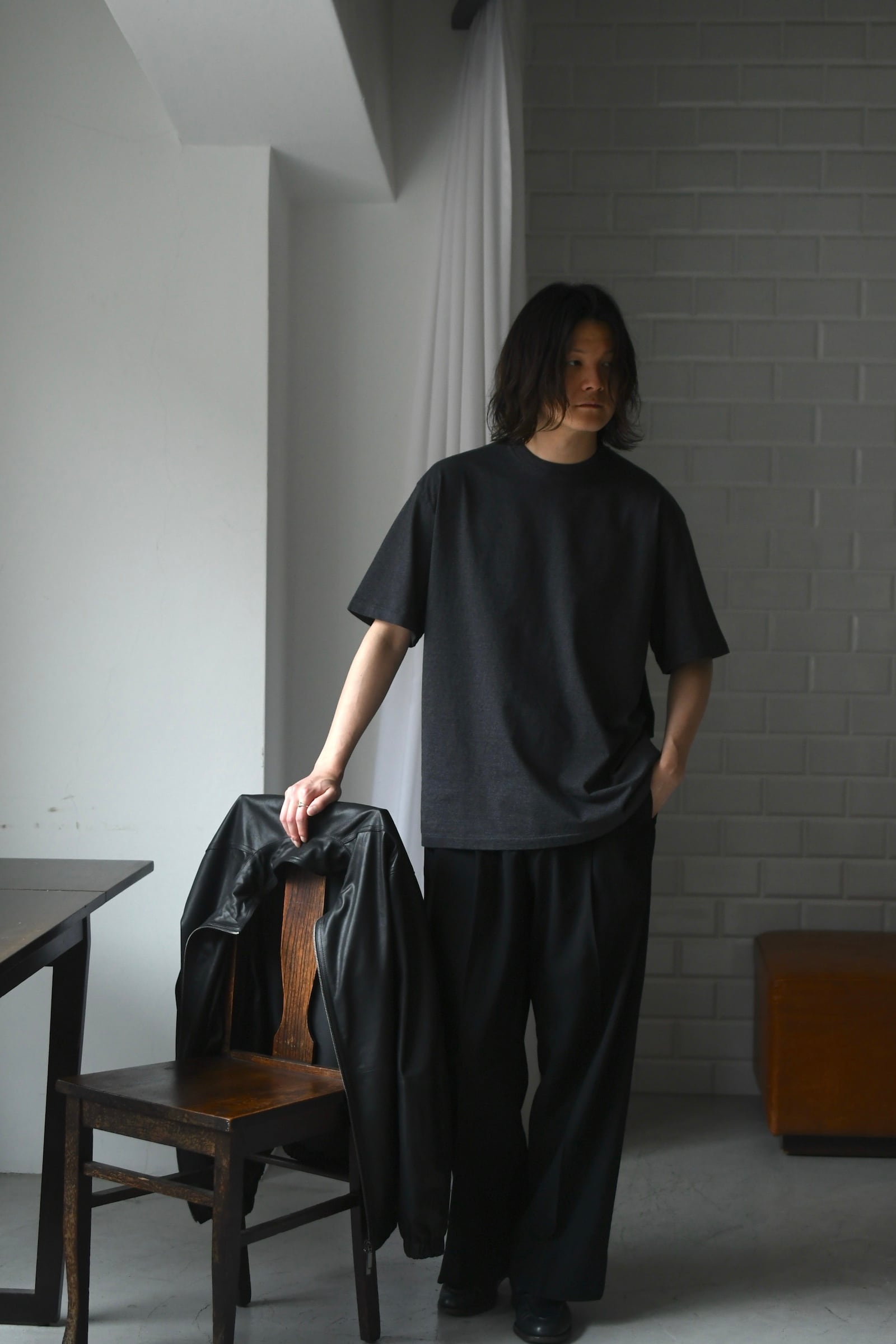 色や同サイズを買い足しながら、既に長いシーズン共にしている方も多いA.PRESSEの天竺Tee。空紡引きしたスビン糸を使用して編み立てた生地は、内側に撚りがかからない特徴により、湿気の多い日本の気候にしっかりと適した軽くドライタッチな肌当たりを誇る。加えて柔らかいタッチ感が相乗することにより生まれる快適な着心地も大きな魅力だ。そしてアメリカンアンダーウエアの魅力を継承したバランスは、上物から覗くクルーネックの見え方にも確かな拘りを感じさせる。そして多色の展開がある中、nariwaiでは濃淡の異なる灰色のみを仕入れた。ダークトーンに程よい軽さを与える『M.GRAY』と、ライトカラーに絶妙な重さを加える『GRAY』。些細な違いに思えるが、是非ともお好みで使い分けながらスタイルの拘りを更に深く追求して頂けたらと思う。