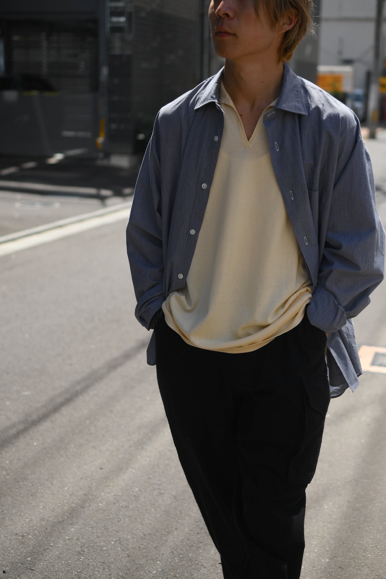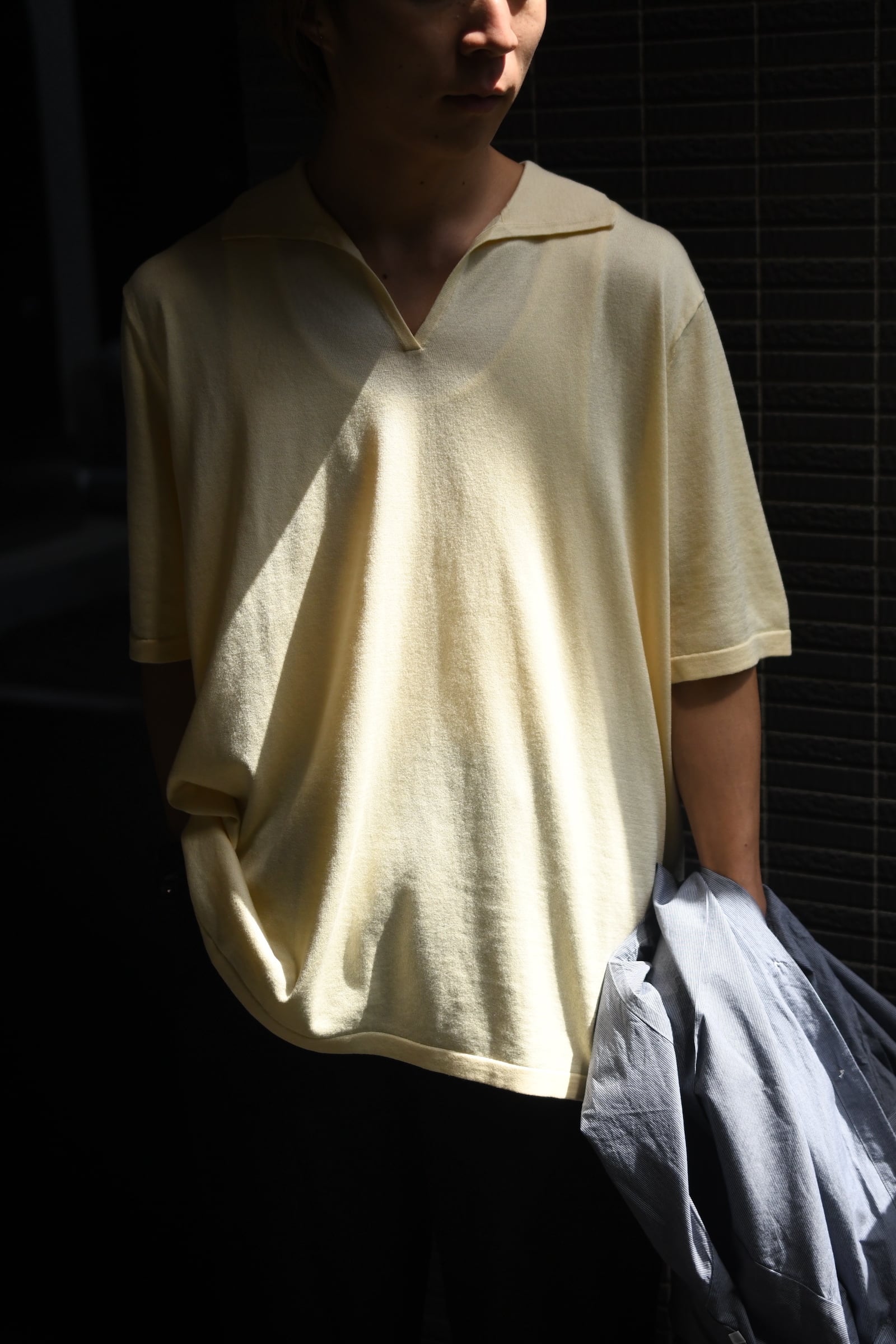 シルクの上質な光沢感と滑らかな肌触り、そしてコットンの優しいタッチ感と通気性が抜群の快適さを付与させているBISOWNのサマースキッパーニット。贅沢にもたっぷりと生地分量を取りながら、性別、体型問わず誰が着てもバランスの良いフリーサイズで制作されており、夏のメインとして申し分のない1着である。また、深さを抑えた首元の開きとハイゲージの仕立てによりシャツ類とのレイヤードも相性が良く、インナーとしても活躍のシーンは多岐に渡るだろう。