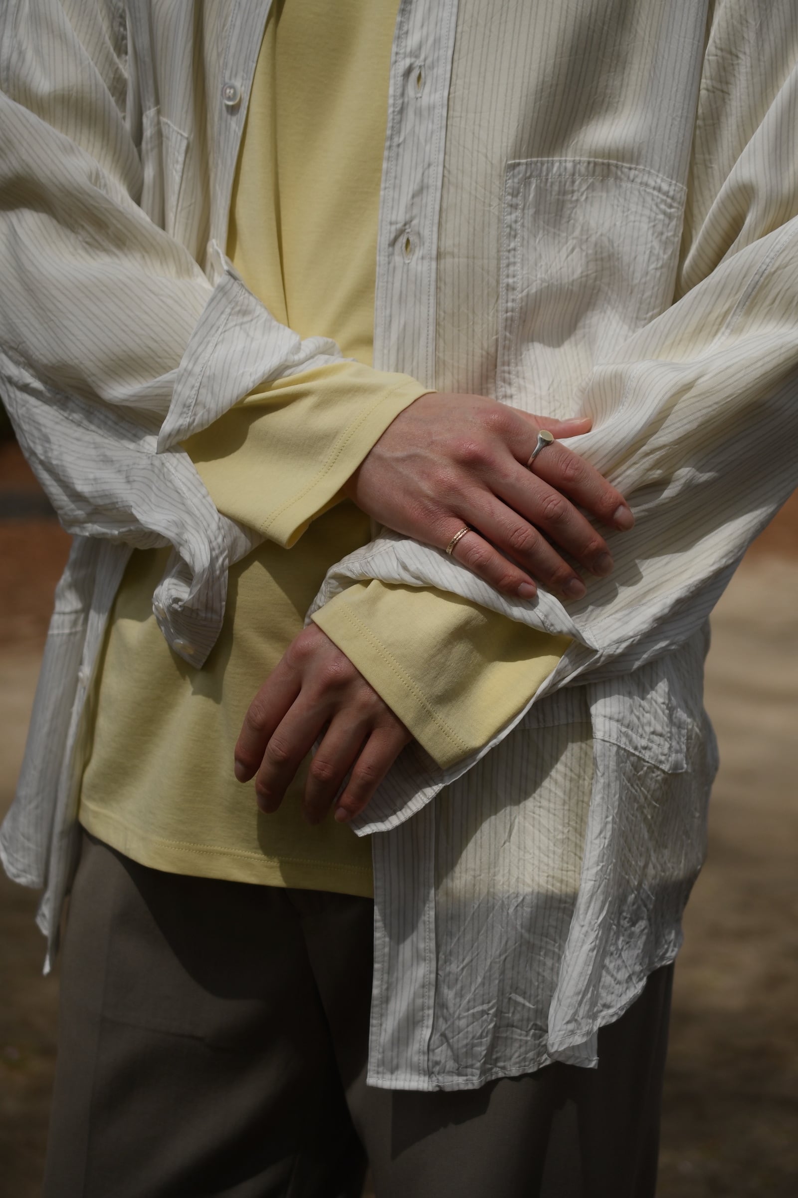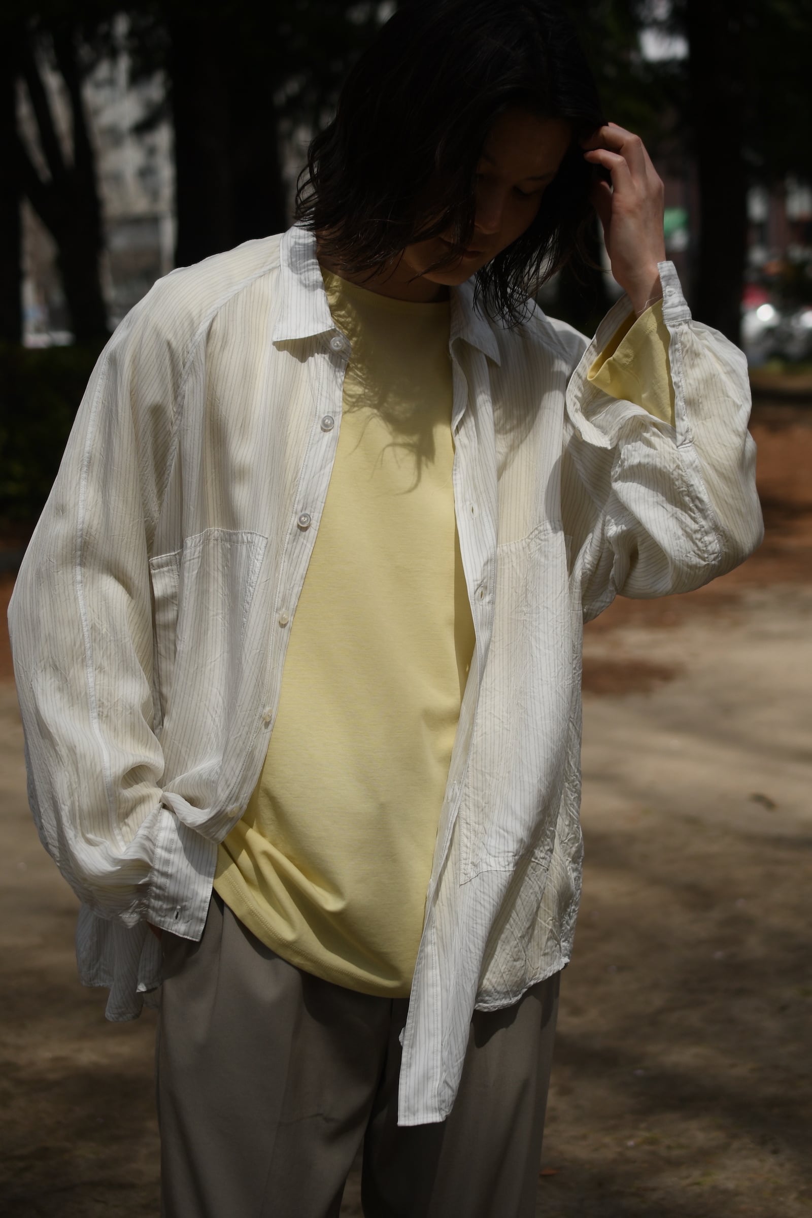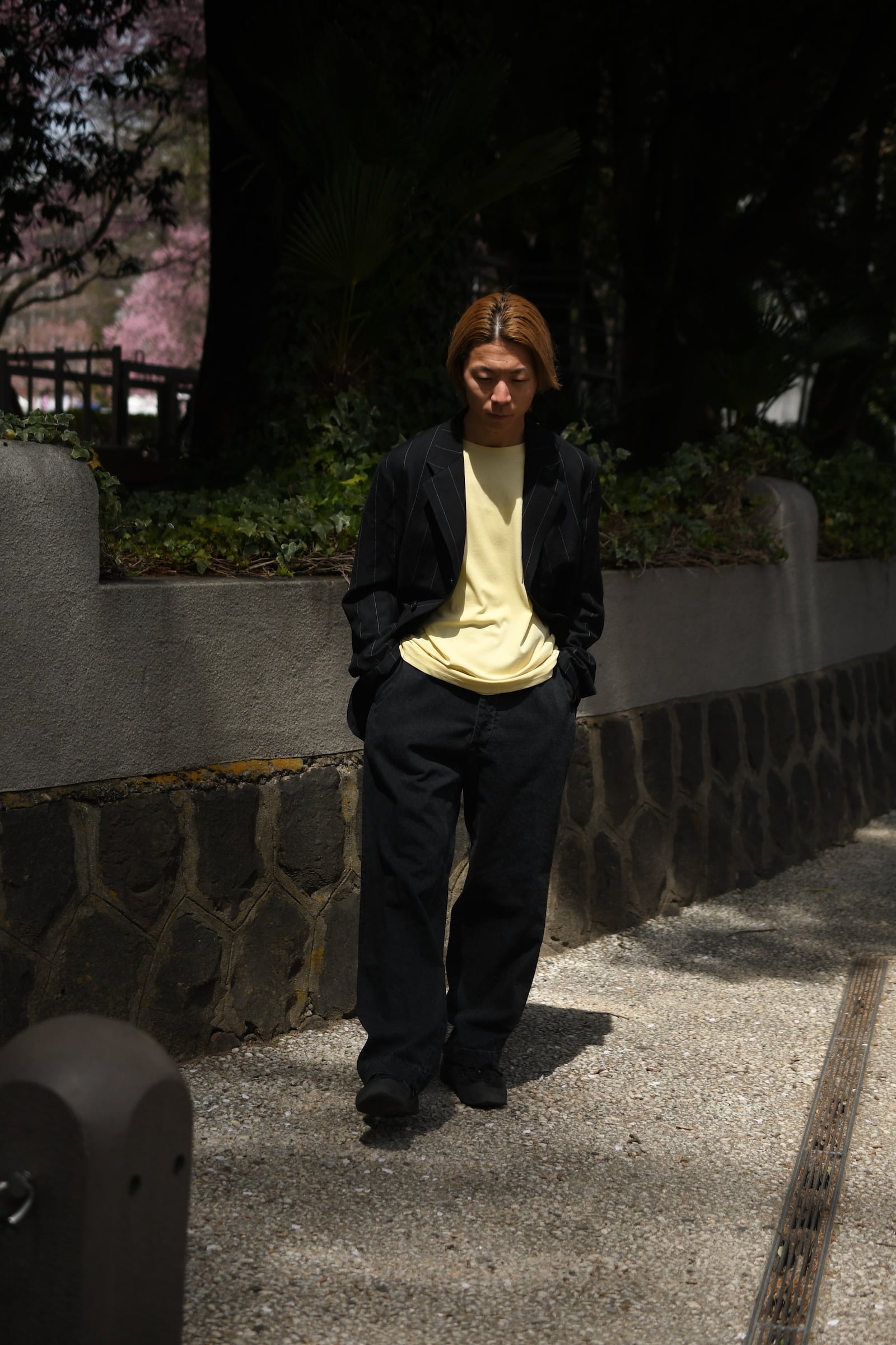 バスクに求める開放感はありつつも、同時に懸念してしまう過度な露出は抑えられている理想的なBISOWNのバスクシャツ。ネック後方はフラット、前方は少し前下がりのラウンドが与えられており、露出は控えめだが色気はあるというバランスの良さが感じられる設計である。生地は希少なスーピマ超長綿を用いており、ガス焼きの仕上げも相まってシルクのような光沢感と滑らかさによる着心地は本当に素晴らしい。生地のドレープが強まっている分、インナー使いにも重宝する1着であり、必然とこの時季から出番は増えていきそうだ。チープにならず、カジュアルにも寄りすぎない。その適度な距離感で感じられるモダンで洗練された佇まいは、この1着ならではと言える。