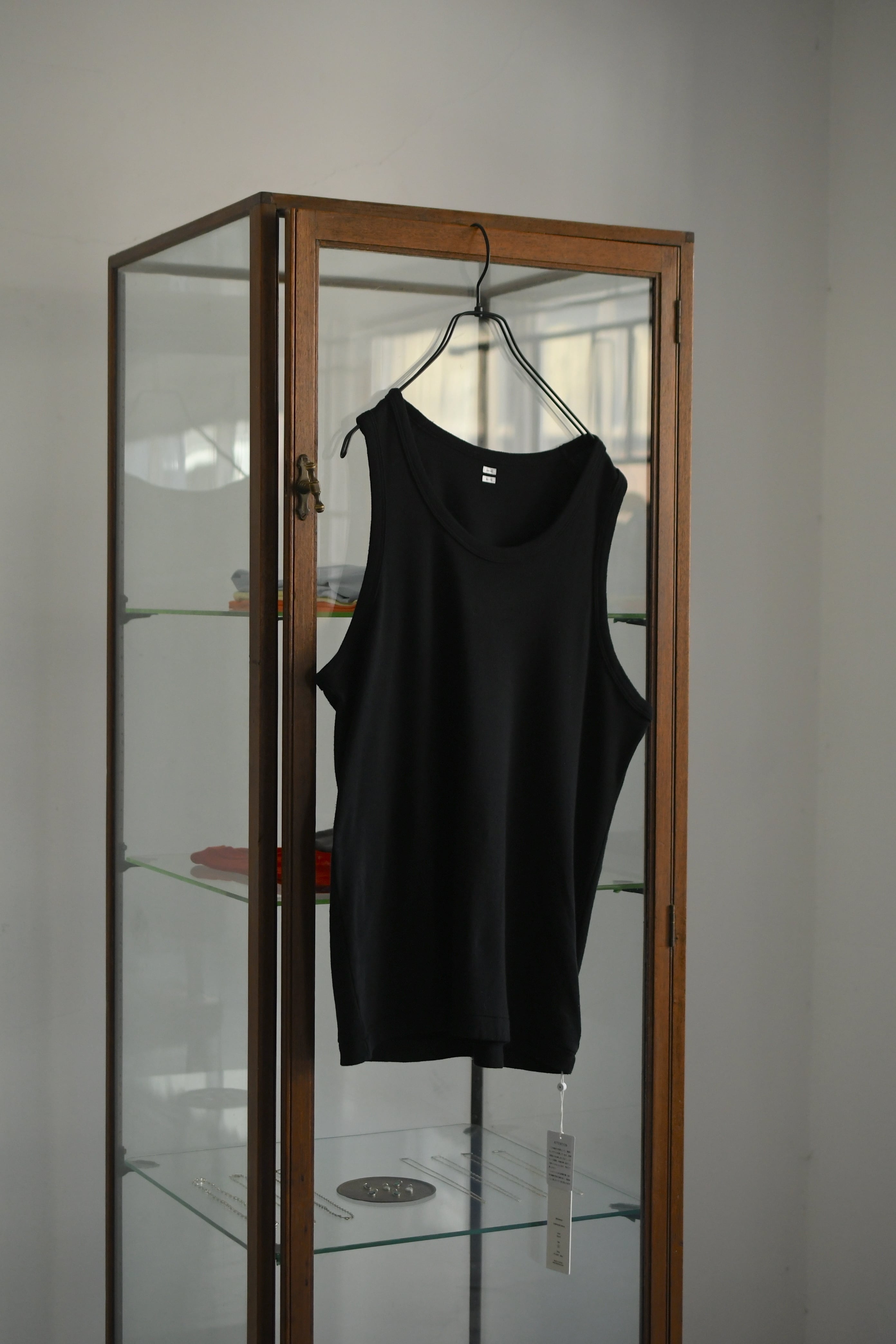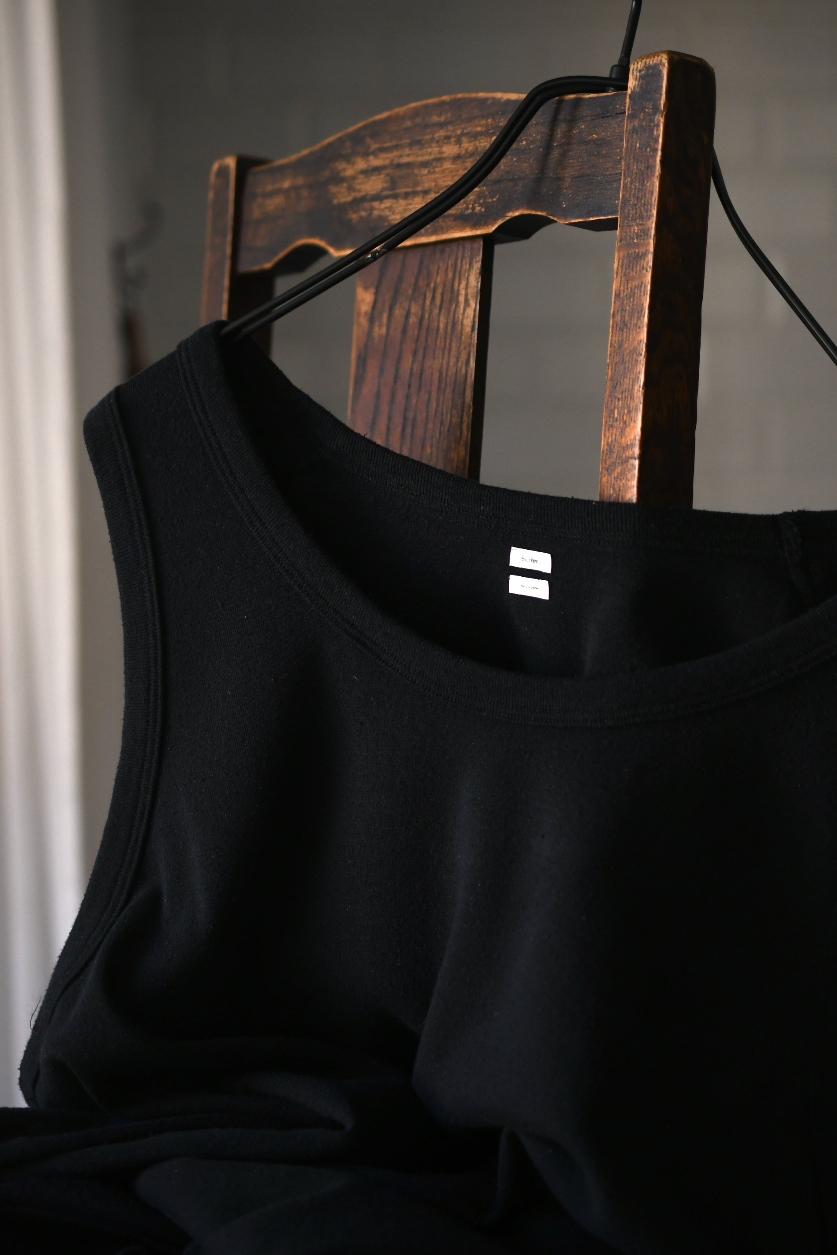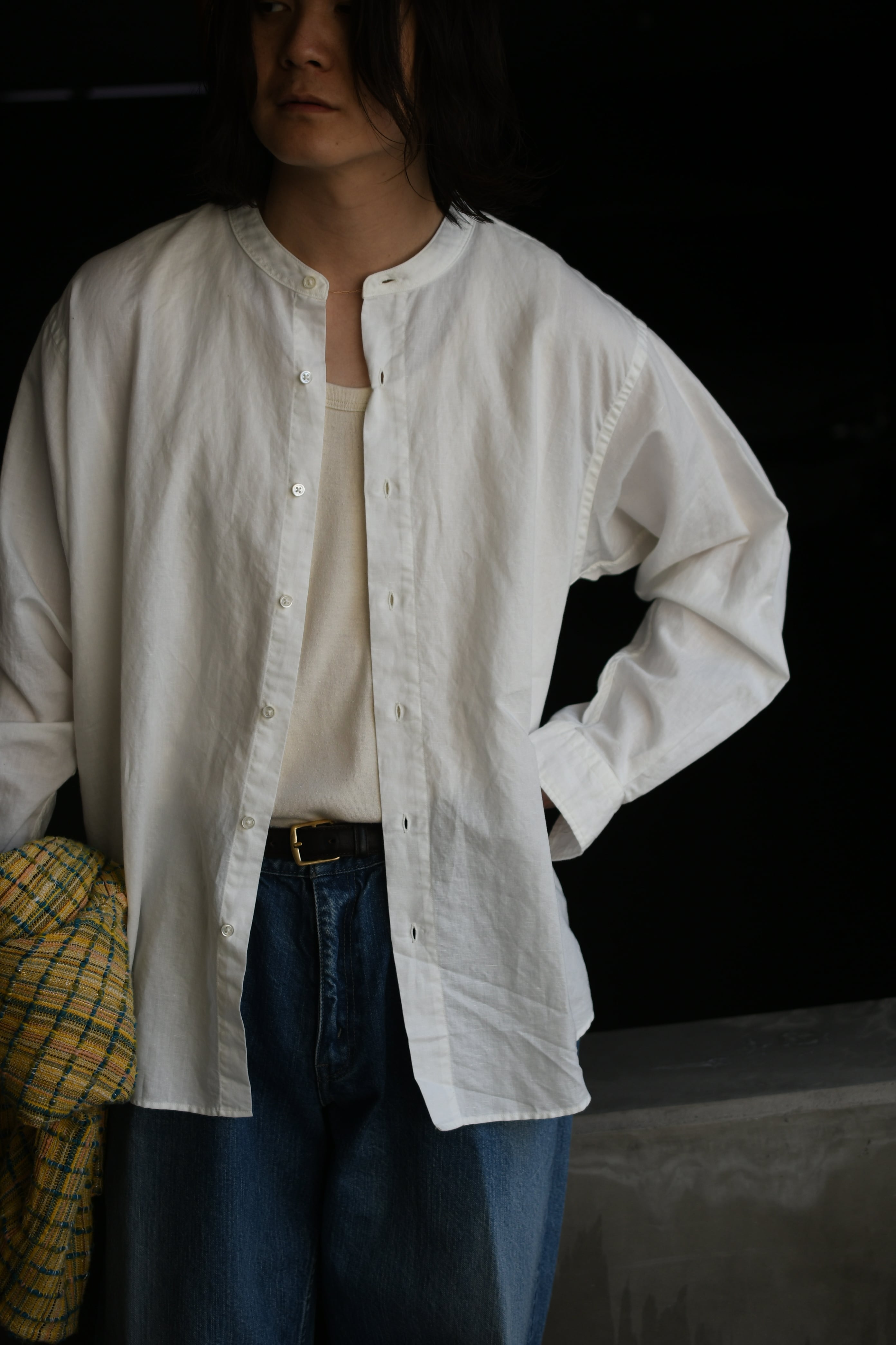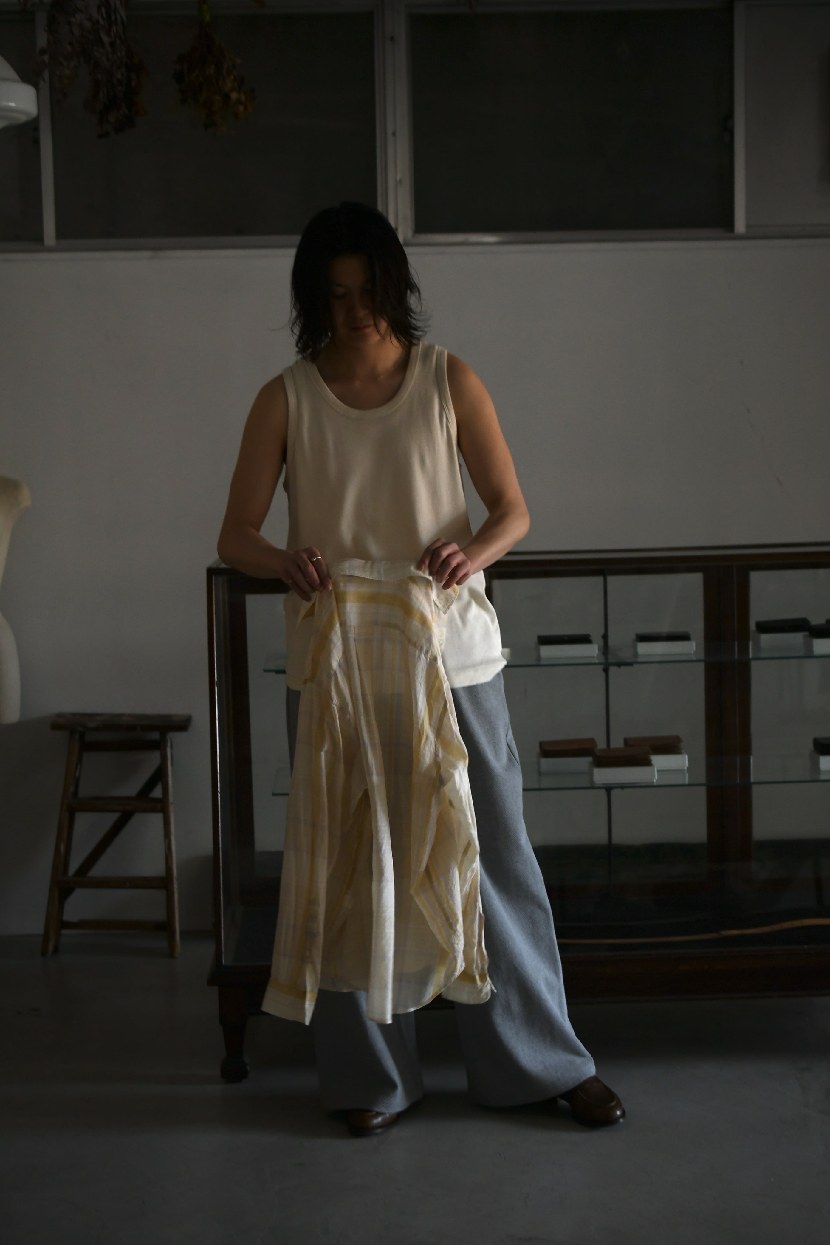 もしも、あの生地でインナーがあれば。そんな淡い期待が”求めている見え方”を体現してカタチとなった。ローシルクとコットンを上手く掛け合わせてデメリットを排除したblurhmsのコットンシルクネップを落とし込み、今季新たに誕生したリブタンクトップ。夏に想定し得るシャツやジャケットのスタイルで欠かせないインナーは、清涼感とケアの容易さ、そしてチープにならない印象感が重要に思えるのだが、この1枚はそれらの要素を十分にクリアしてくれていた。シャツの釦を2~3つ程度開けた時に覗く丁度良いネックの高さとラウンド感、そして透けないが厚くも無い肉感。後者に関しては羽織りに限らず、スウェットやニットのインナーにも好相性であり、シーズンレスで重宝する事になるだろう。