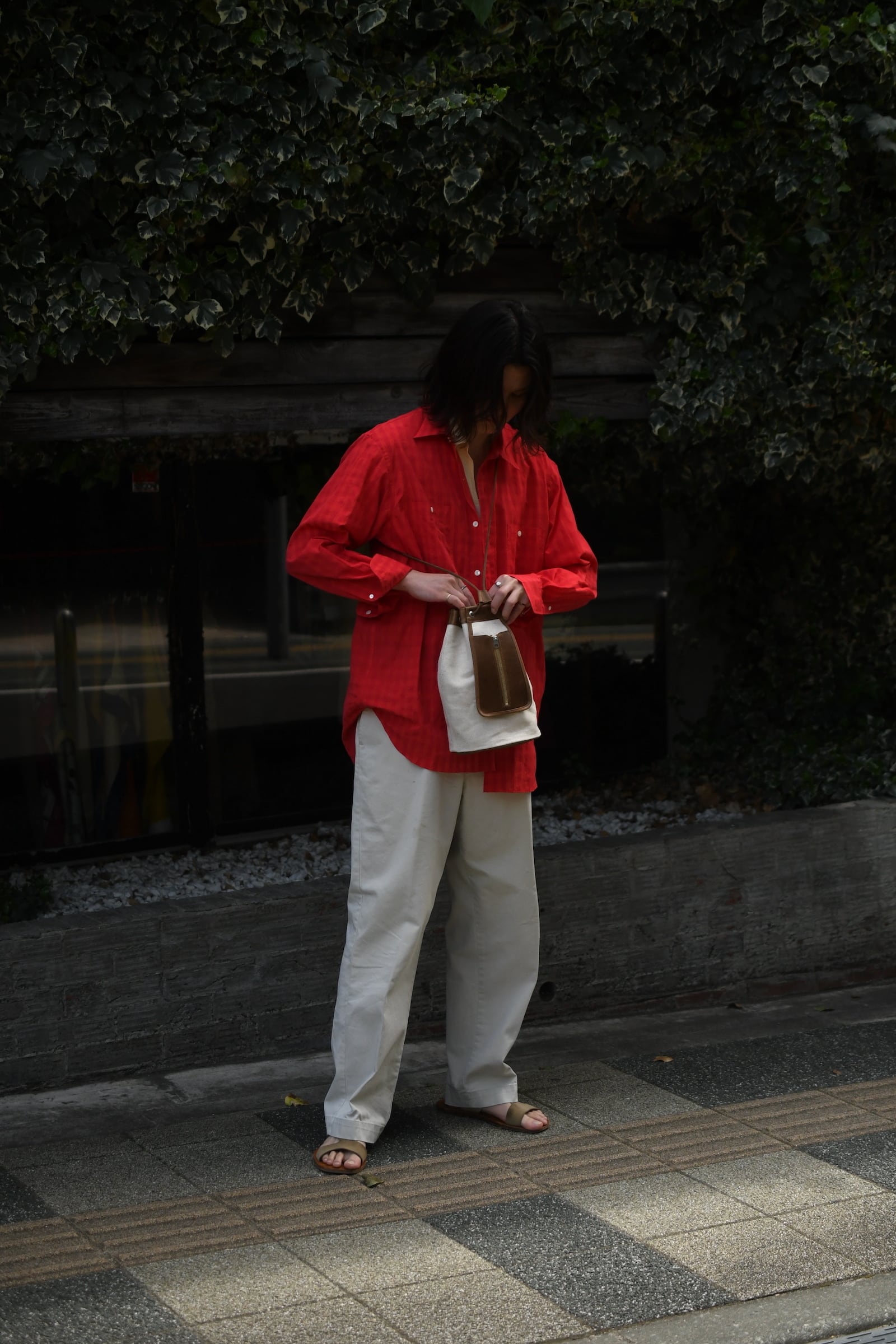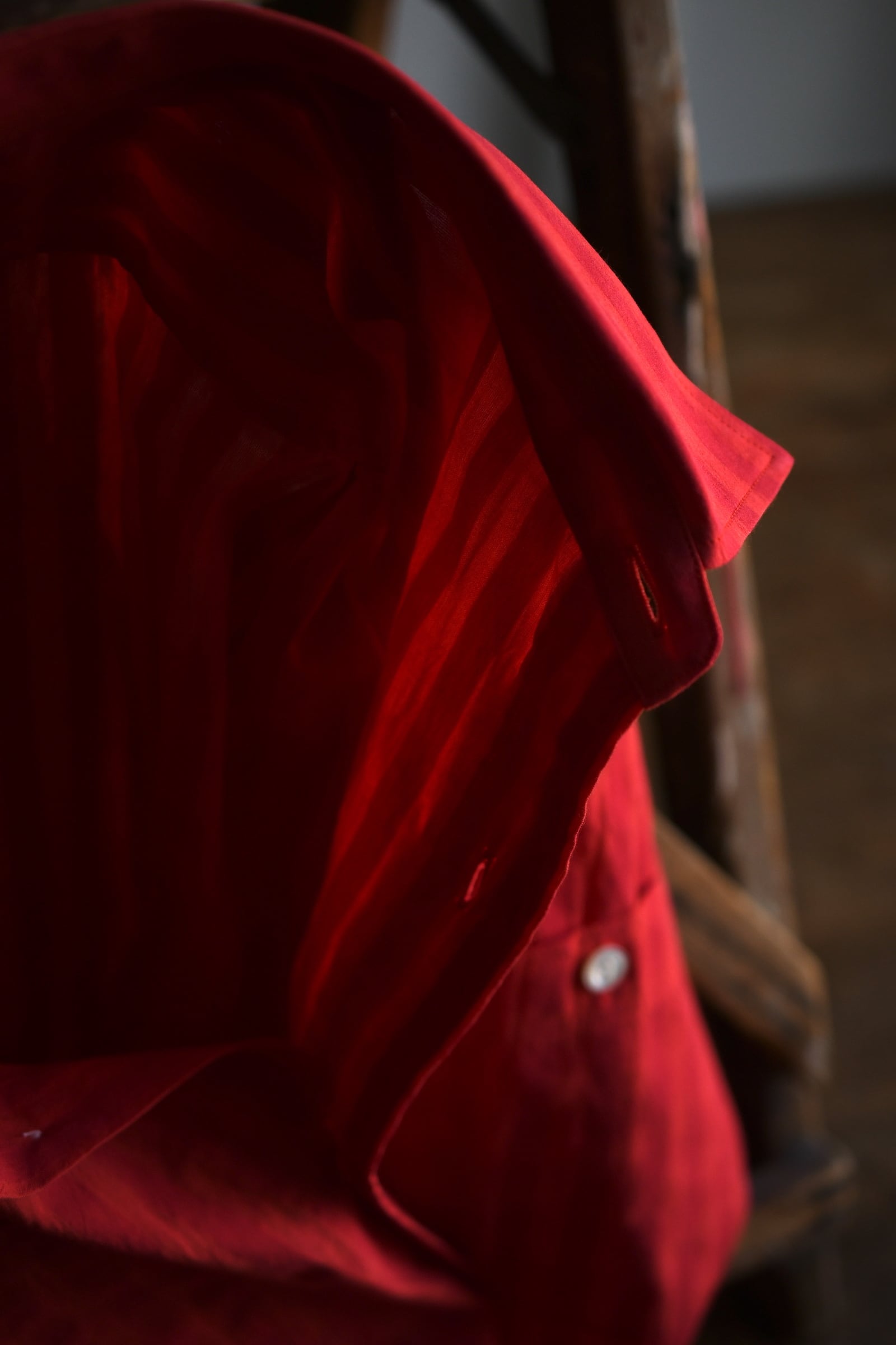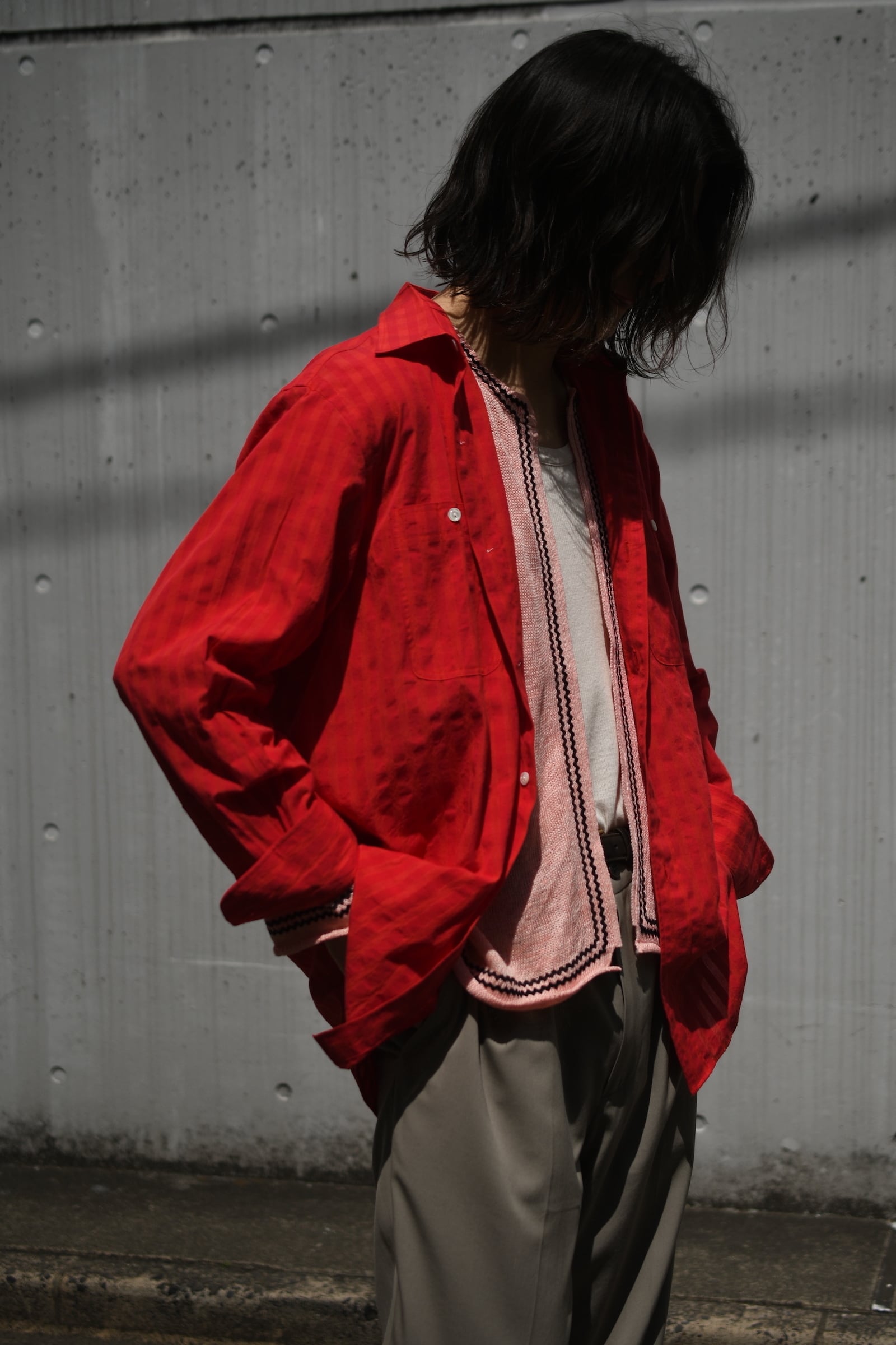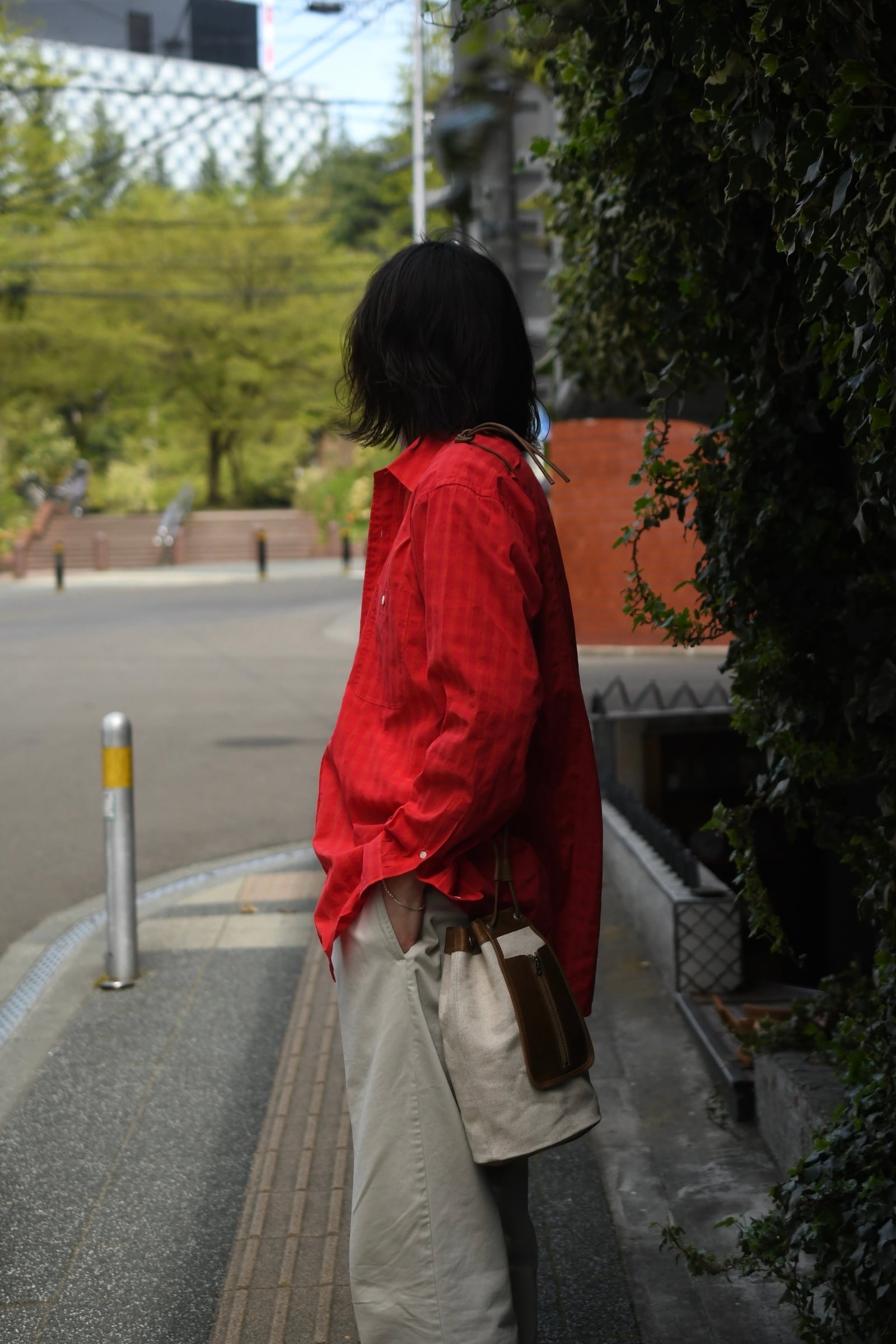 ハッキリとした柄では無く、ボヤけながら重なり合って生まれる独特の色合いに惹かれた。細番手の織物を得意とする日本のメーカーに依頼して製作したという生地は、経糸と緯糸それぞれで番手の細さと色に僅かな差を付ける事により奥行きを持たせたトーンオントーンのギンガム。”凛とした赤”と”掠れた赤”が織り成す表情は、カジュアルさ以上に色気を感じさせ、春夏の単調な装いに良いニュアンスの変化を与えてくれる。そしてシアー感も伴っている事で想像以上の”清涼感”を秘めており、真夏も十二分に楽しめられそうだ。そして秋以降は外しのインナーとして間違いなく重宝する筈であり、是非とも春を始めする多くのシーズンで”魅惑の赤ギンガム”を堪能して頂きたい。