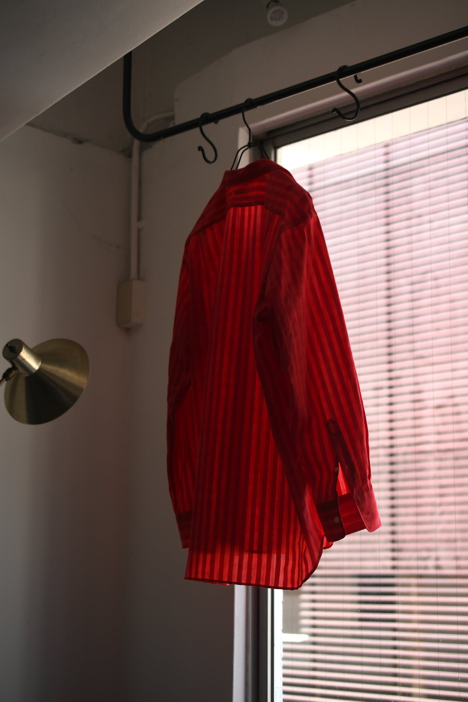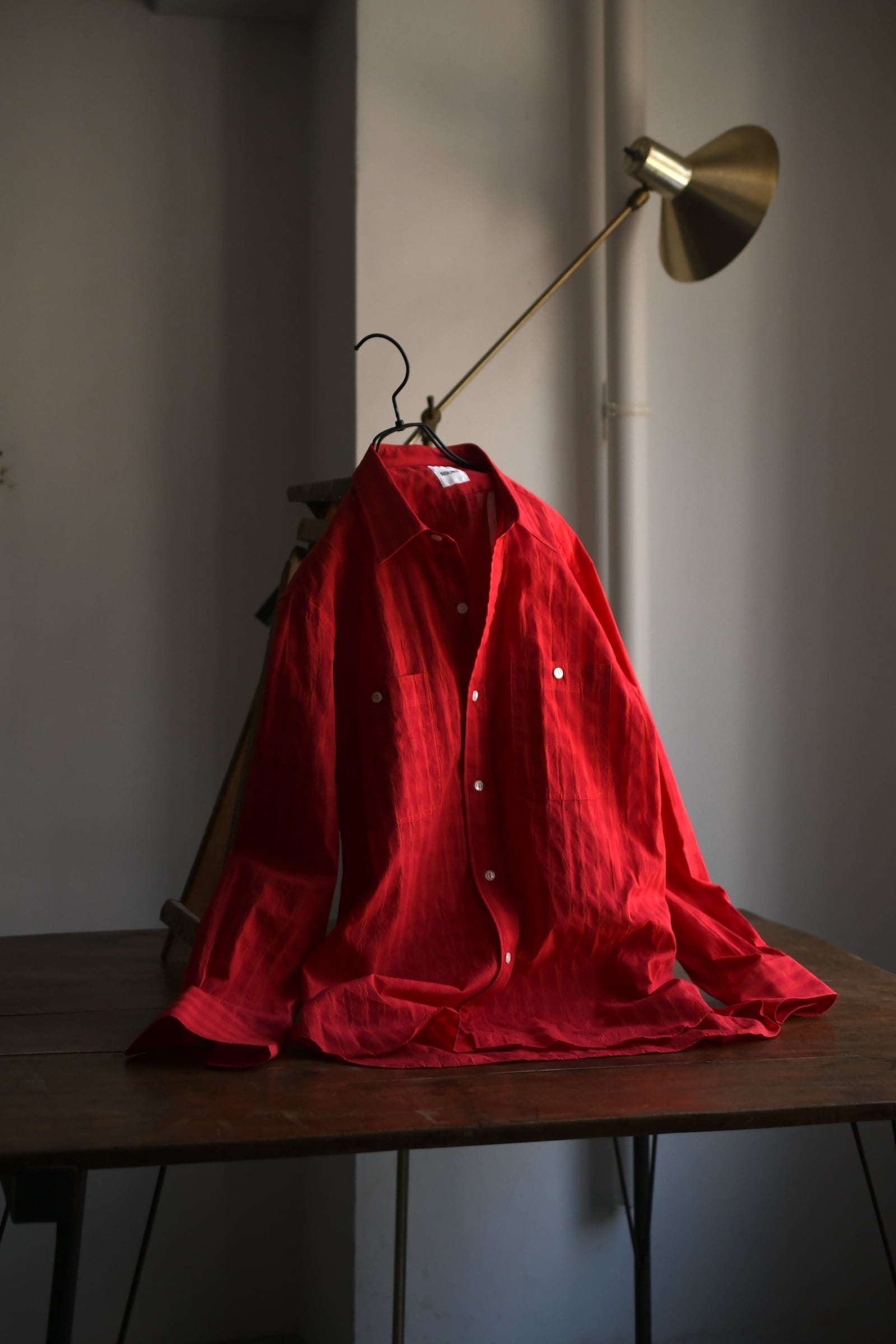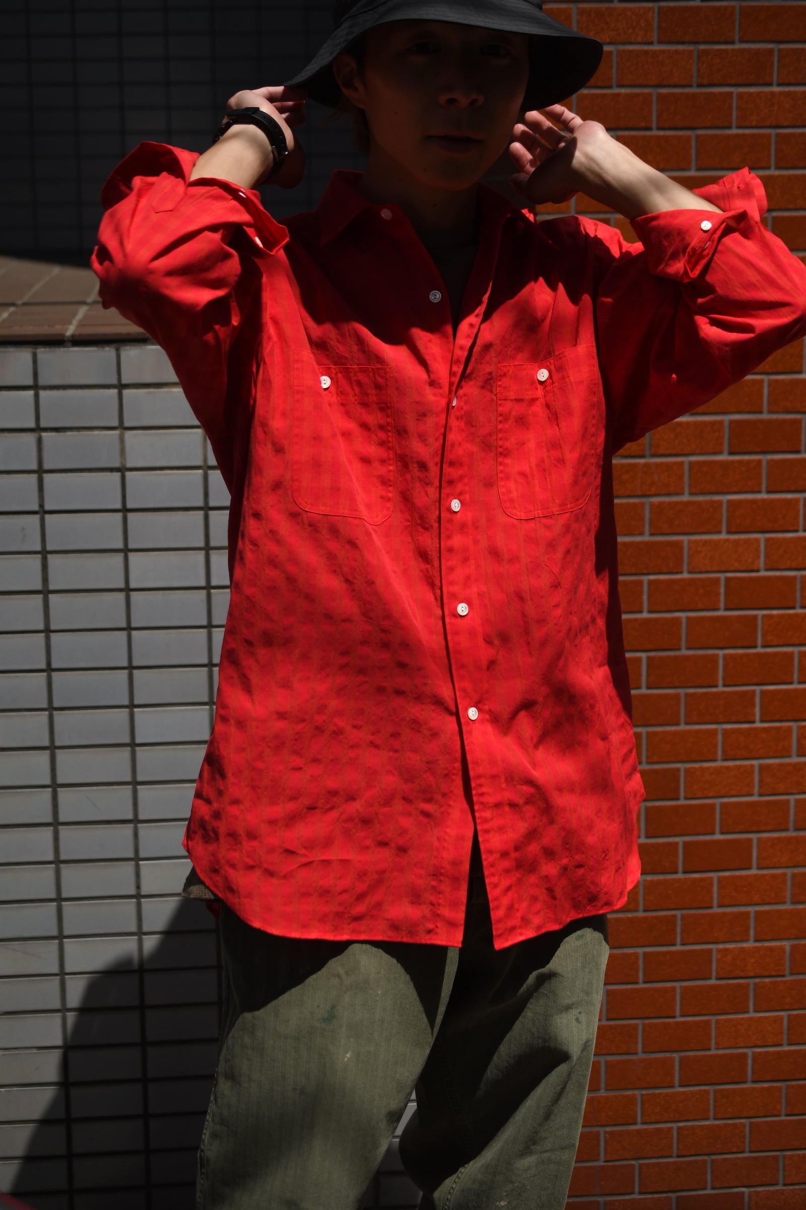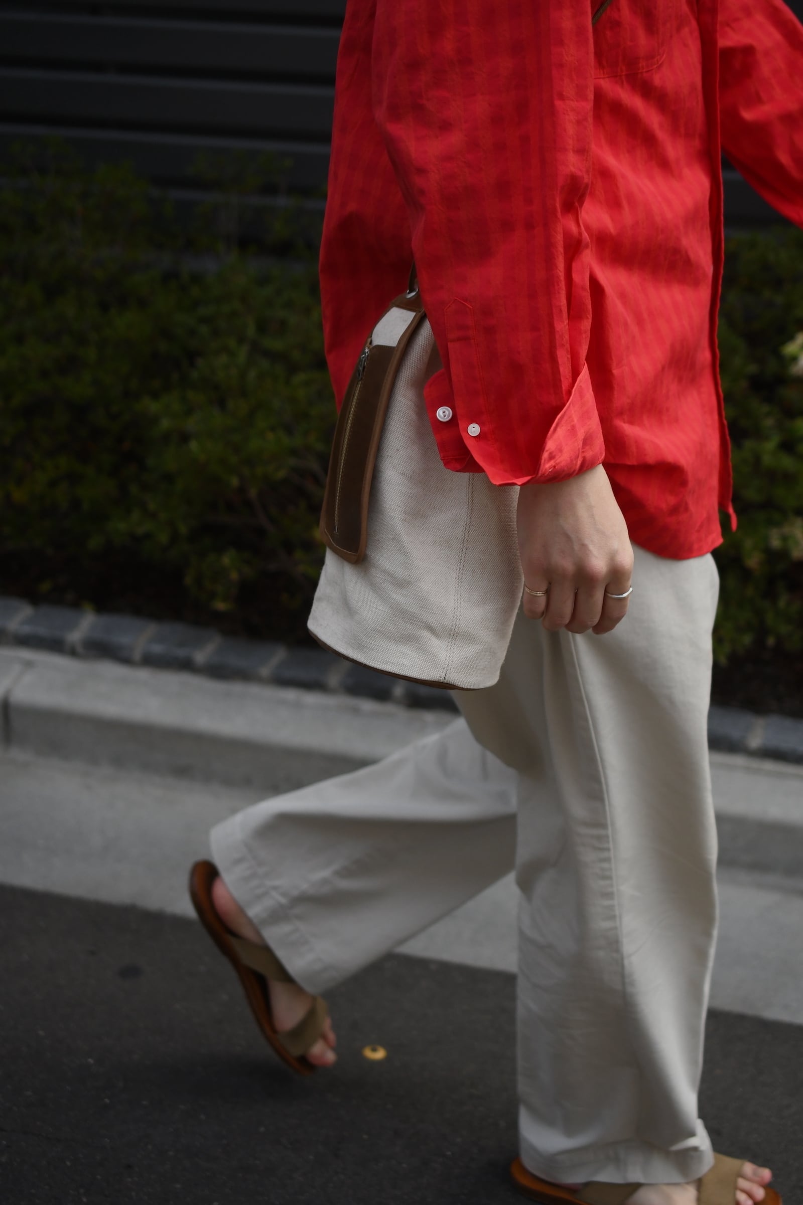 ハッキリとした柄では無く、ボヤけながら重なり合って生まれる独特の色合いに惹かれた。細番手の織物を得意とする日本のメーカーに依頼して製作したという生地は、経糸と緯糸それぞれで番手の細さと色に僅かな差を付ける事により奥行きを持たせたトーンオントーンのギンガム。”凛とした赤”と”掠れた赤”が織り成す表情は、カジュアルさ以上に色気を感じさせ、春夏の単調な装いに良いニュアンスの変化を与えてくれる。そしてシアー感も伴っている事で想像以上の”清涼感”を秘めており、真夏も十二分に楽しめられそうだ。そして秋以降は外しのインナーとして間違いなく重宝する筈であり、是非とも春を始めする多くのシーズンで”魅惑の赤ギンガム”を堪能して頂きたい。