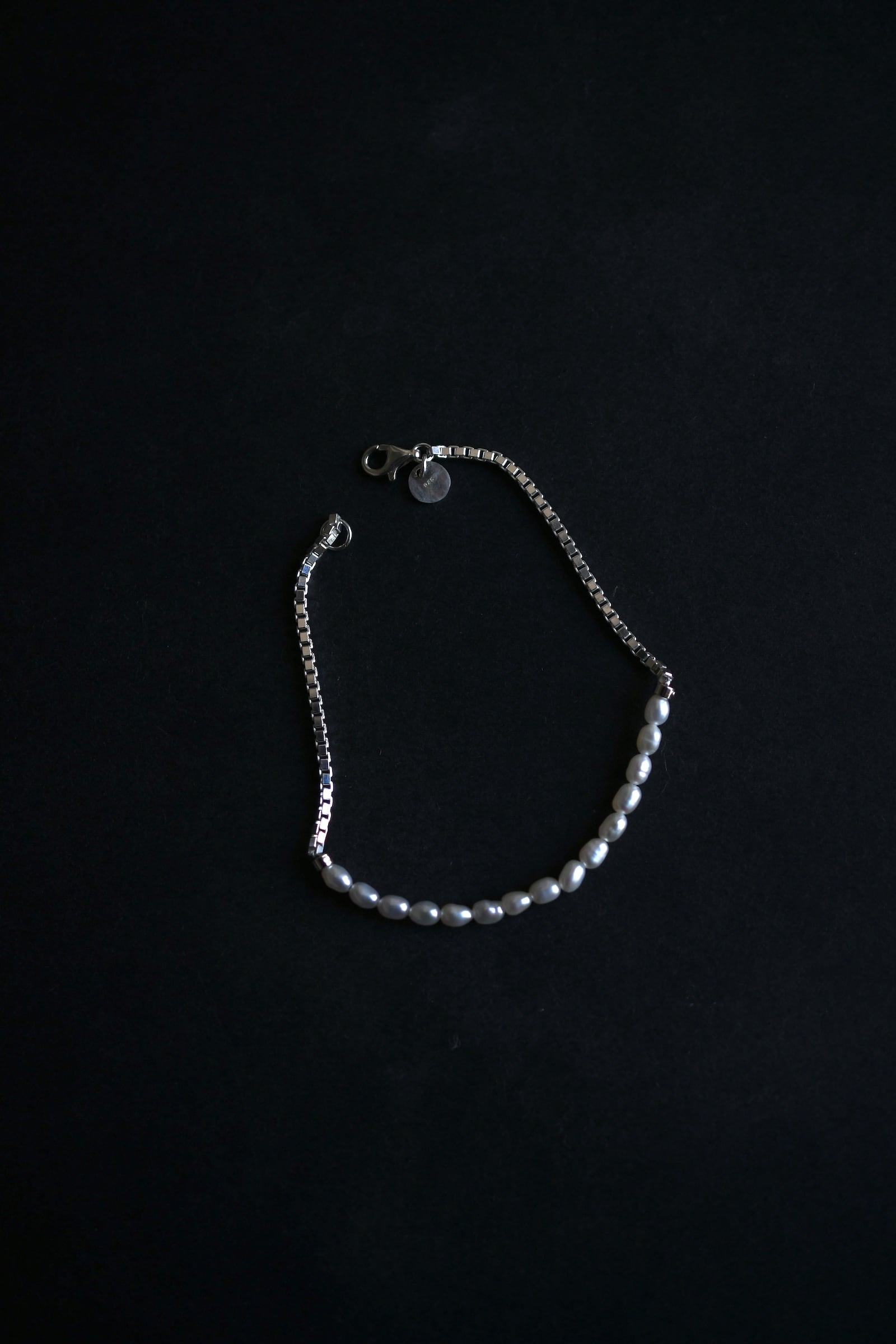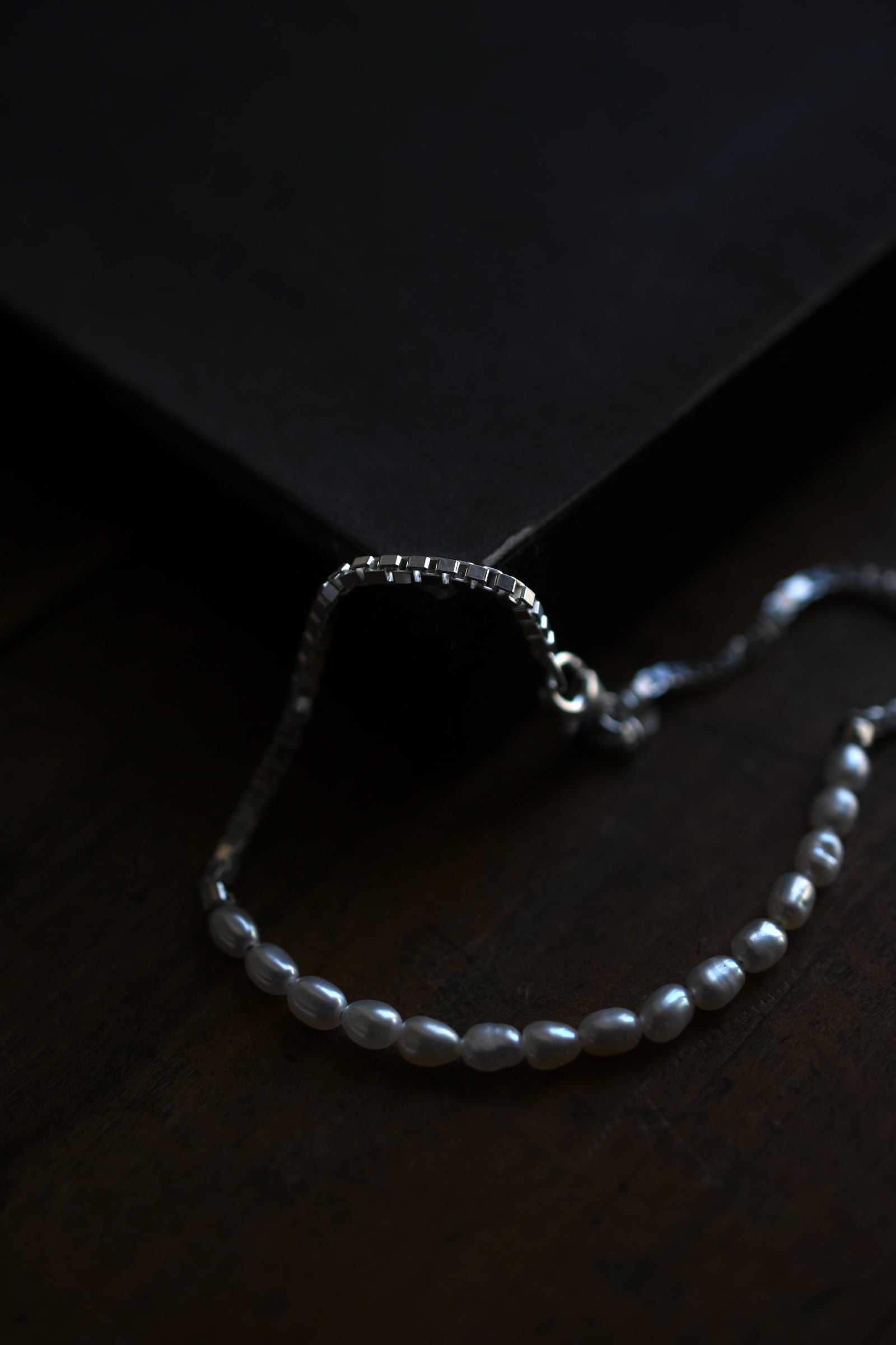 川や湖で養殖される淡水パールと繊細なベネチアンタイプのシルバーチェーンをドッキングさせた新作のブレスレットは、異なる要素が静かに同居して生まれる独特の上品さがある。