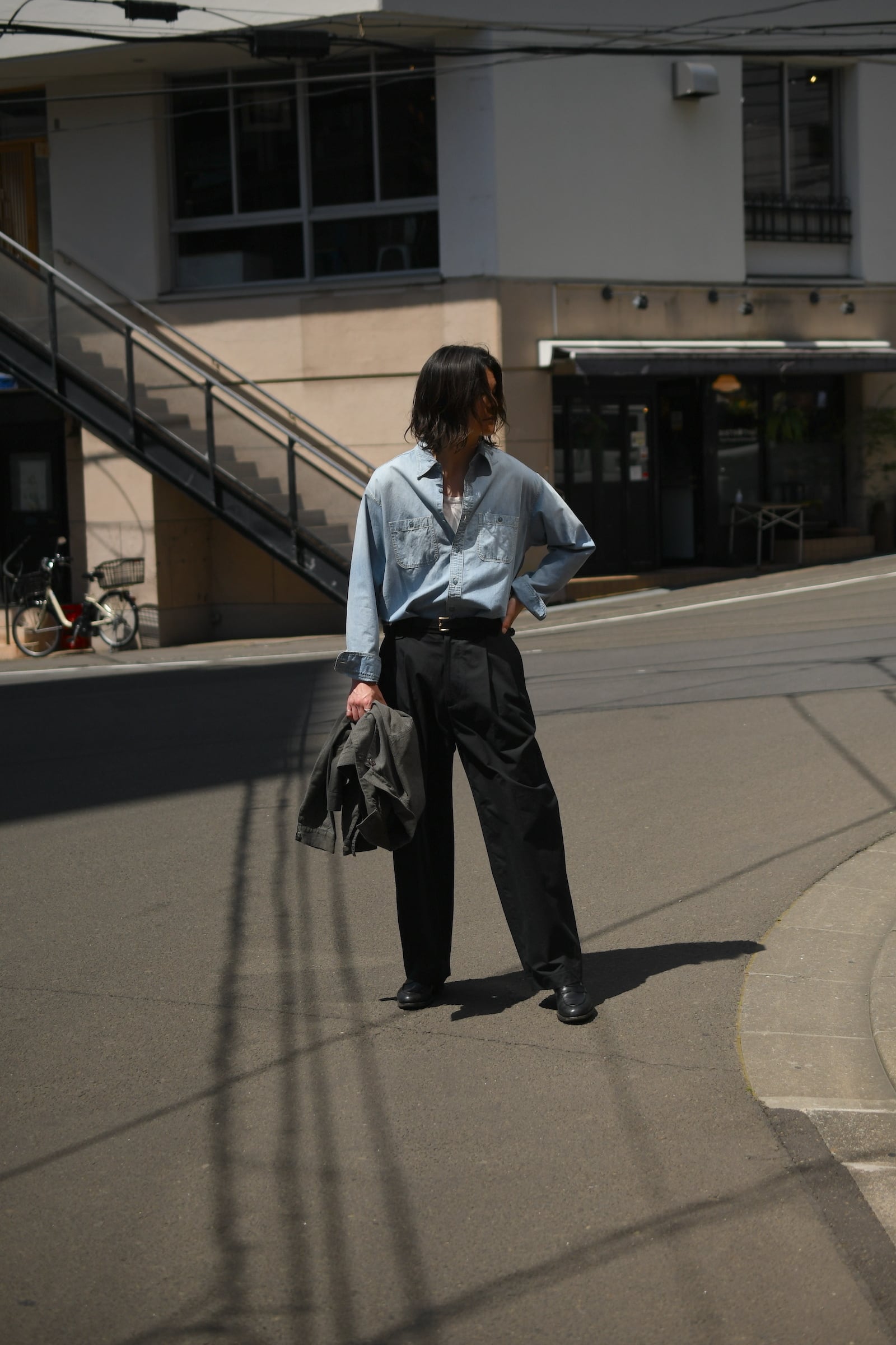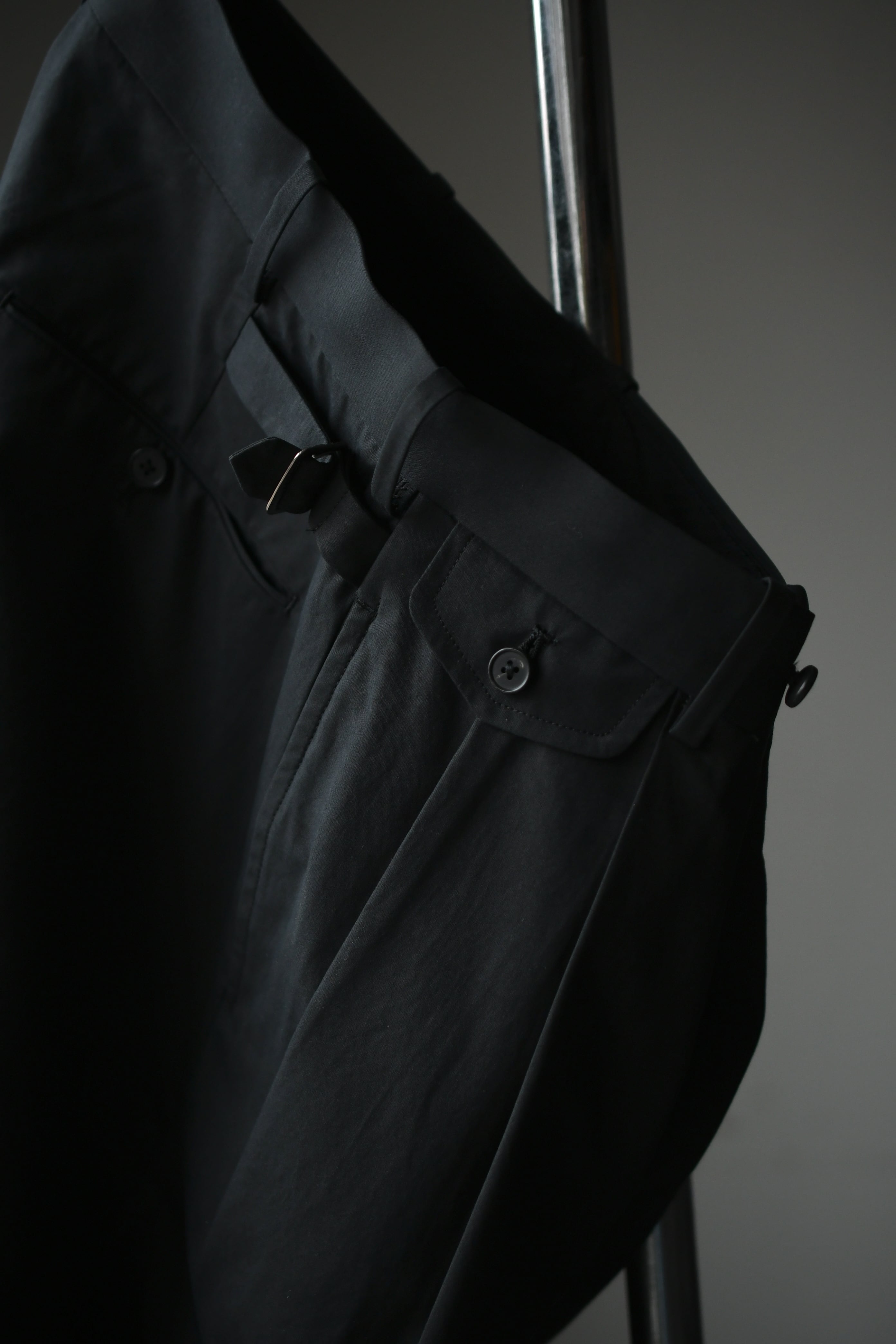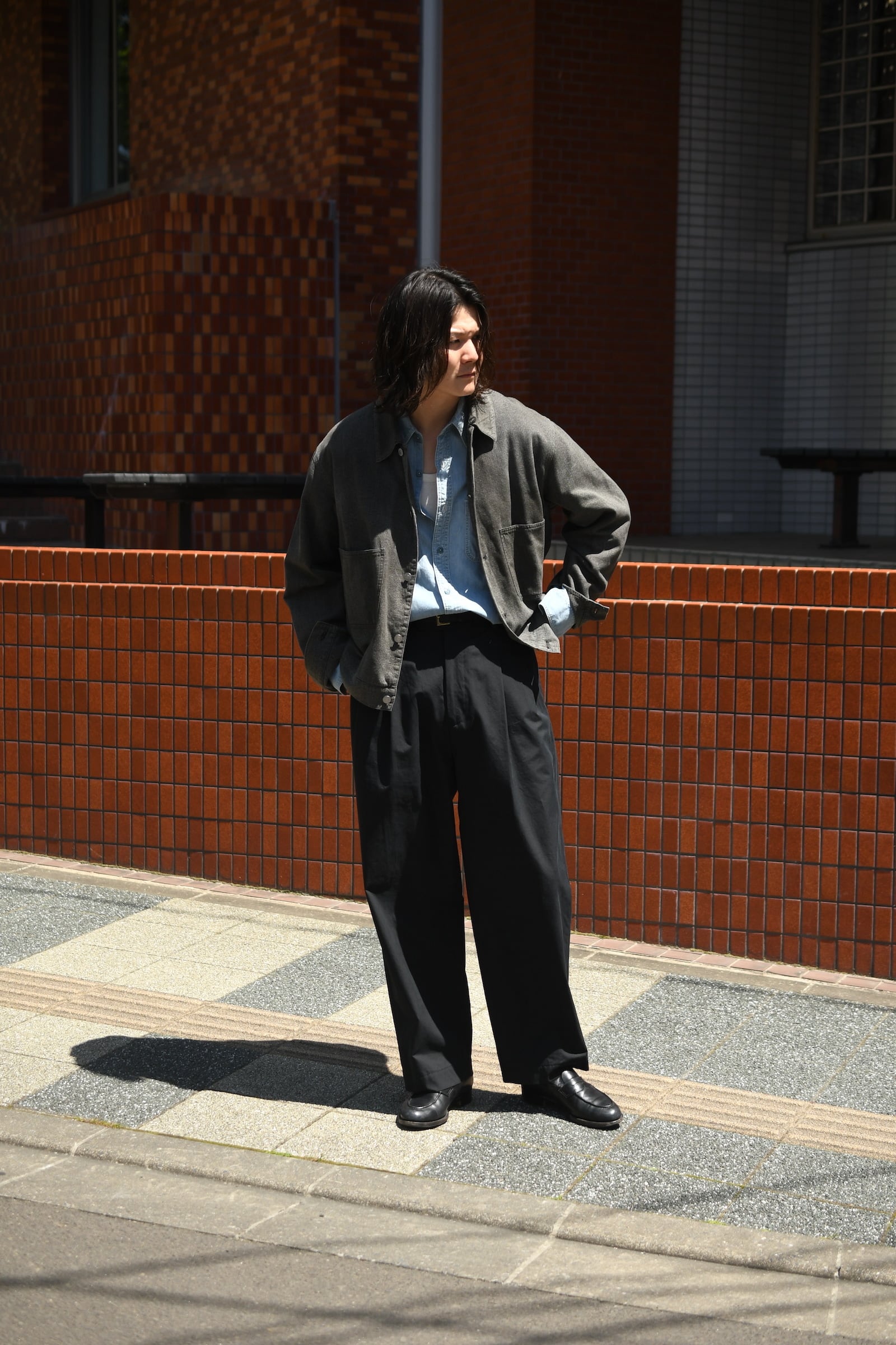 日常使いに於ける十分なタフさを持ち、その上で微かな品を香らせるA.PRESSE流のクラシックなトラウザーは、コットンシルクの軽快さを纏い新たに生まれ変わった。1990年代頃より見られる某アメリカブランドの2プリーツチノトラウザーをベースに、オリジナルのホーン釦やマーベルト仕立てといった伝統的なディティールを落とし込みクラシックな面持ちへ。ウエストの収まりも良く、トップスのインアウト共にフィッテングの素晴らしさも同等に感じ取れる。そして、裾に向かって僅かにテーパードの効いた美しいワイドストレートシルエットは絶妙な太さを体現しており、この合わせ知らずとも言える懐の深さと”掠れていく黒”は、今後に出番を控えたラフいトップスを筆頭として多くのテイストと相性の良さを見せてくれる筈だ。新たな定番として相応しい1本を是非とも味わって頂きたい。