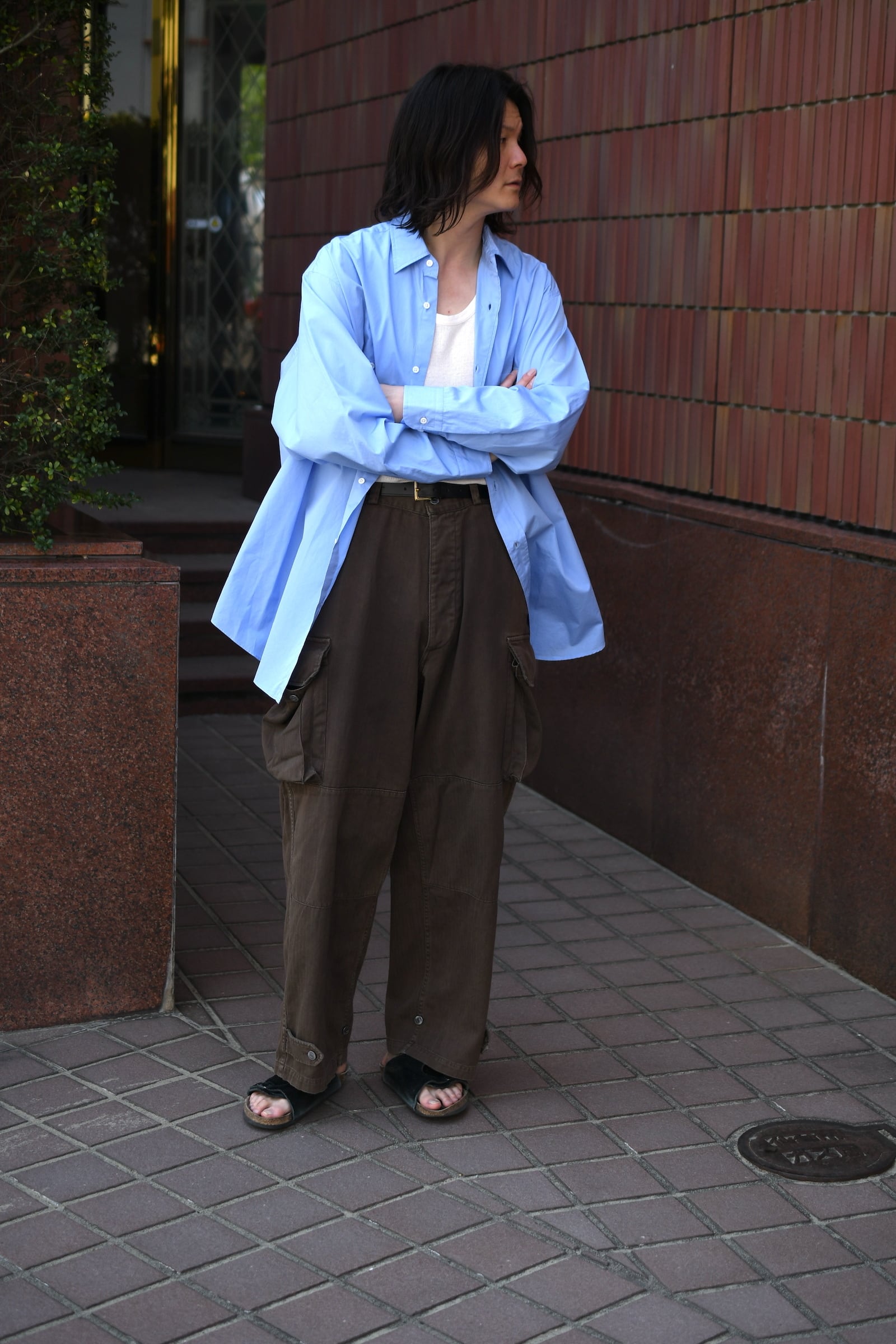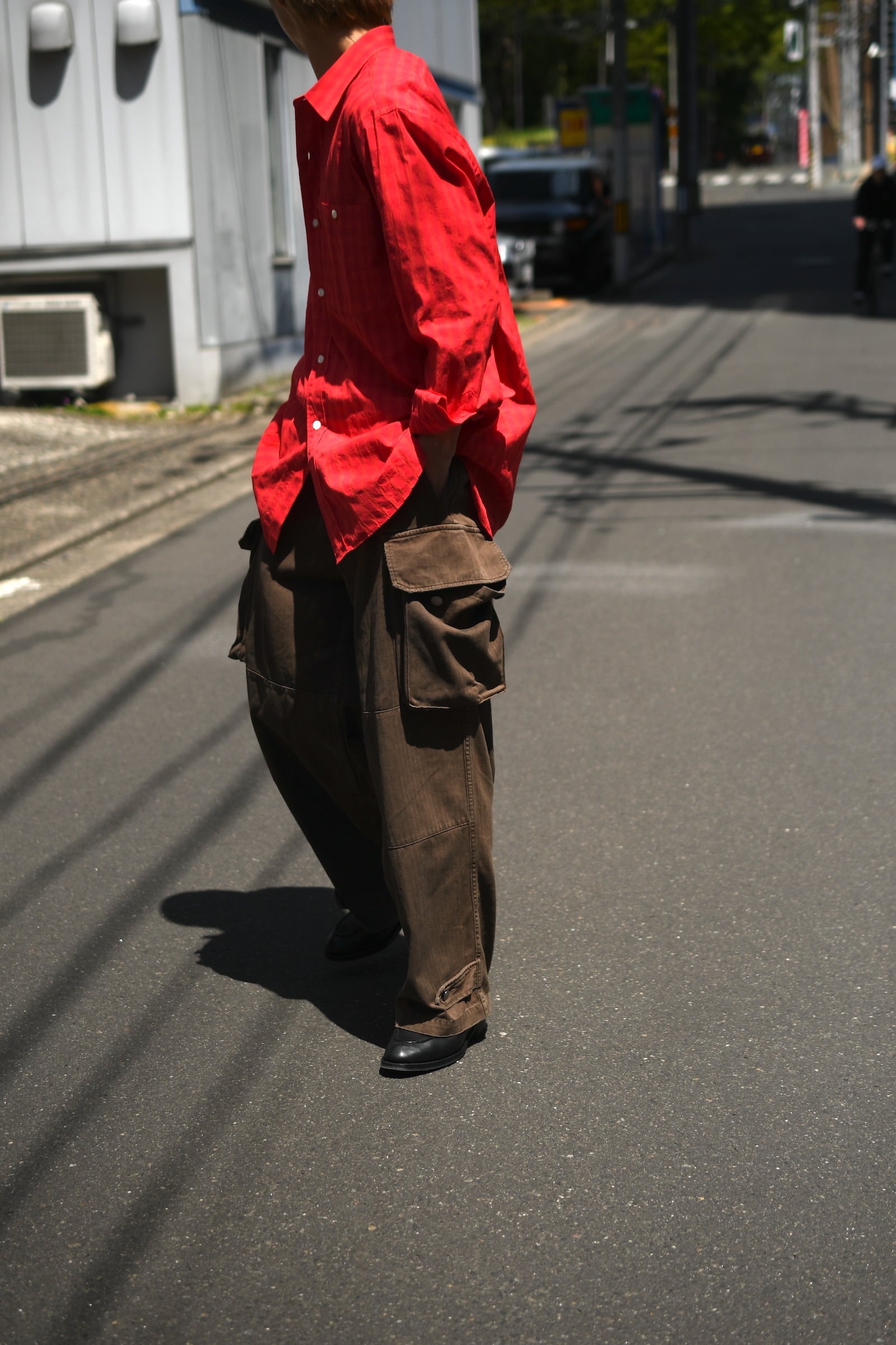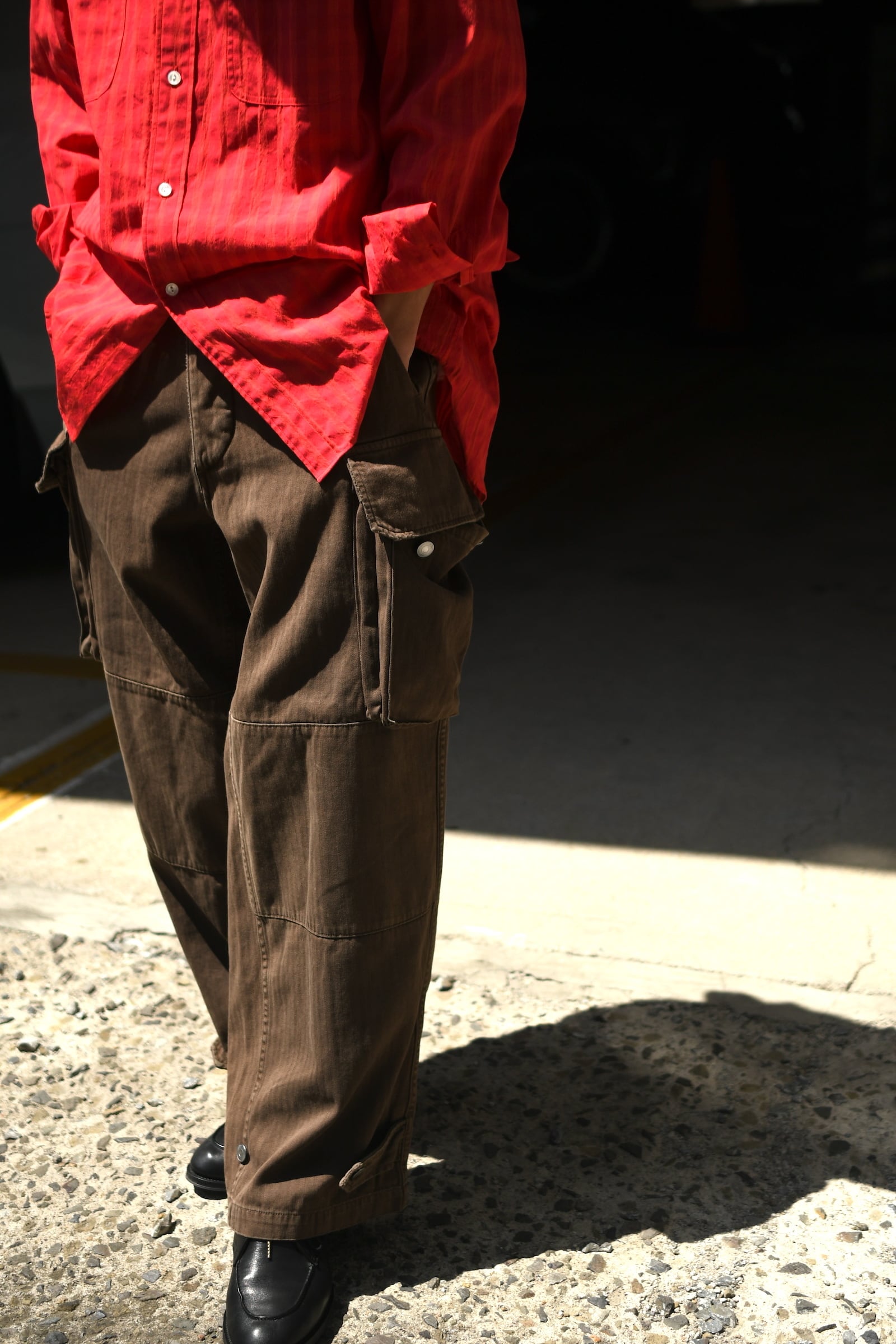 フランス軍の名作を背景に、ヴィンテージに引けを取らない圧倒的な雰囲気と”本家とは異なる存在感”をA.PRESSEがカタチにした。紡績技術が低かった当時の生地で見られる自然なムラ感を表現するため、 経糸は超長綿のムラ糸を双糸に、緯糸はムラの強い糸とムラの弱い糸を交互に打ち込んで織り上げたヘリンボーンは圧巻であり、GREIGEは顔料染め、BROWNは製品染めと手法を変えて辿り着いた風合いはそれぞれが異なった破壊力を放つ。そして各所にゆとりを持たせながらも過度な膨らみが出ないようにシルエットを調整し、そのバランスを考慮してカーゴポケットの大きさも少しアレンジを加えると言った細やかな編集も健在であり、しっかりと現代的な1本に昇華してくれている。秋までを見越して、その時々のスタイリングにどう差し込んでいくか。様々な想像がつい膨らんでしまう。