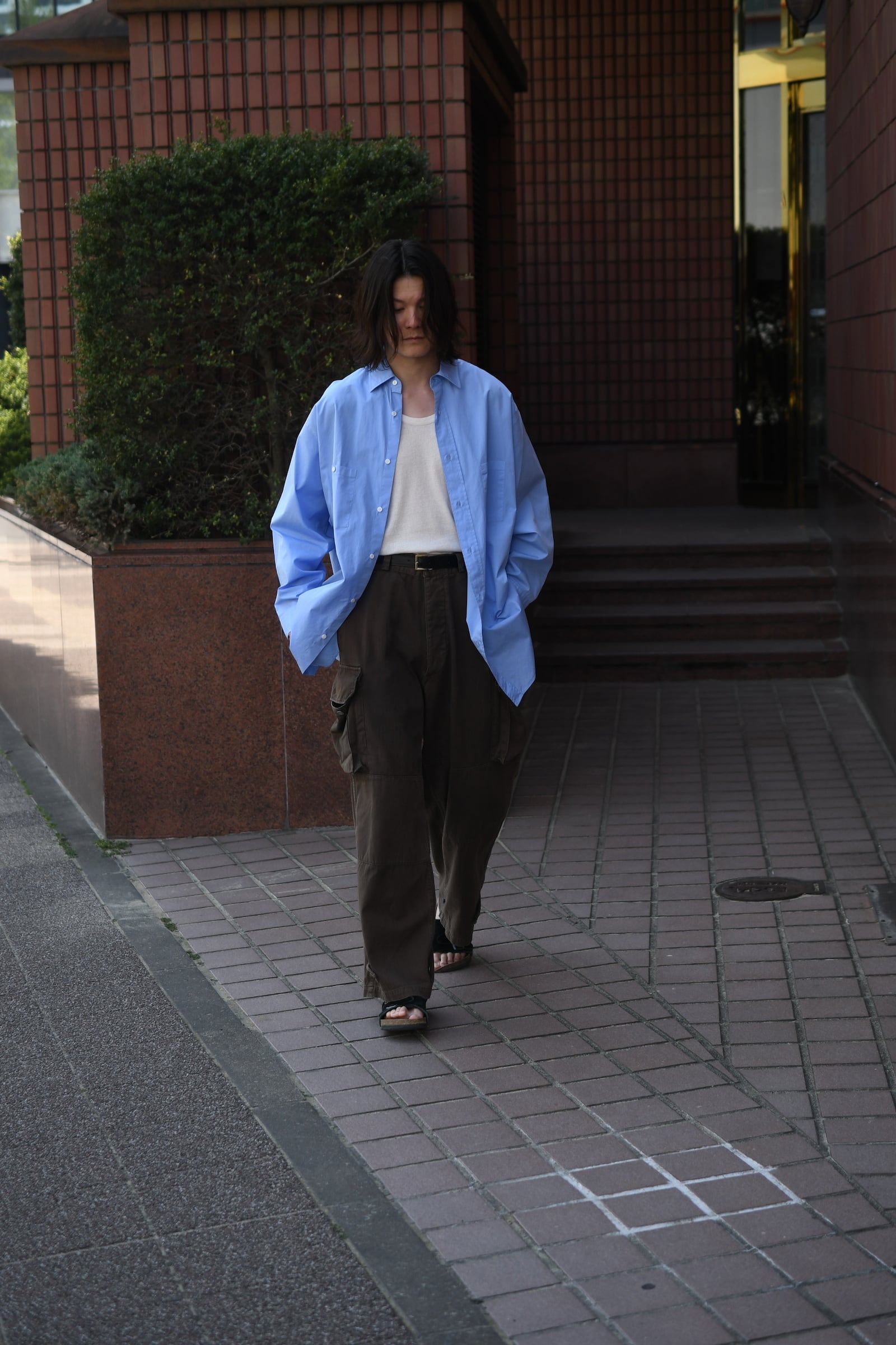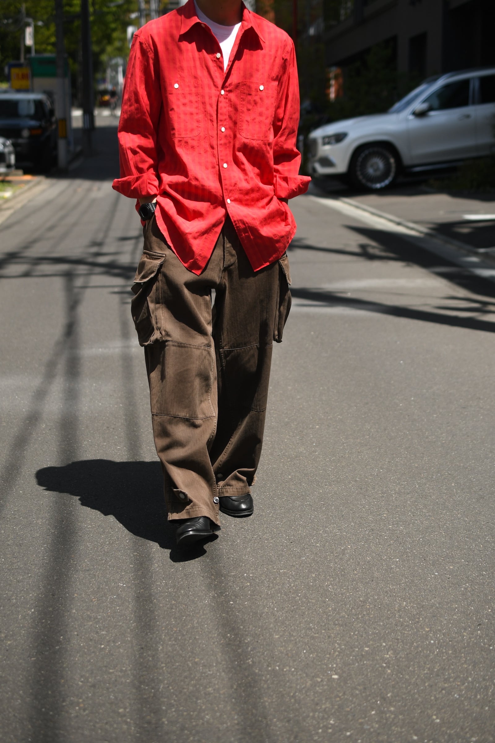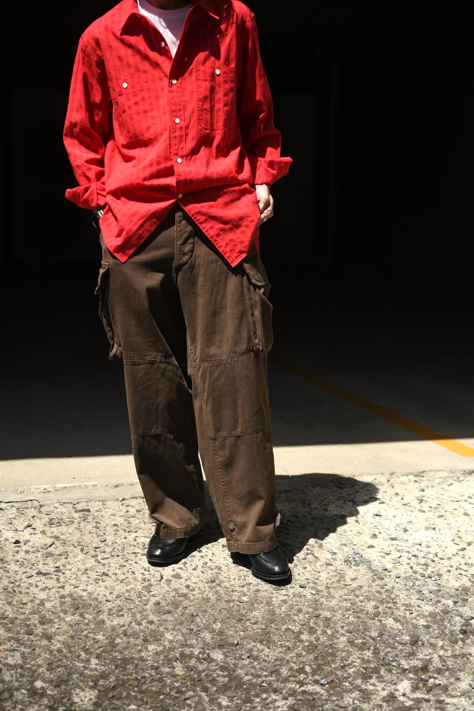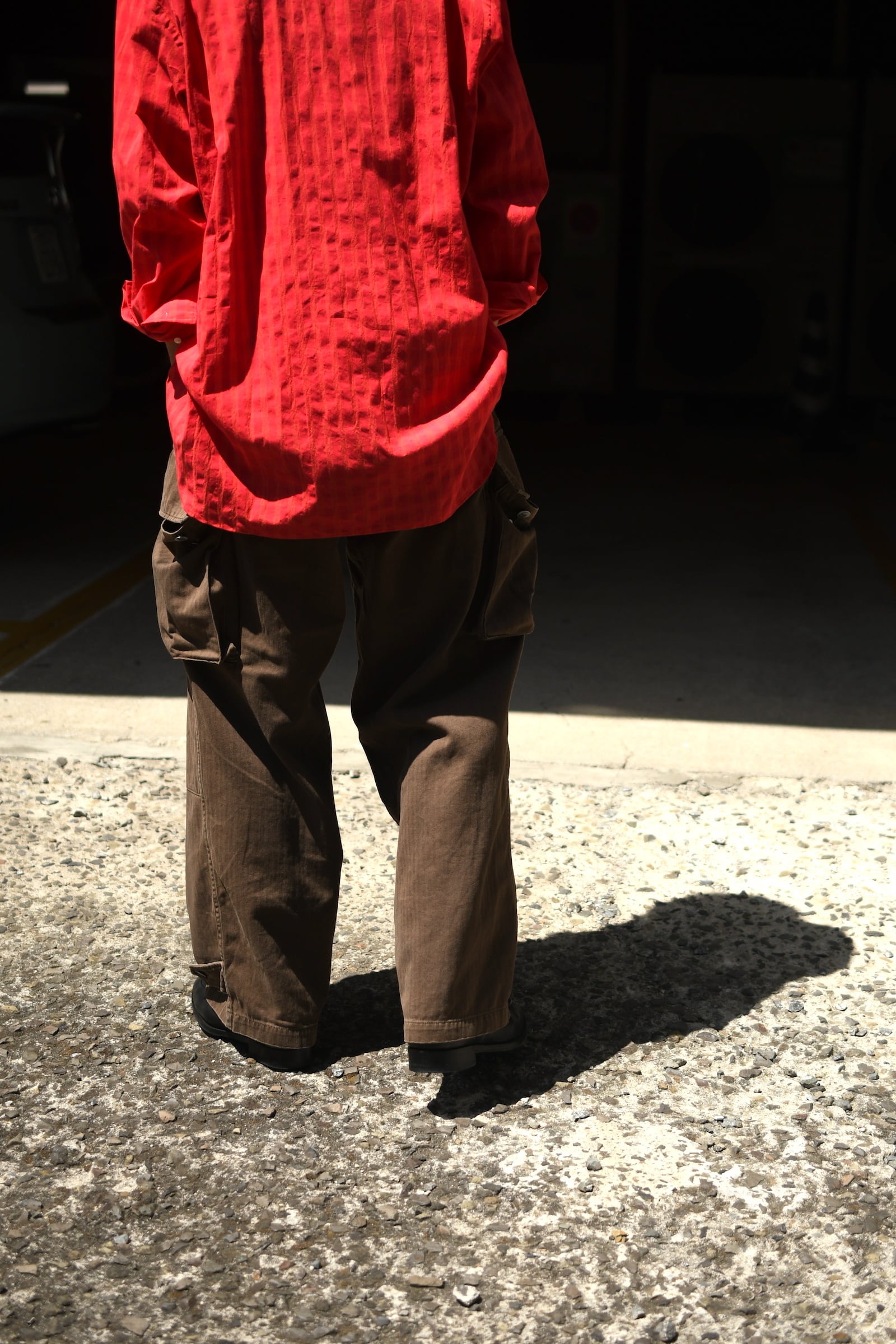 フランス軍の名作を背景に、ヴィンテージに引けを取らない圧倒的な雰囲気と”本家とは異なる存在感”をA.PRESSEがカタチにした。紡績技術が低かった当時の生地で見られる自然なムラ感を表現するため、 経糸は超長綿のムラ糸を双糸に、緯糸はムラの強い糸とムラの弱い糸を交互に打ち込んで織り上げたヘリンボーンは圧巻であり、GREIGEは顔料染め、BROWNは製品染めと手法を変えて辿り着いた風合いはそれぞれが異なった破壊力を放つ。そして各所にゆとりを持たせながらも過度な膨らみが出ないようにシルエットを調整し、そのバランスを考慮してカーゴポケットの大きさも少しアレンジを加えると言った細やかな編集も健在であり、しっかりと現代的な1本に昇華してくれている。秋までを見越して、その時々のスタイリングにどう差し込んでいくか。様々な想像がつい膨らんでしまう。
