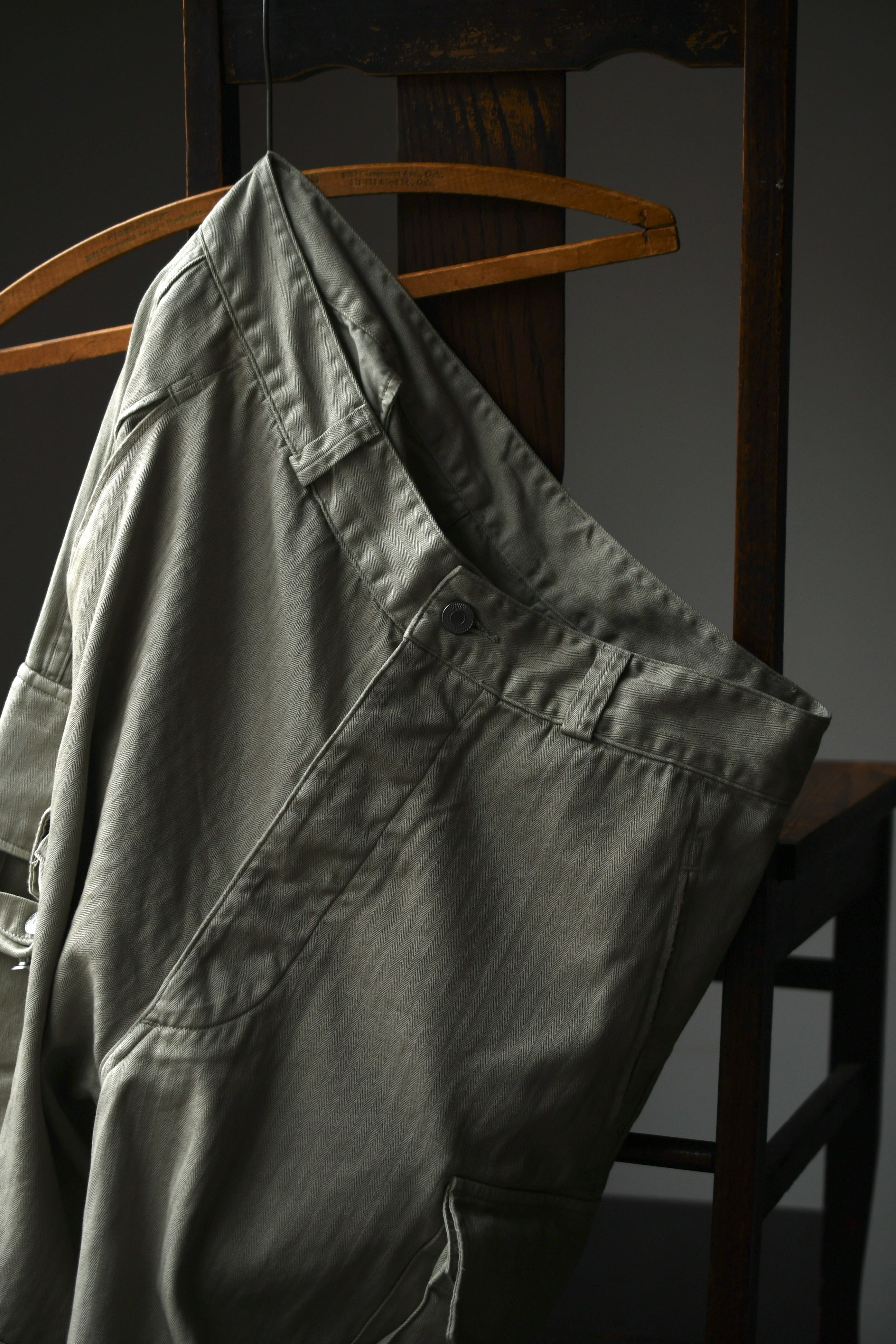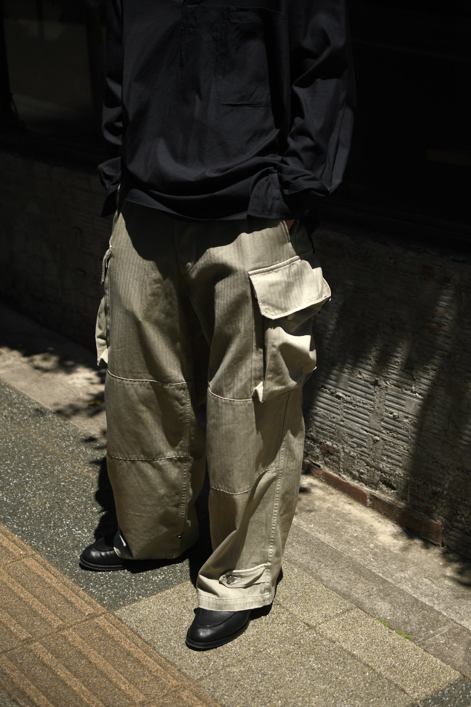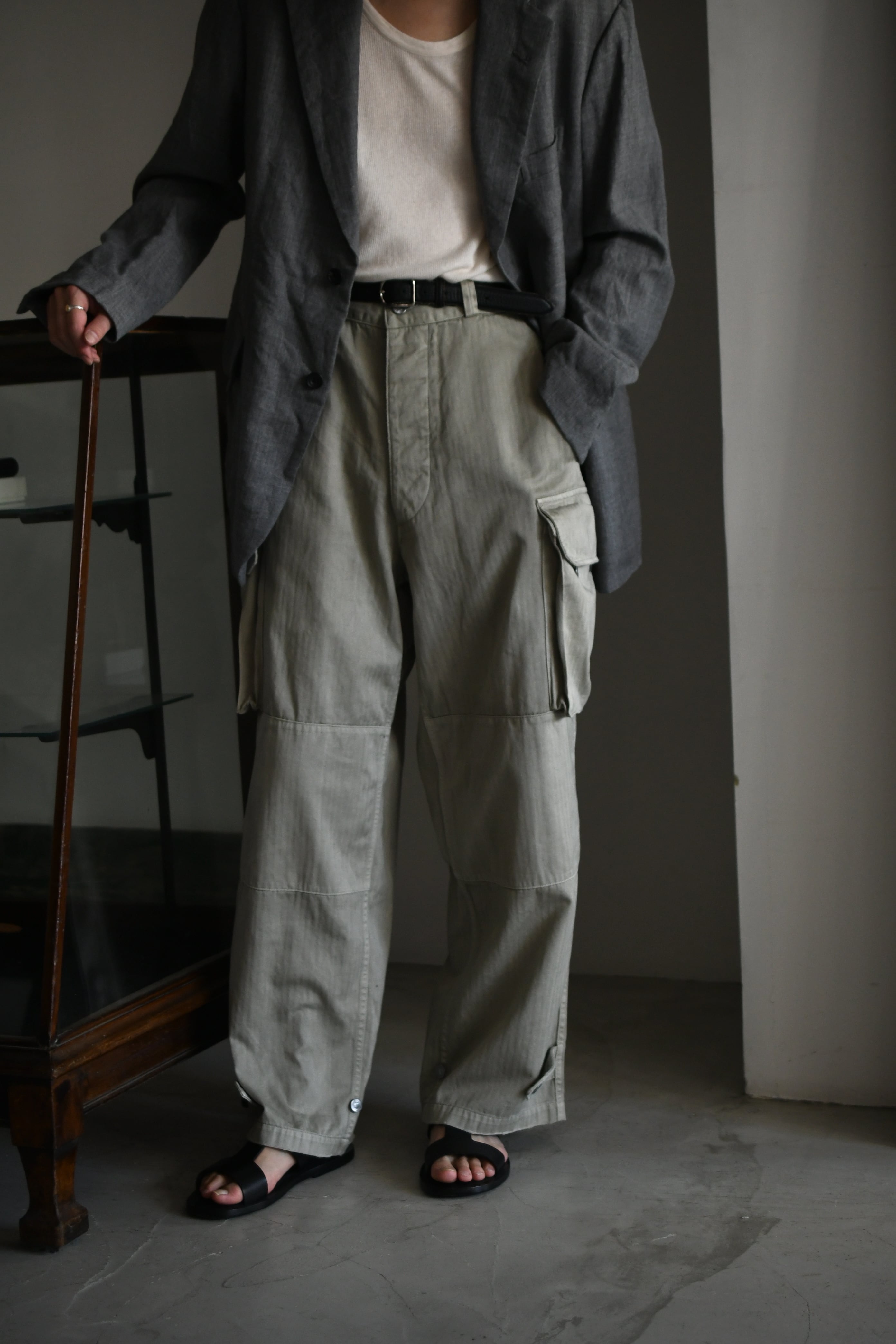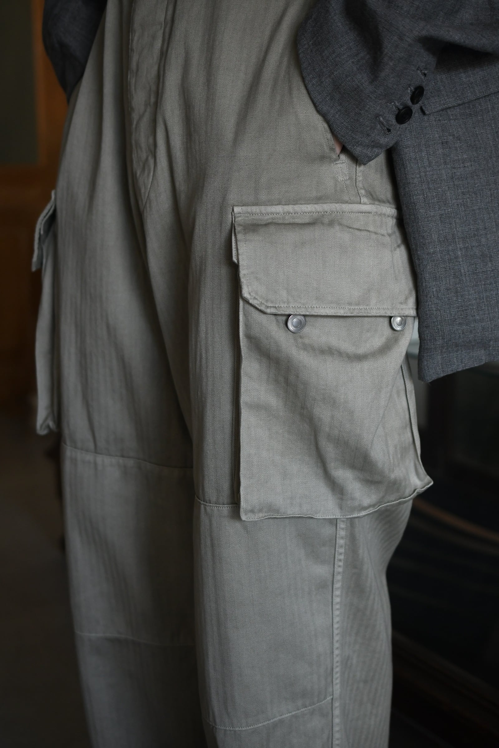 フランス軍の名作を背景に、ヴィンテージに引けを取らない圧倒的な雰囲気と”本家とは異なる存在感”をA.PRESSEがカタチにした。紡績技術が低かった当時の生地で見られる自然なムラ感を表現するため、 経糸は超長綿のムラ糸を双糸に、緯糸はムラの強い糸とムラの弱い糸を交互に打ち込んで織り上げたヘリンボーンは圧巻であり、GREIGEは顔料染め、BROWNは製品染めと手法を変えて辿り着いた風合いはそれぞれが異なった破壊力を放つ。そして各所にゆとりを持たせながらも過度な膨らみが出ないようにシルエットを調整し、そのバランスを考慮してカーゴポケットの大きさも少しアレンジを加えると言った細やかな編集も健在であり、しっかりと現代的な1本に昇華してくれている。秋までを見越して、その時々のスタイリングにどう差し込んでいくか。様々な想像がつい膨らんでしまう。
