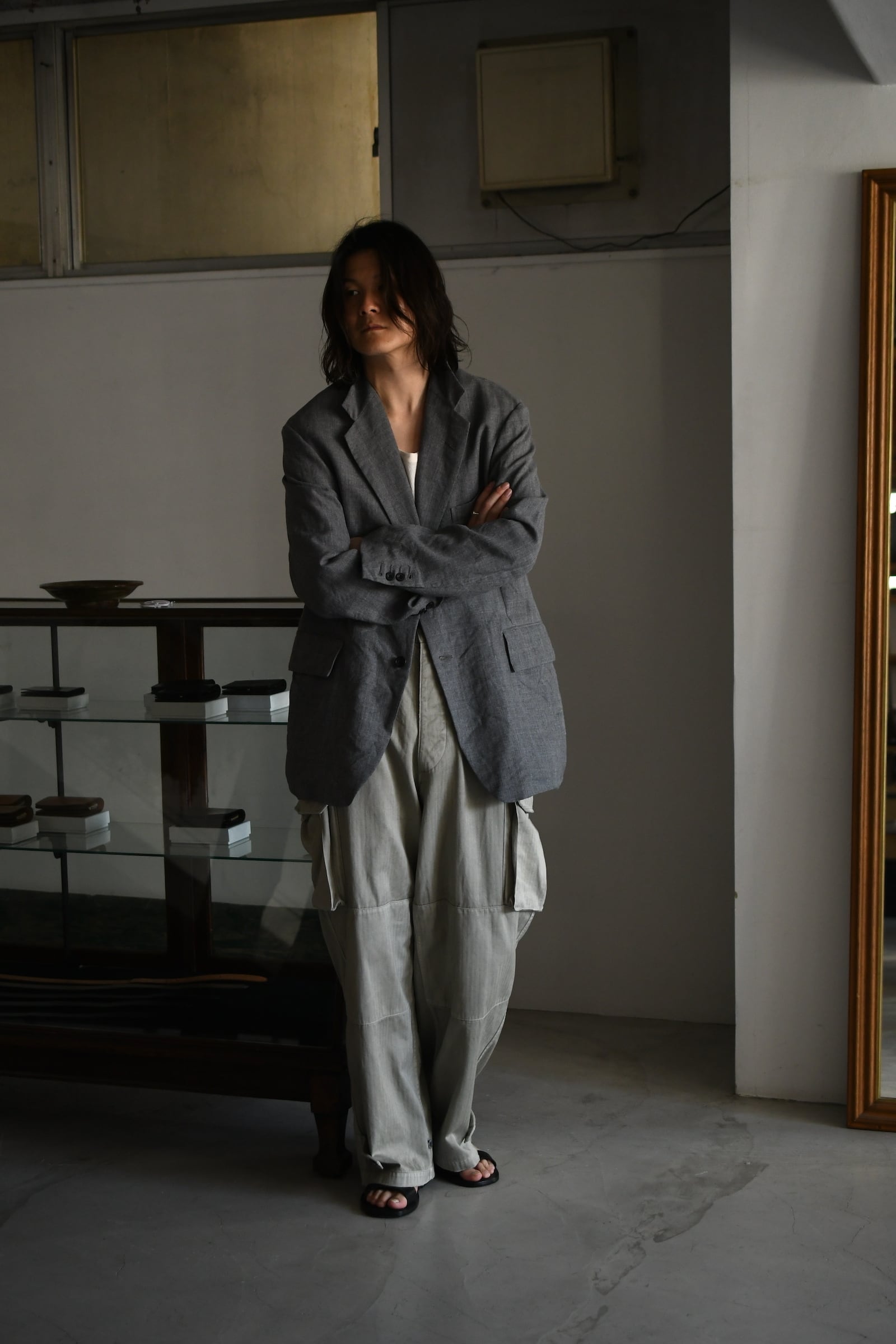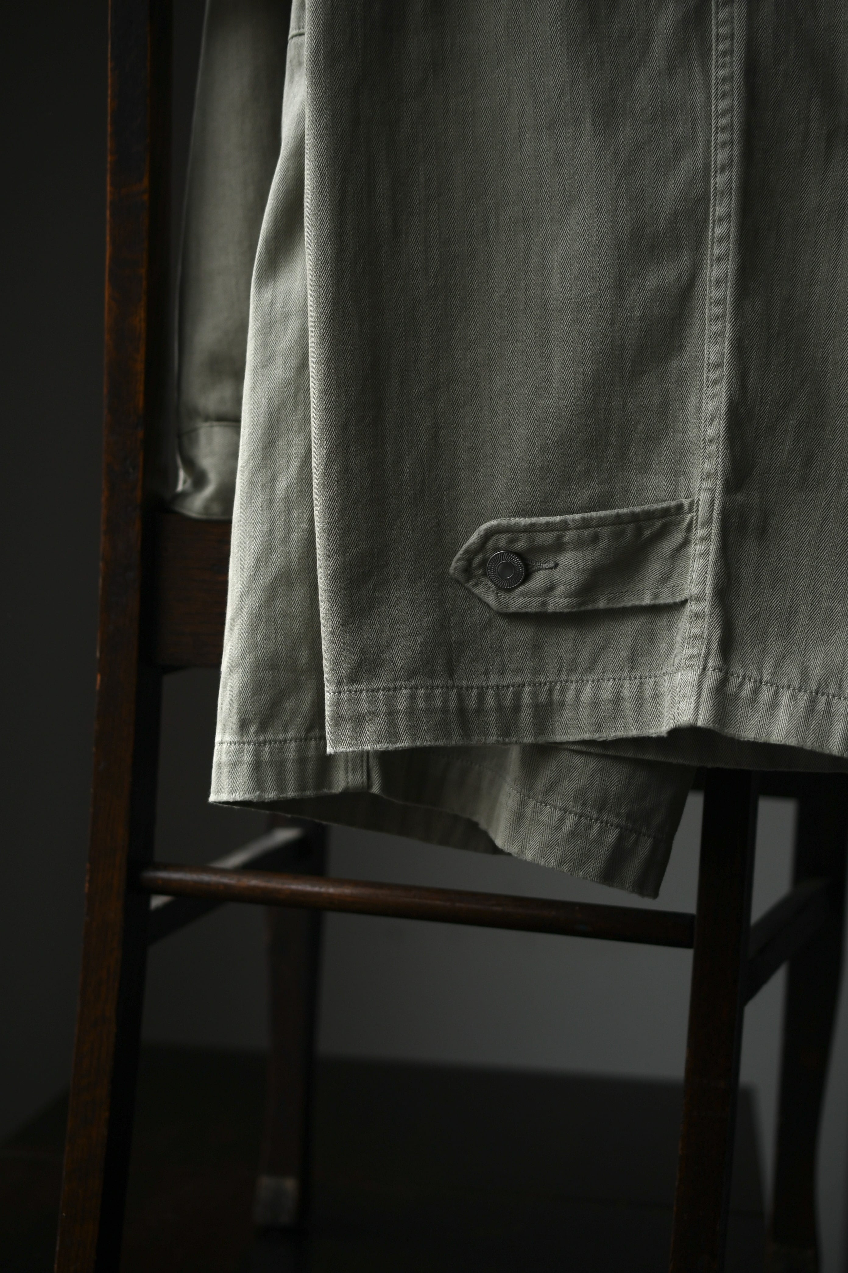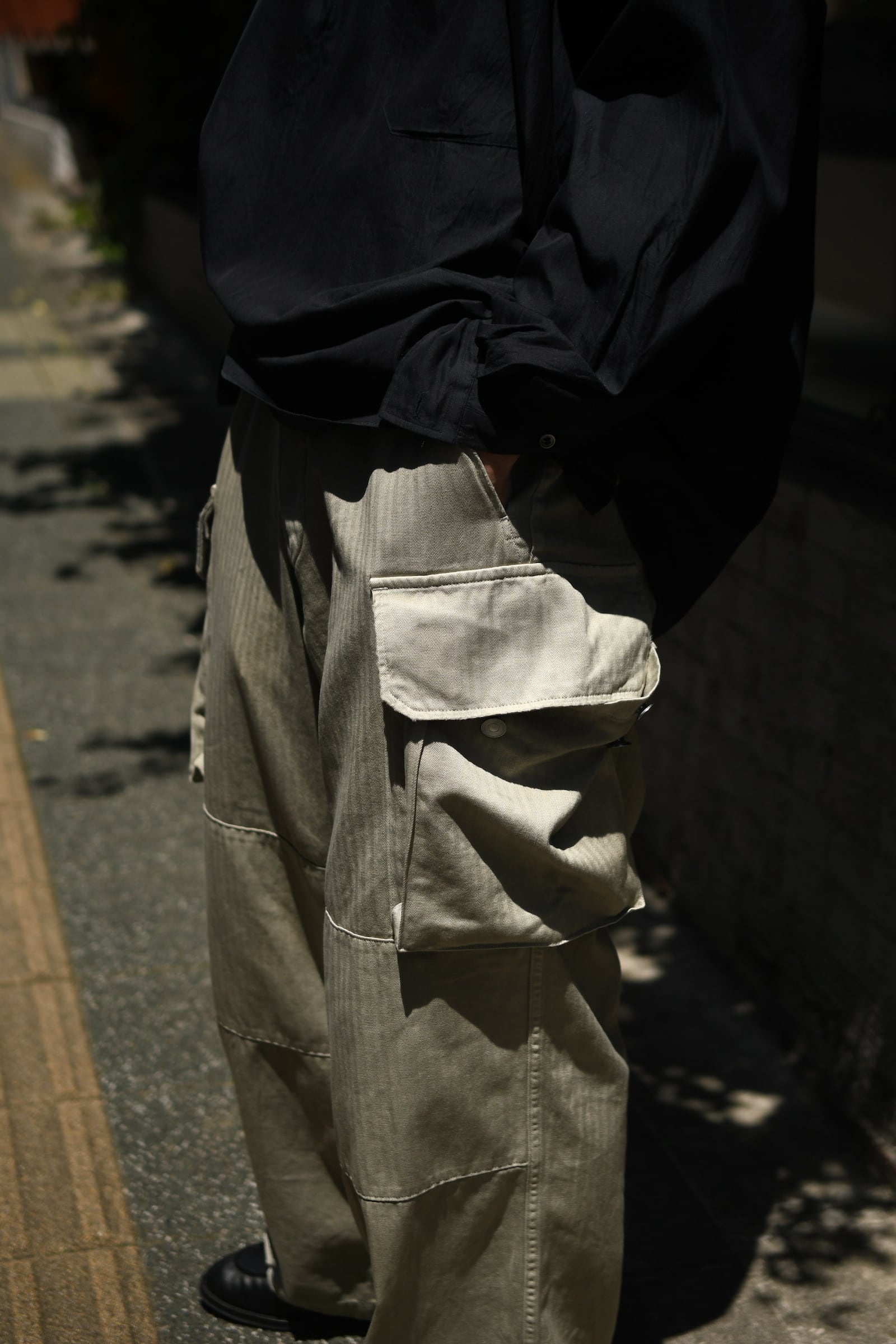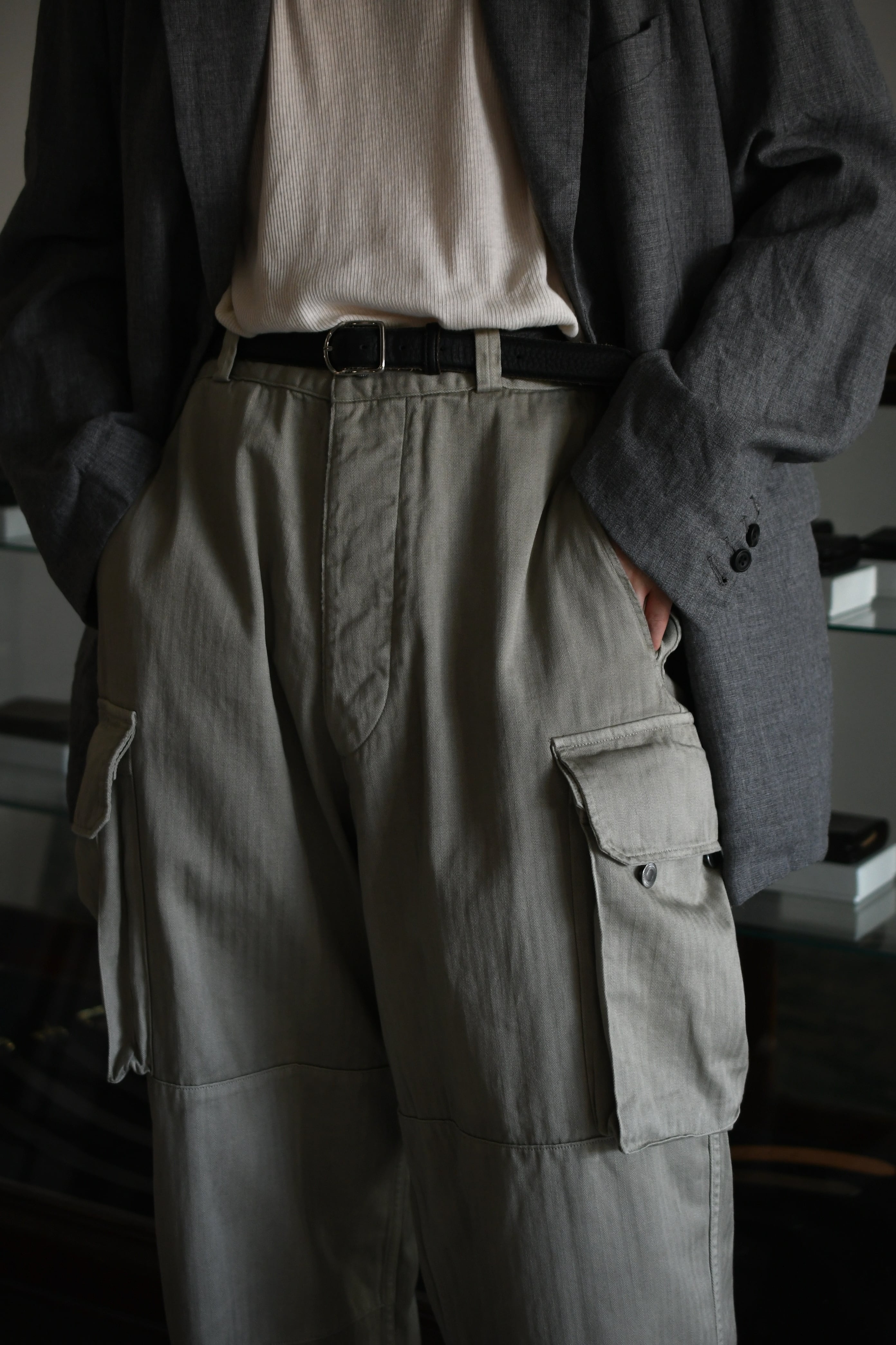 フランス軍の名作を背景に、ヴィンテージに引けを取らない圧倒的な雰囲気と”本家とは異なる存在感”をA.PRESSEがカタチにした。紡績技術が低かった当時の生地で見られる自然なムラ感を表現するため、 経糸は超長綿のムラ糸を双糸に、緯糸はムラの強い糸とムラの弱い糸を交互に打ち込んで織り上げたヘリンボーンは圧巻であり、GREIGEは顔料染め、BROWNは製品染めと手法を変えて辿り着いた風合いはそれぞれが異なった破壊力を放つ。そして各所にゆとりを持たせながらも過度な膨らみが出ないようにシルエットを調整し、そのバランスを考慮してカーゴポケットの大きさも少しアレンジを加えると言った細やかな編集も健在であり、しっかりと現代的な1本に昇華してくれている。秋までを見越して、その時々のスタイリングにどう差し込んでいくか。様々な想像がつい膨らんでしまう。