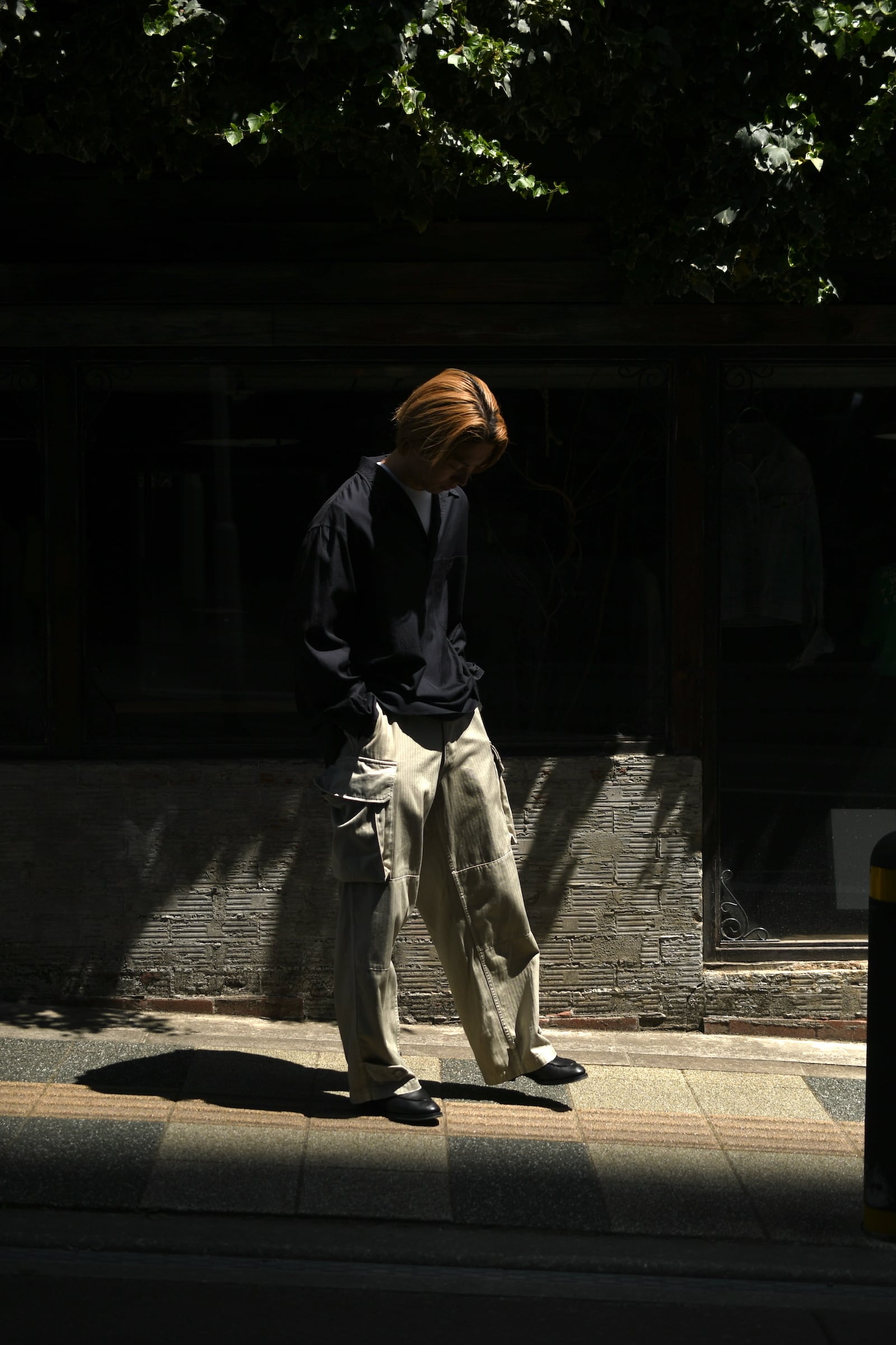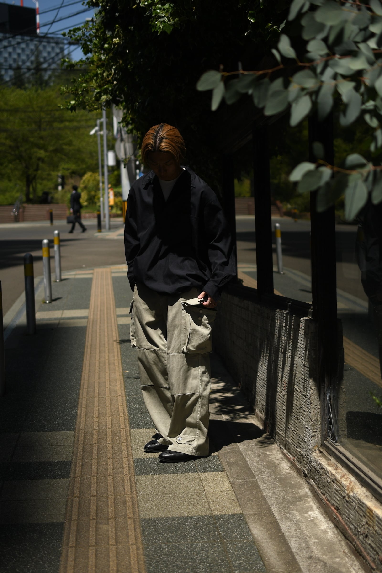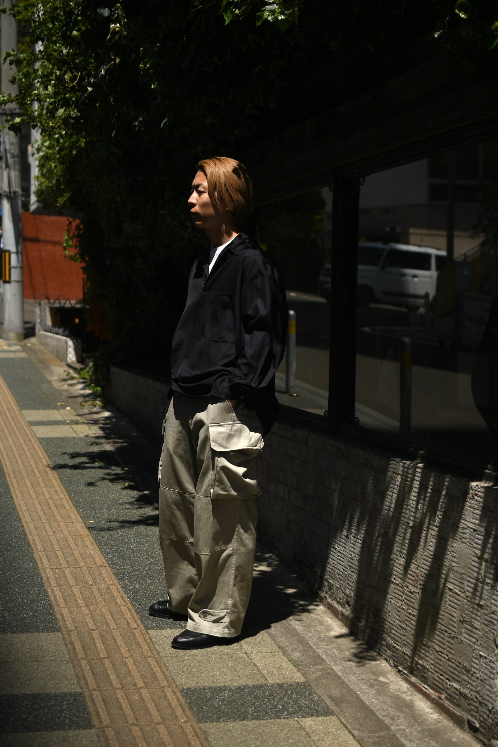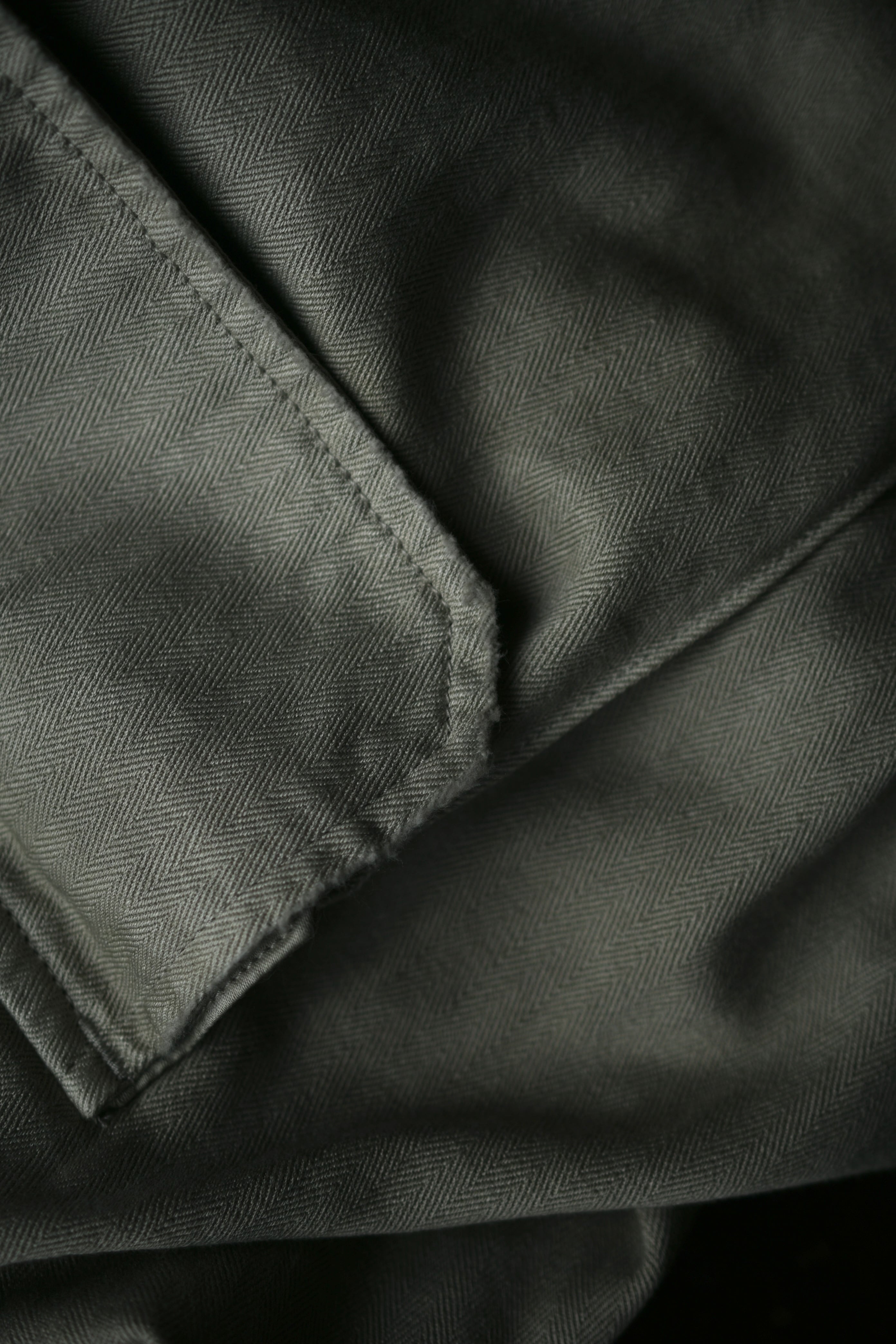 フランス軍の名作を背景に、ヴィンテージに引けを取らない圧倒的な雰囲気と”本家とは異なる存在感”をA.PRESSEがカタチにした。紡績技術が低かった当時の生地で見られる自然なムラ感を表現するため、 経糸は超長綿のムラ糸を双糸に、緯糸はムラの強い糸とムラの弱い糸を交互に打ち込んで織り上げたヘリンボーンは圧巻であり、GREIGEは顔料染め、BROWNは製品染めと手法を変えて辿り着いた風合いはそれぞれが異なった破壊力を放つ。そして各所にゆとりを持たせながらも過度な膨らみが出ないようにシルエットを調整し、そのバランスを考慮してカーゴポケットの大きさも少しアレンジを加えると言った細やかな編集も健在であり、しっかりと現代的な1本に昇華してくれている。秋までを見越して、その時々のスタイリングにどう差し込んでいくか。様々な想像がつい膨らんでしまう。