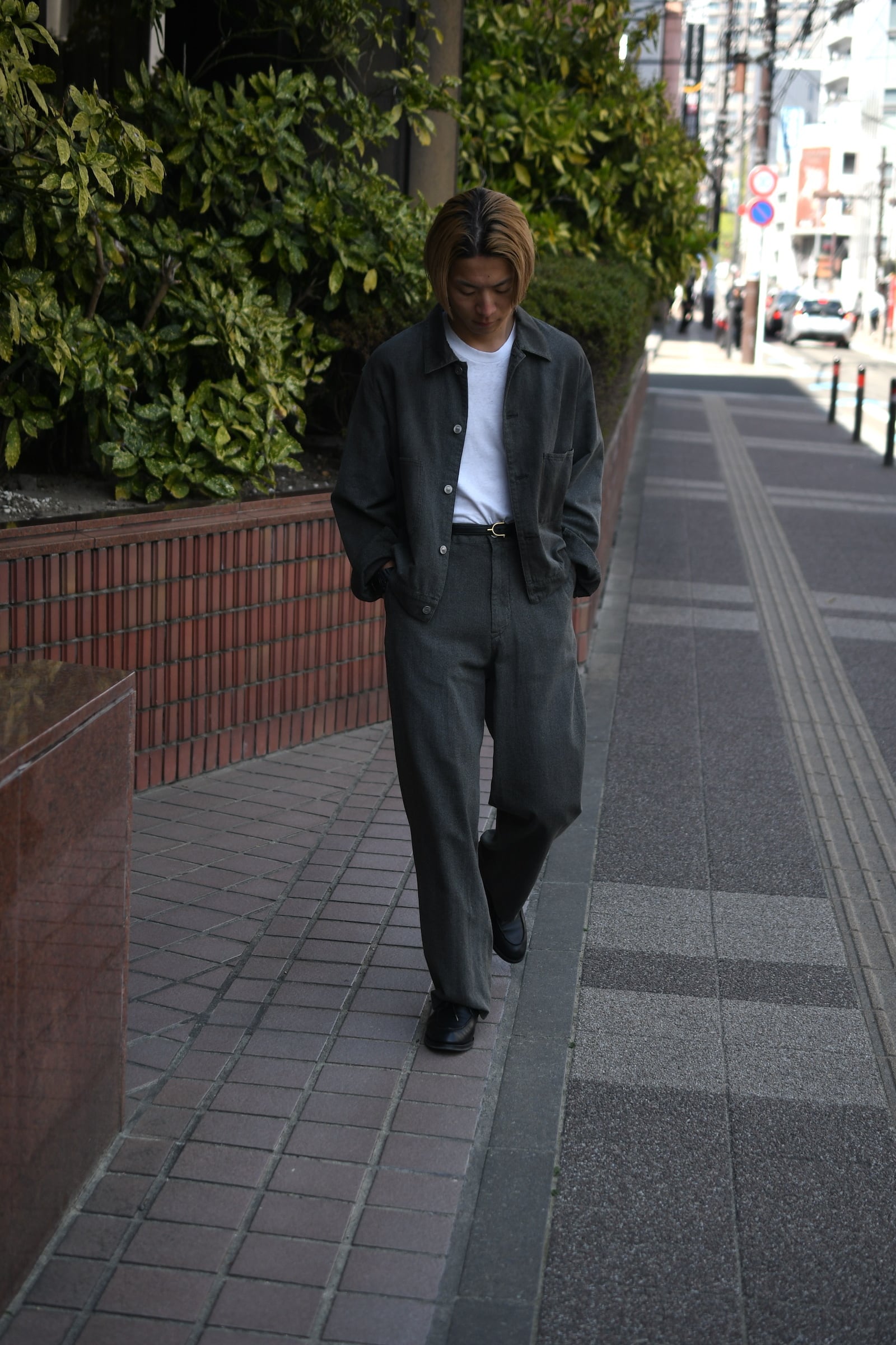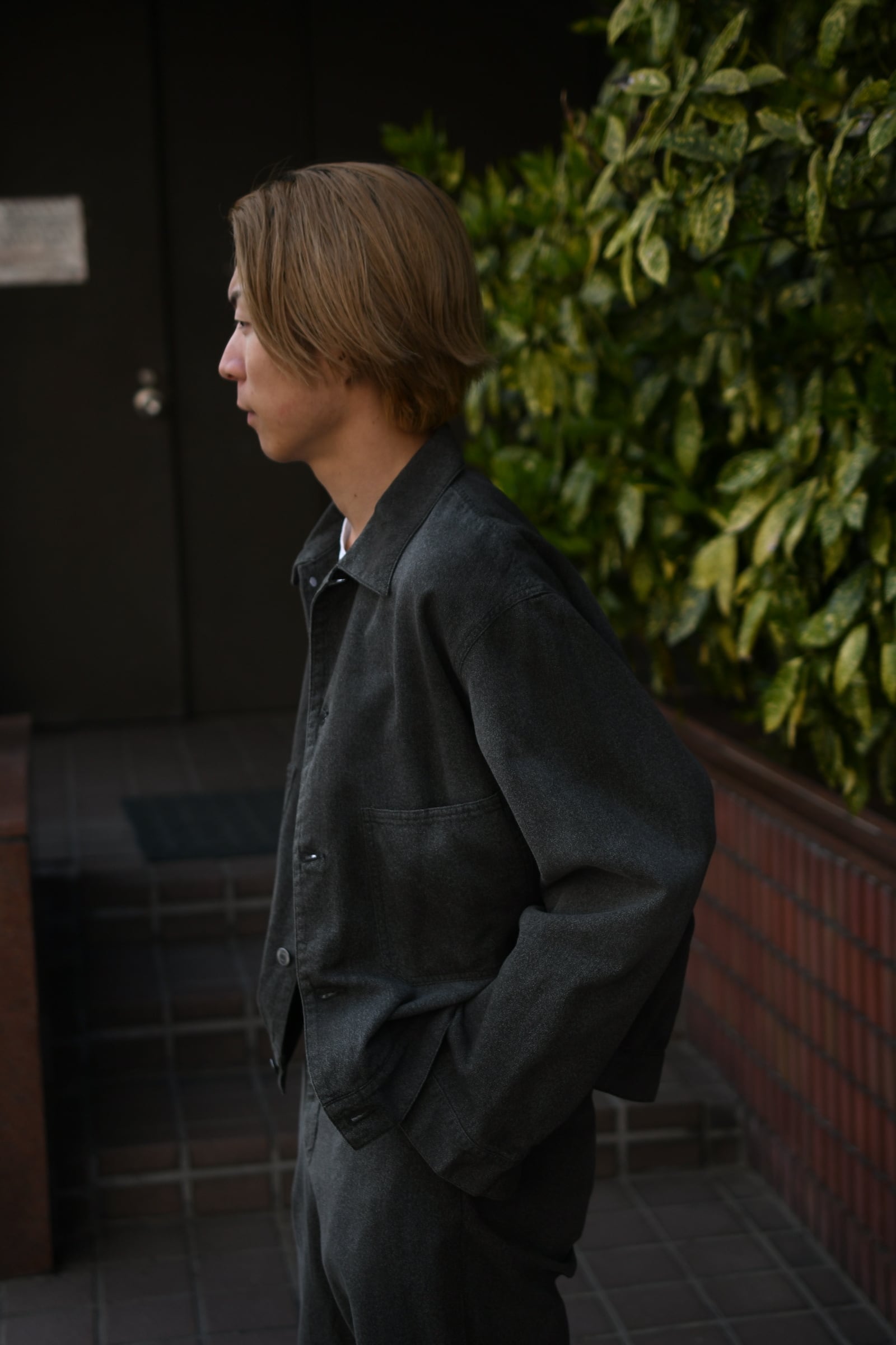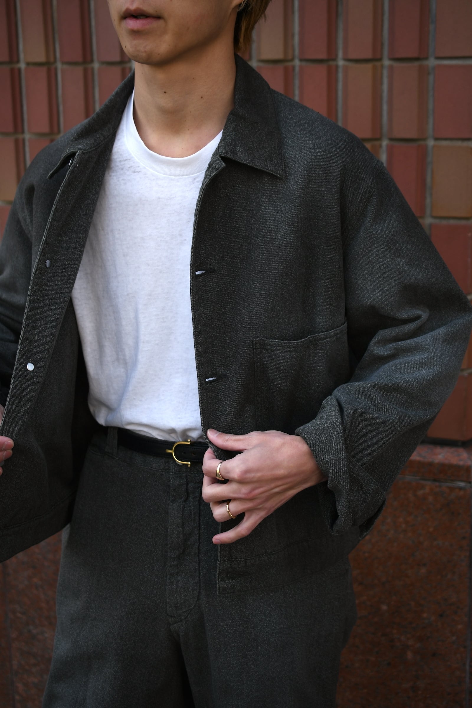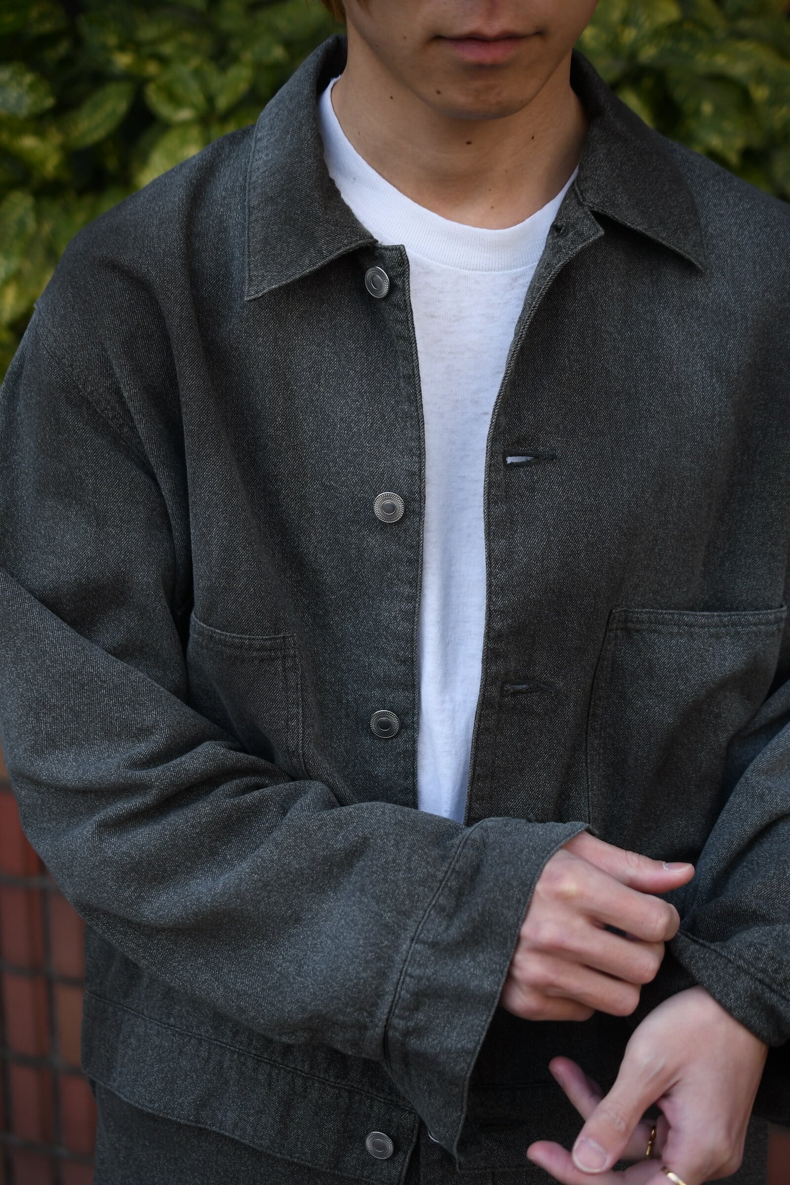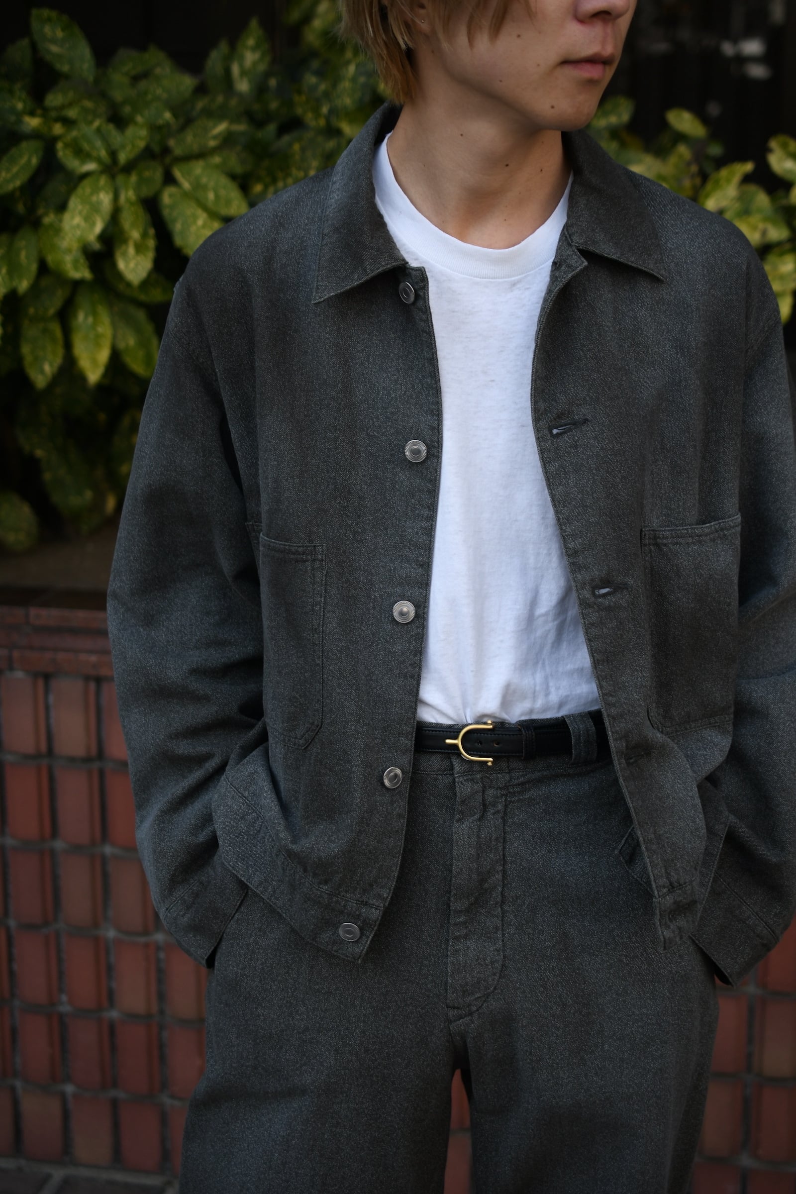 USとEUそれぞれの歴史あるワークテイストが、A.PRESSの解釈を経て1つの洋服となった。デザインは前者をベースにパターンを見直してモダナイズし、表情感は後者を踏襲して織り上げた高密度のシャンブレーギャバジンが役を担う。硫化染めと様々な加工を駆使した生地は、シミ汚れによる絶妙な経年変化を違和感なく表現した豊かな風合いが大きな魅力を誇る。夏でも気負いせず身に纏えるであろう軽やかな厚みを活かしてジャケットは無双で仕立てられており、この気温差に順応するポテンシャルは春〜秋まで間違いなく頼りになるだろう。是非ともこの良い塩梅の男らしさを様々なドレス的要素と掛け合わせながら、ご自身流のスタイルを季節毎に堪能して頂きたい。