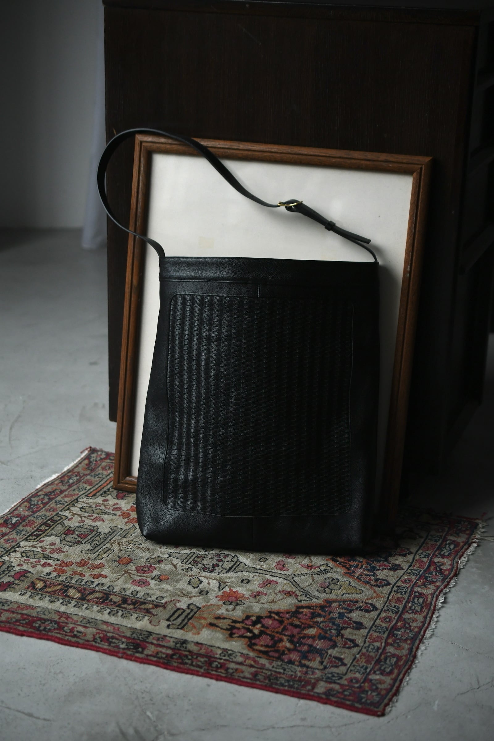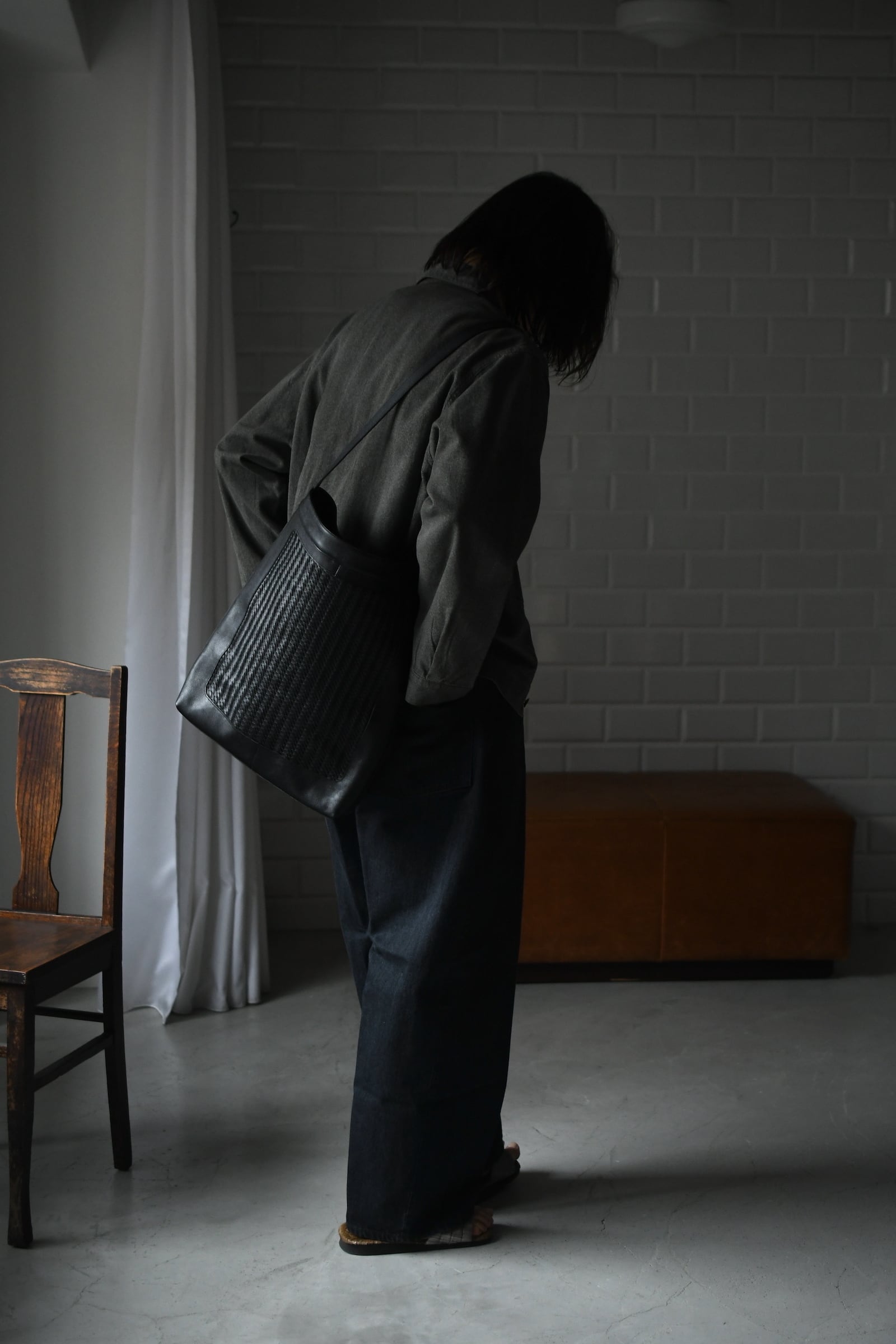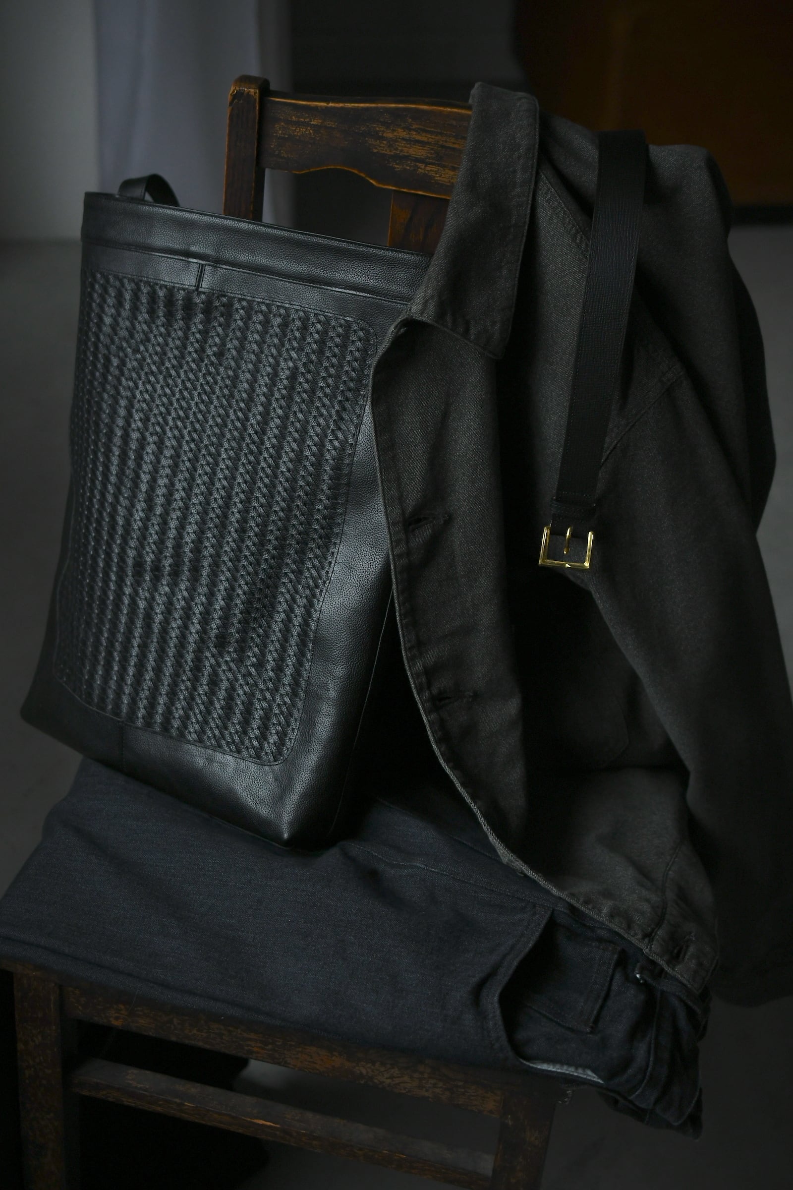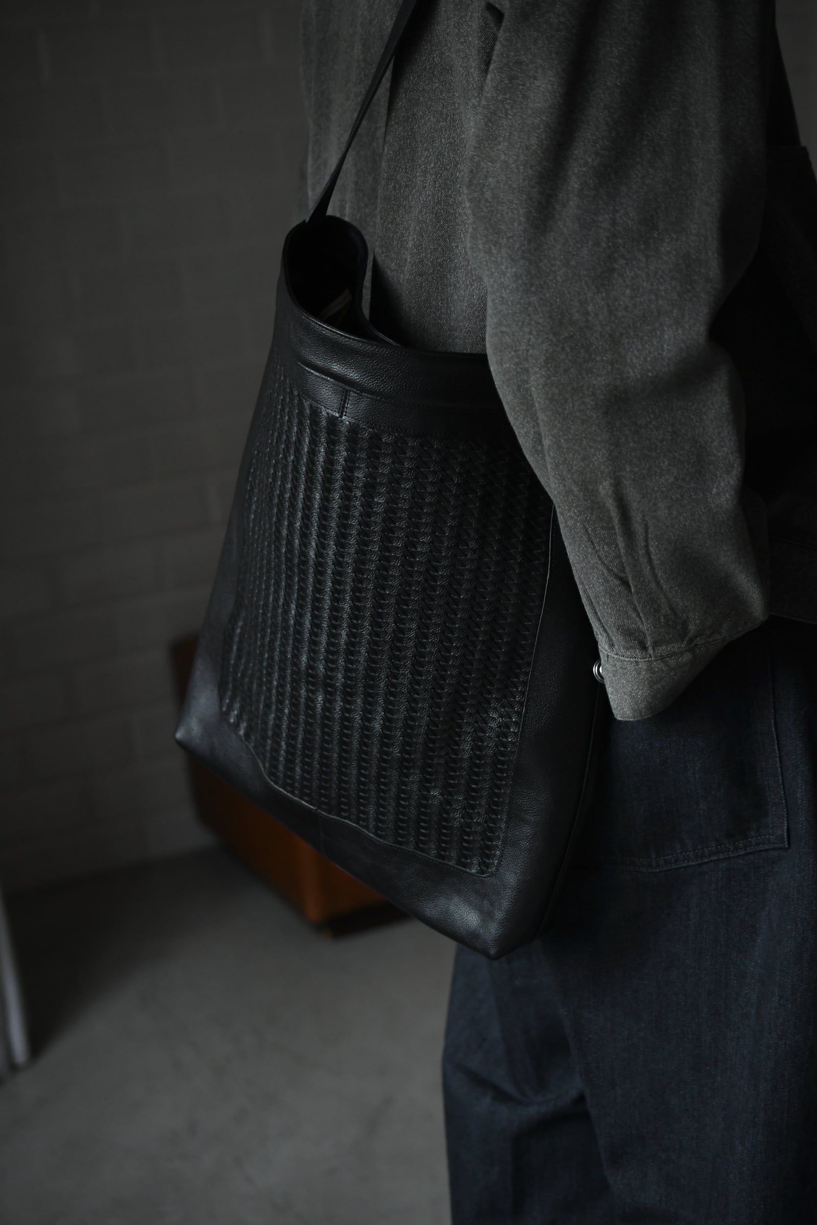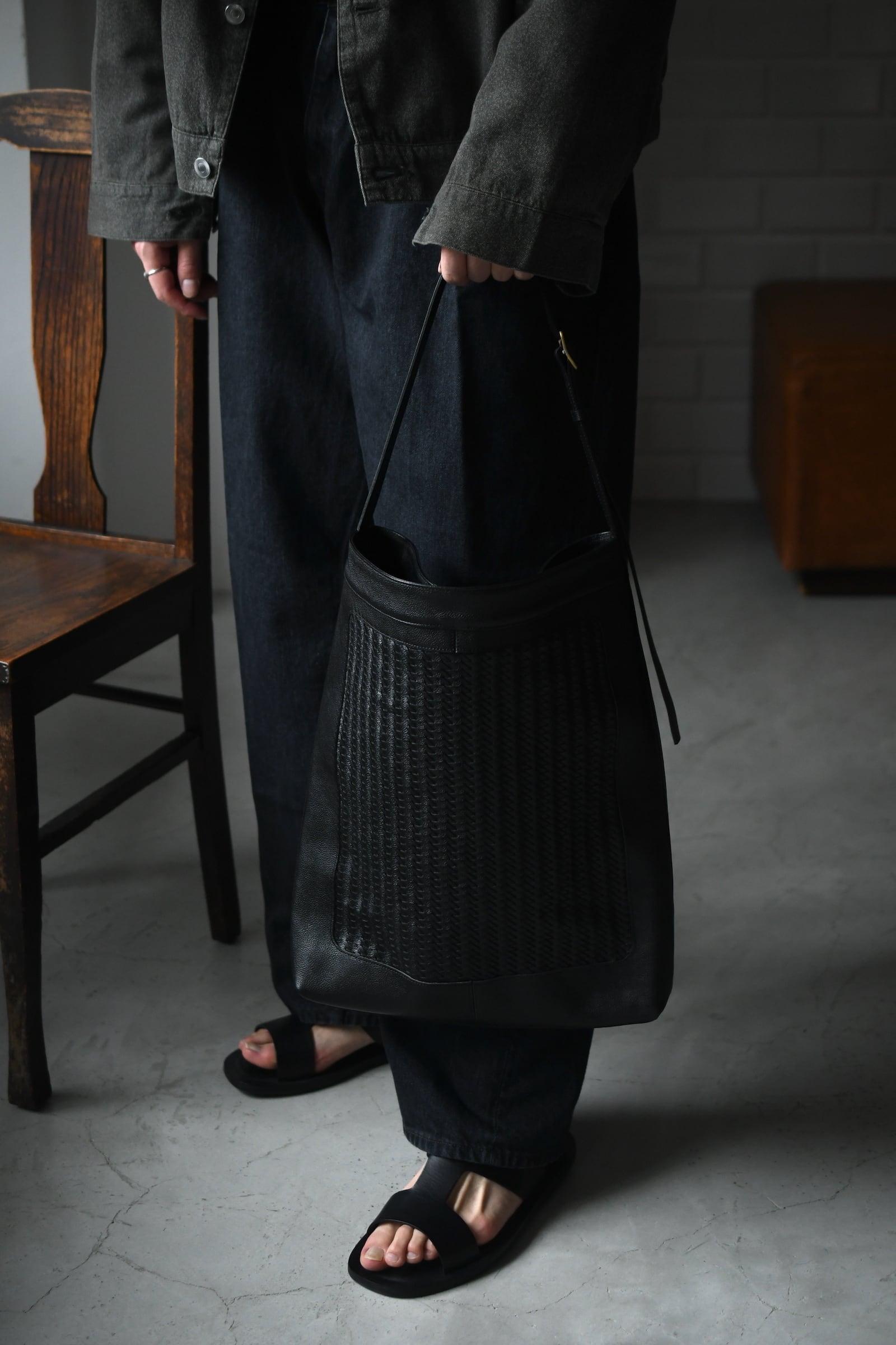 美しい細やかなシボの表情感と柔らかさを誇るイタリアンメイドのバケットレザー”Siena”をメインとして、中央に革のメッシュを嵌め込んだforme流のトートバック。驚く事にメッシュ部分は職人の手編みであり、立体感を与える特殊な編み方を駆使しながら時間を掛けてこの規模を編み上げているのだそう。そういった静かな狂気と強い拘りが詰まった異なるエイジングは、日々の中で魅力を増しながら大きな愛着へと繋がっていく筈だ。そして高さを変えながら設けられた2箇所のセパレートポケットは初めてウルトラスエードを採用し、全体の分量感に反して重さを感じづらいという確かな気遣いが感じられる。ストラップの長さを変える事で、肩掛け/斜め掛け/手持ちと用途に応じて使い分けられる事も嬉しい。多方面に注がれた生活に馴染むバランスの良さは高頻度で手に取る理由へと繋がり、ビジネスとプライベートの両者に於いて間違いなく心を満たしてくれるだろう。今季限りというリミテッドの付加価値も含め、是非とも鞄選びの候補に入れて頂ければ幸いです。